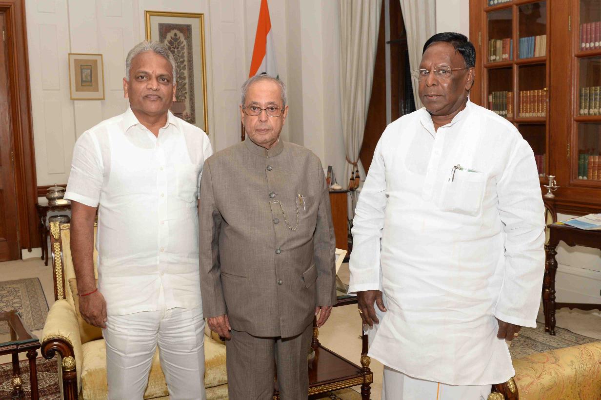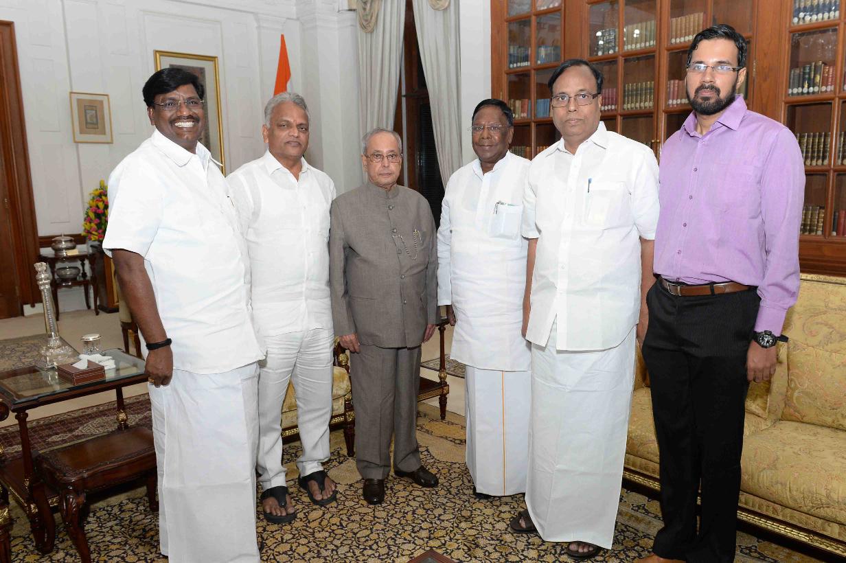 | Caption: | The President of India, Shri Pranab Mukherjee meeting with Shri V. Narayanasamy, Chief Minister of Puducherry alongwith Shri Vishwanathan, Ex-MP from Tamil Nadu and Shri Gopanna, Spokesperson, Tamil Nadu Pradesh Congress Committee, at Rashtrapati Bhavan on June 09, 2017. |