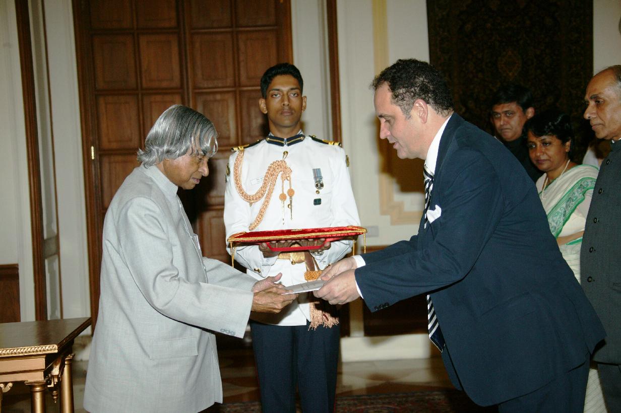 | Caption: | The Ambassador-Designate of Spain to India, HE Mr Lon de la Riva Guzman de Frutos presenting his credentials to the President of India, Dr A P J Abdul Kalam at the Yellow Drawing Room of Rashtrapati Bhavan in New Delhi on July 19, 2007 |