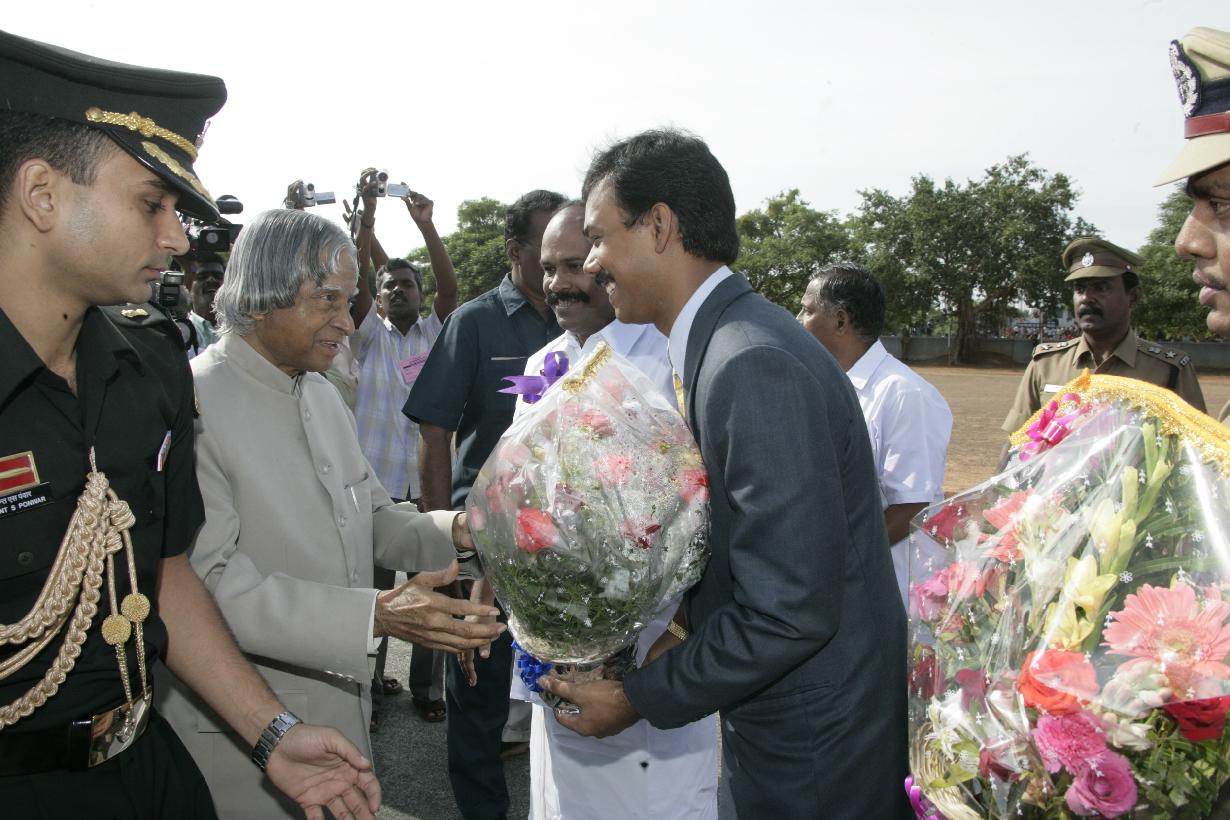 | Caption: | The President of India, Dr A P J Abdul Kalam being welcomed at Karaikkudi University Helipad at Sivaganga in Tamil Nadu on Sep 24, 2006 |
