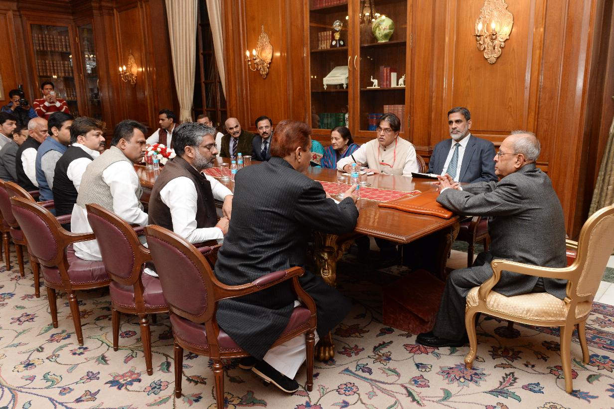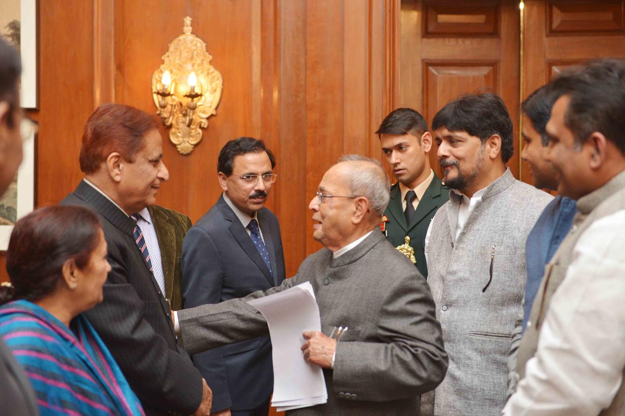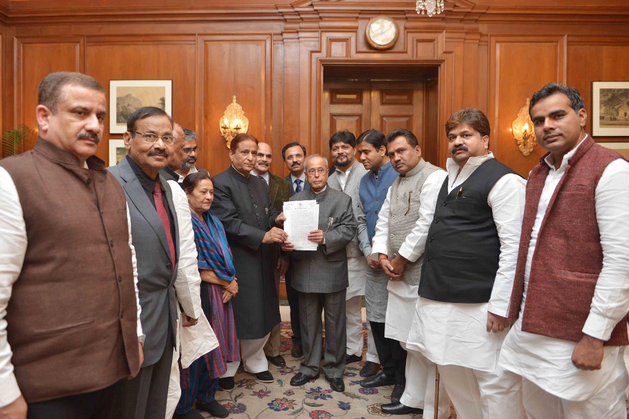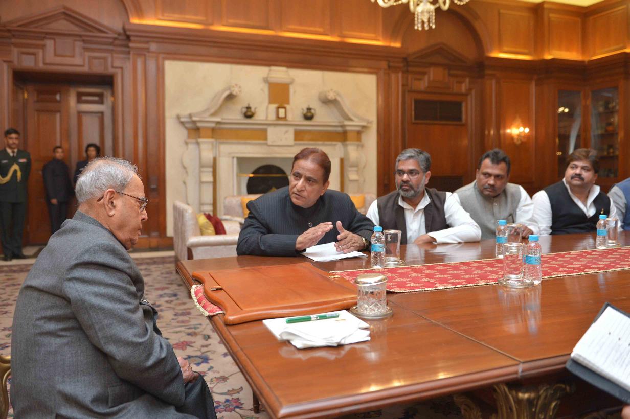 | Caption: | The President of India, Shri Pranab Mukherjee meeting with a delegation of Samajwadi Party MPs, MLAs, MLCs & leaders led by Shri Mohd. Azam Khan, National General Secretary, Samajwadi Party and Minister in Uttar Pradesh Govt., at Rashtrapati Bhavan on November 29, 2016. |