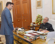 | Caption: | The President of India, Shri Pranab Mukherjee meeting with Lt. Cdr. Rakesh Yadav, former ADC to the President, at Rashtrapati Bhavan on November 19, 2016. |