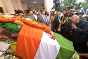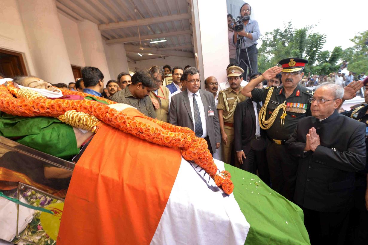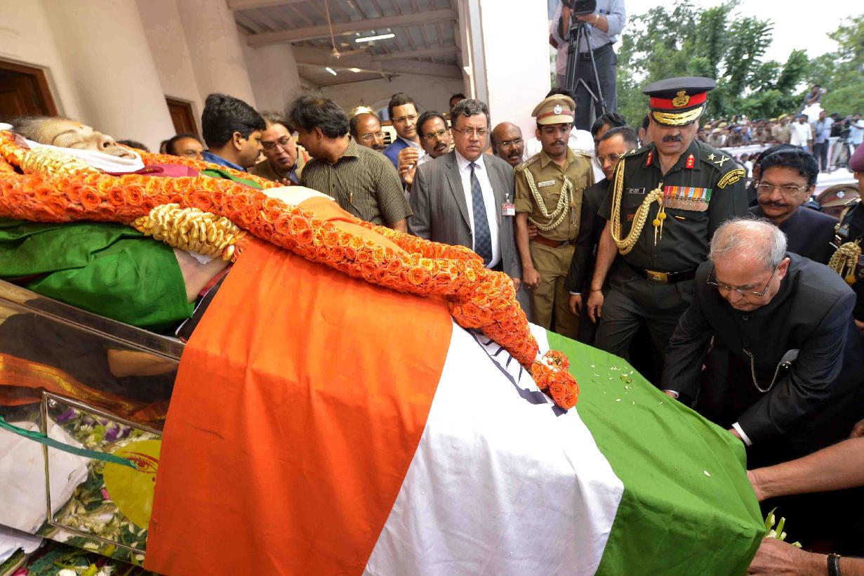 | Caption: | The President of India, Shri Pranab Mukherjee paying homage to the departed soul of Ms. Jayaraman Jayalalithaa, at Rajaji Hall, in Chennai on December 06, 2016. |