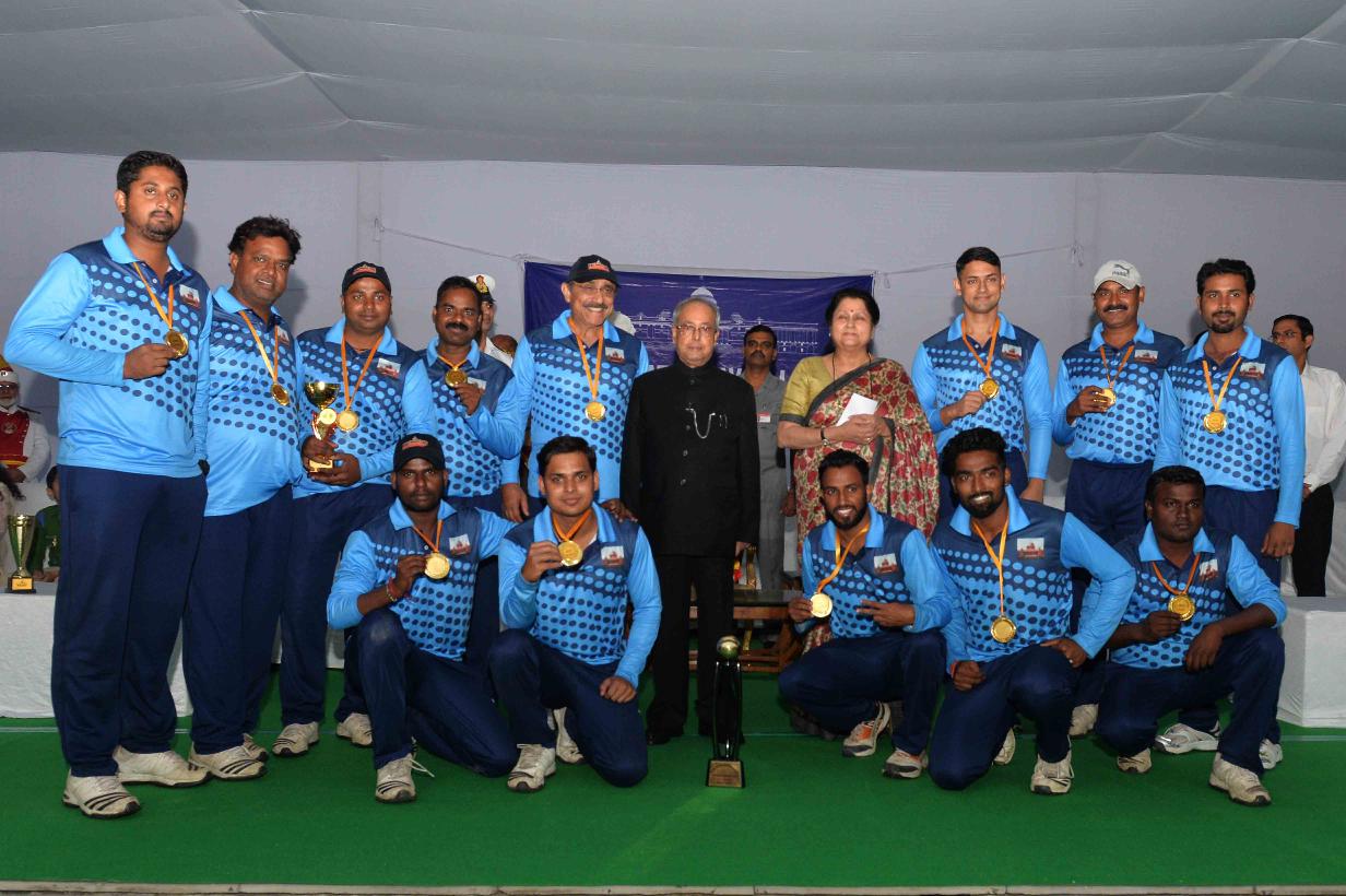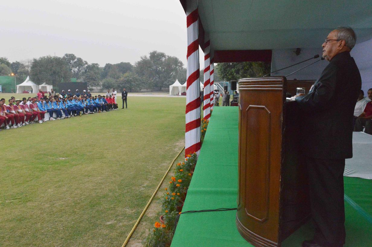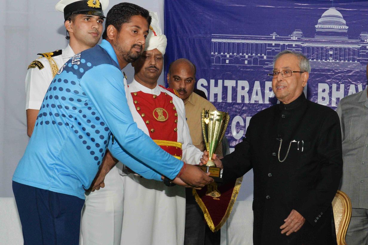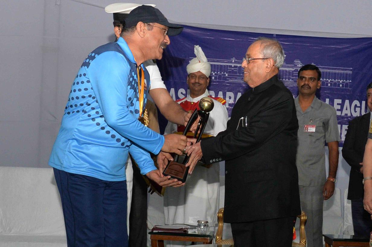 | Caption: | The President of India, Shri Pranab Mukherjee giving away the Championship Trophy of the RBL T20 tournament to the captain of the wining team Dr. Thomas Mathew and prizes to the participants of the Rashtrapati Bhavan League T-20 Cricket Tournament-2016, at Dr. Rajendra Prasad Sarvodaya Vidyalaya Sports Ground, President's Estate on November 13, 2016. |