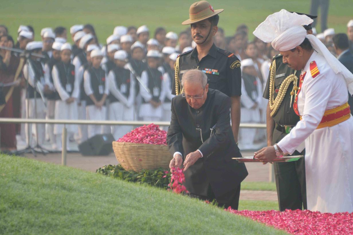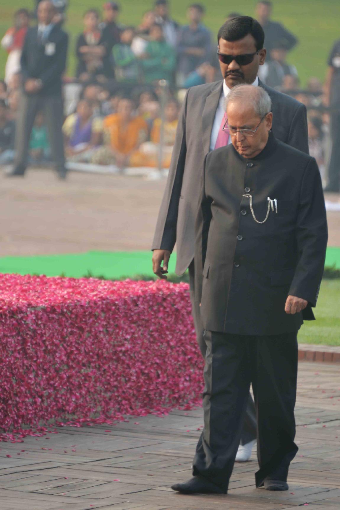 | Caption: | The President of India, Shri Pranab Mukherjee paying floral tributes at the samadhi of Late Pandit Jawaharlal Nehru to commemorate his Birth Anniversary, at Shanti Van, in Delhi on November 14, 2016. |