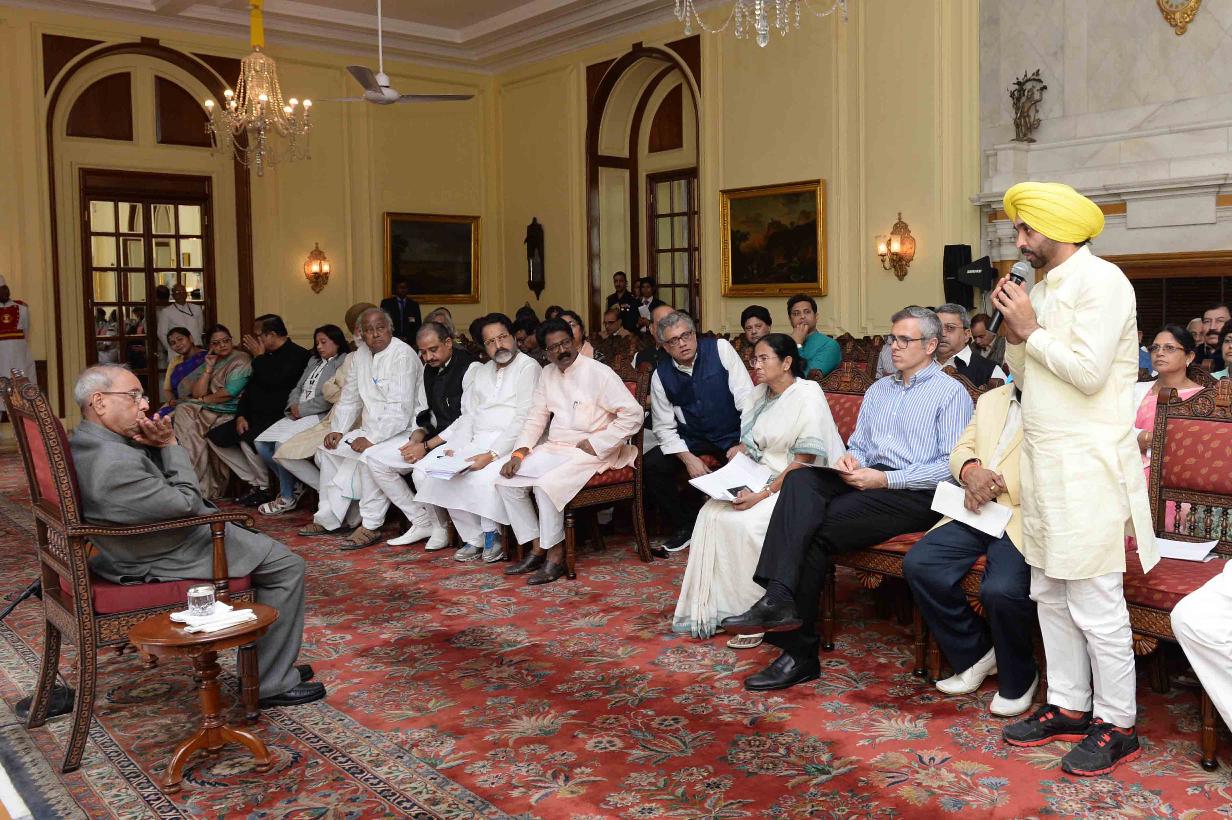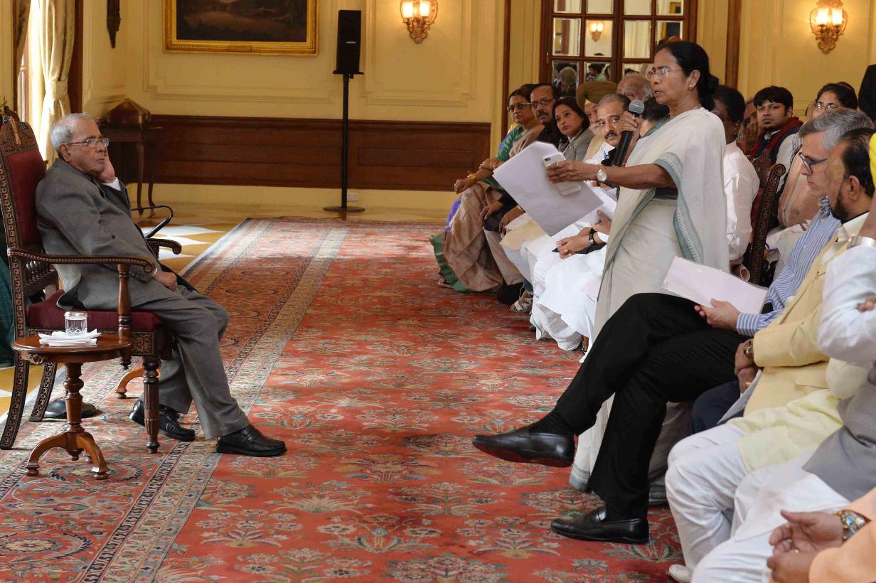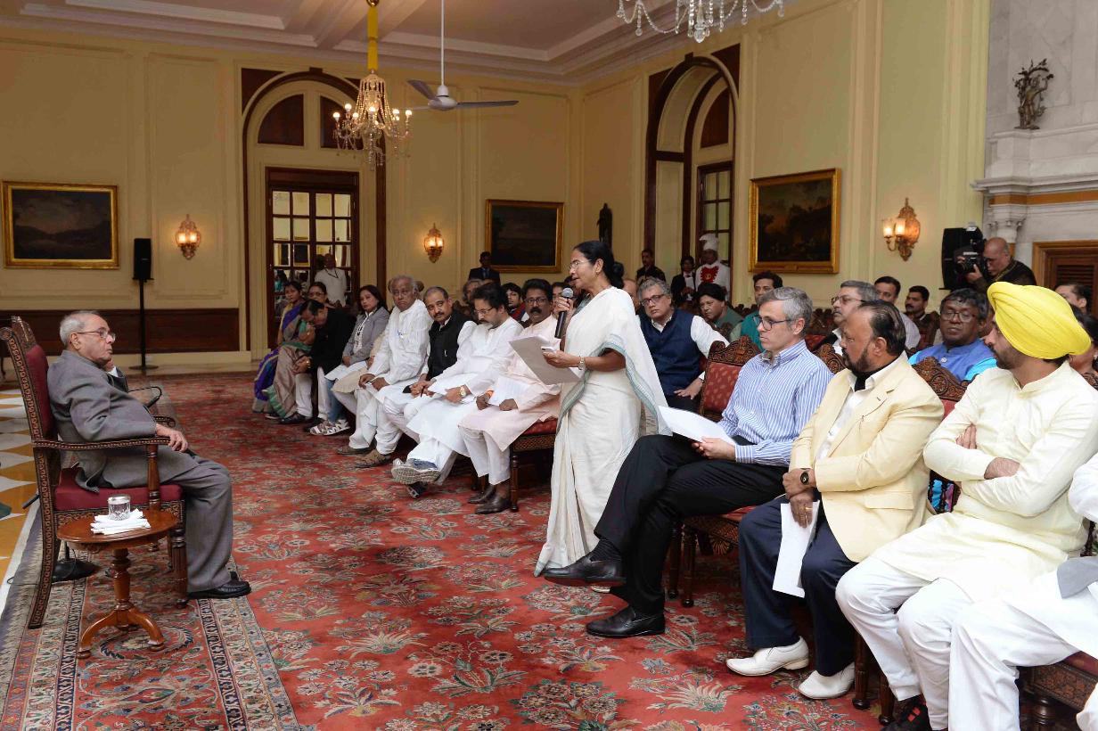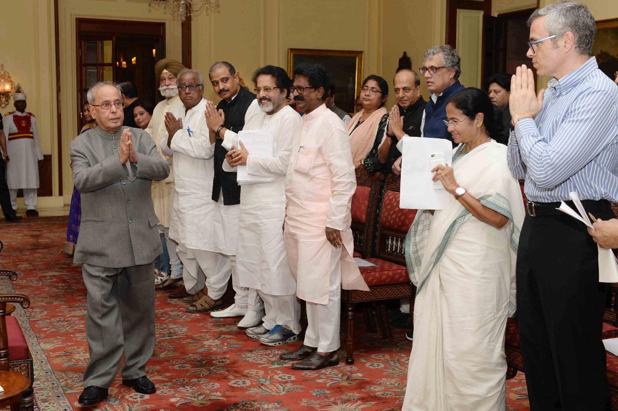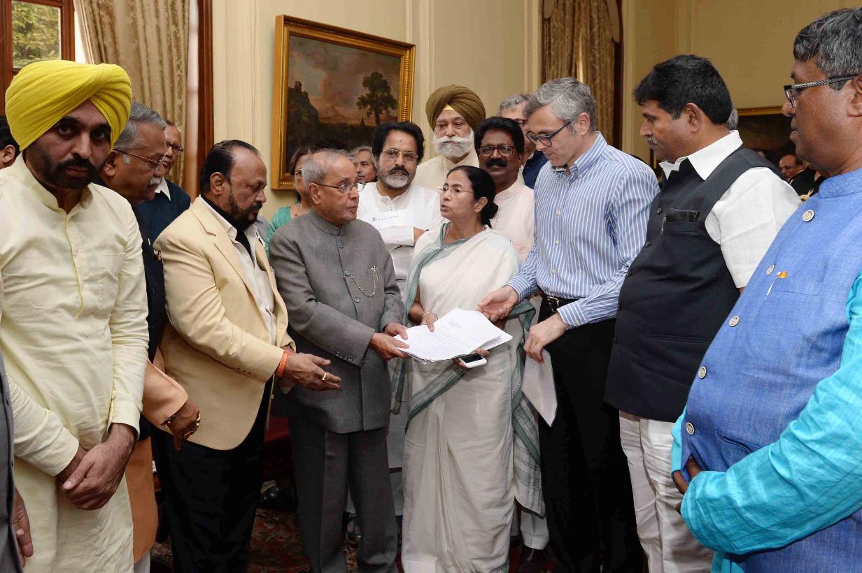 | Caption: | The President of India, Shri Pranab Mukherjee meeting with a delegation of Member of Parliament (Lok Sabha & Rajya Sabha) and leaders from All India Trinamool Congress, Shiv Sena, Patel Navanirman Sena and Aam Aadmi Party led by Ms. Mamata Banerjee, Chief Minister of West Bengal & Shri Omar Abdullah, former Chief Minister of Jammu & Kashmir, at Rashtrapati Bhavan on November 16, 2016. |
