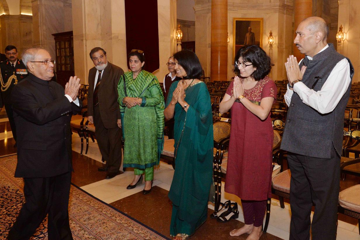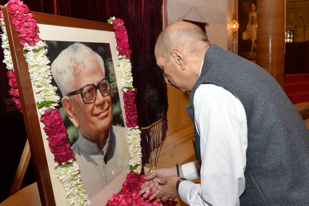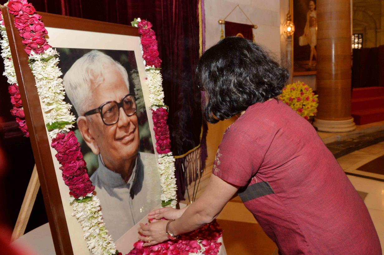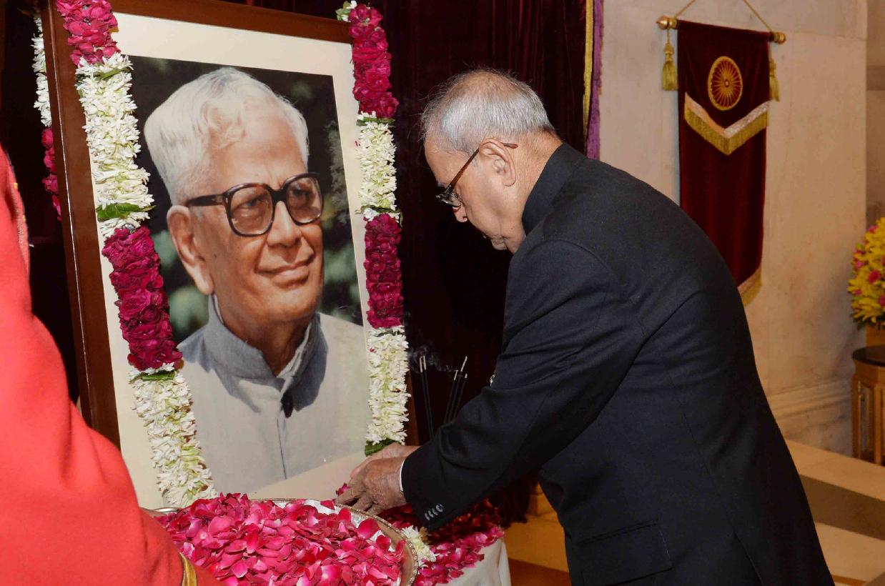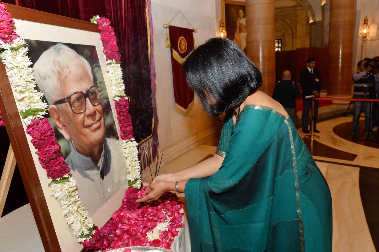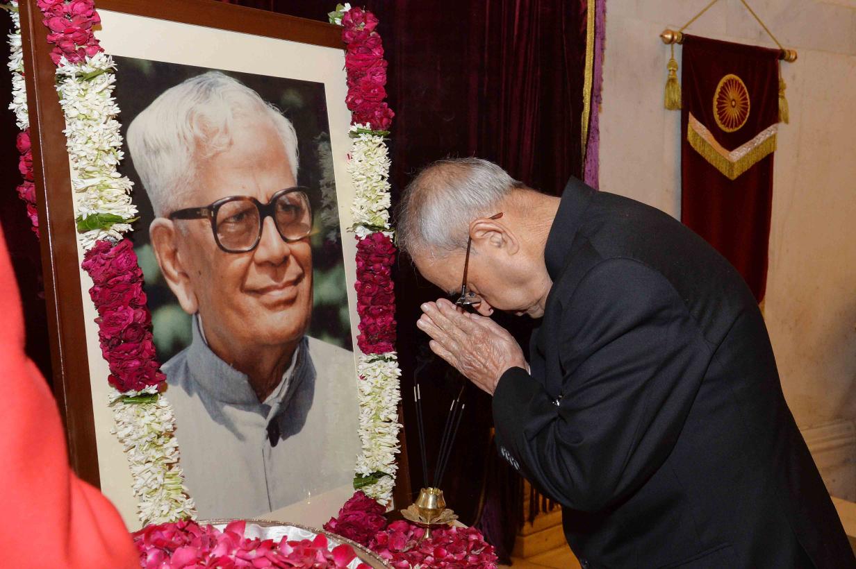 | Caption: | The President of India, Shri Pranab Mukherjee paying floral tributes to Shri R. Venkataraman, former President of India on the occasion of his Birth Anniversary, at Rashtrapati Bhavan on December 04, 2016. the family member of Shri R. Venkataraman also paid tributes to him. |