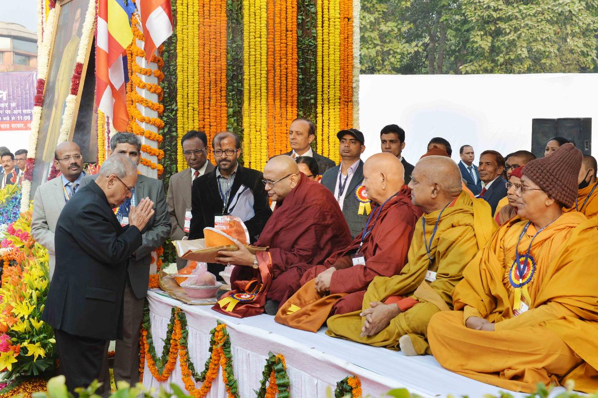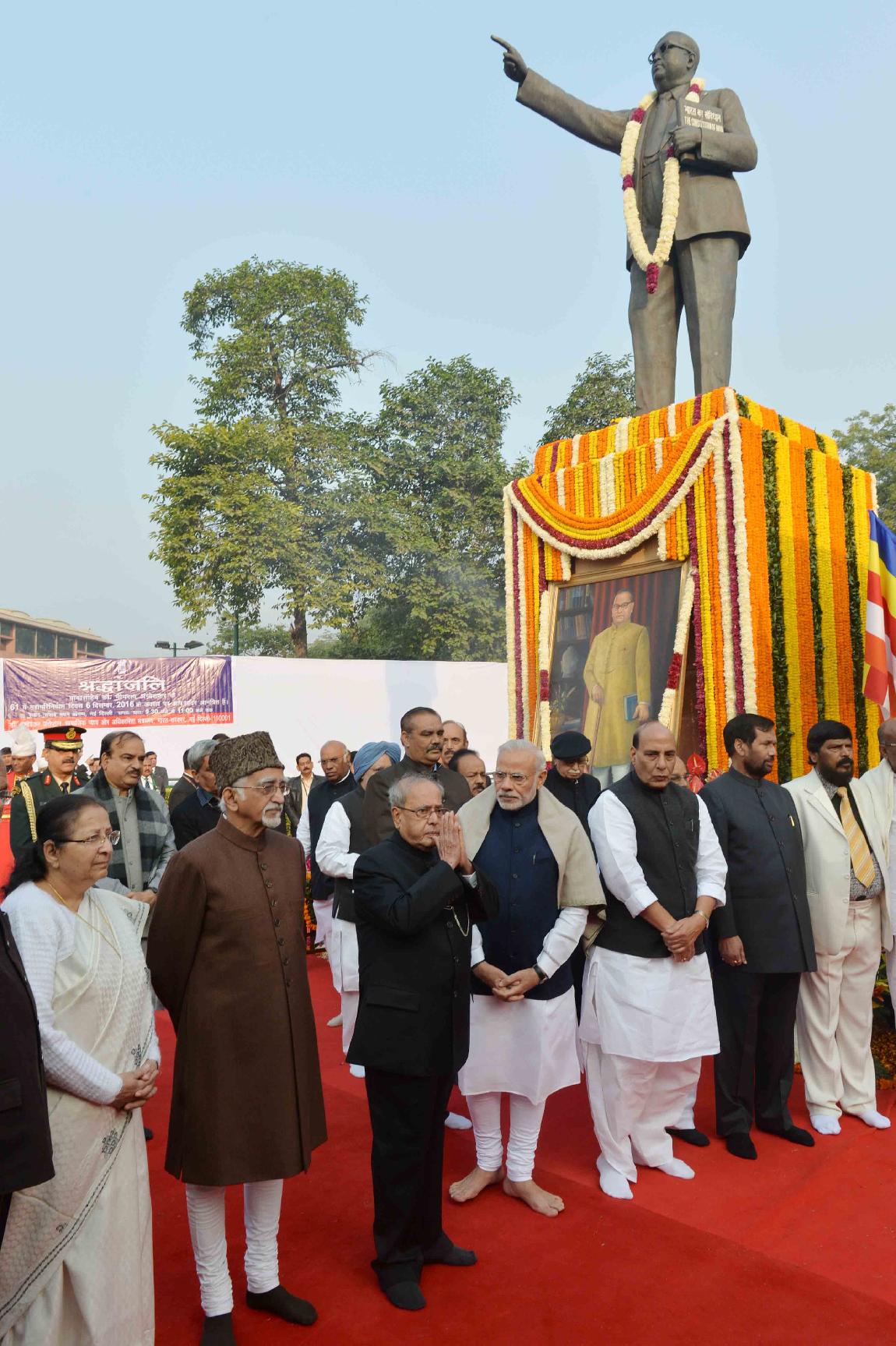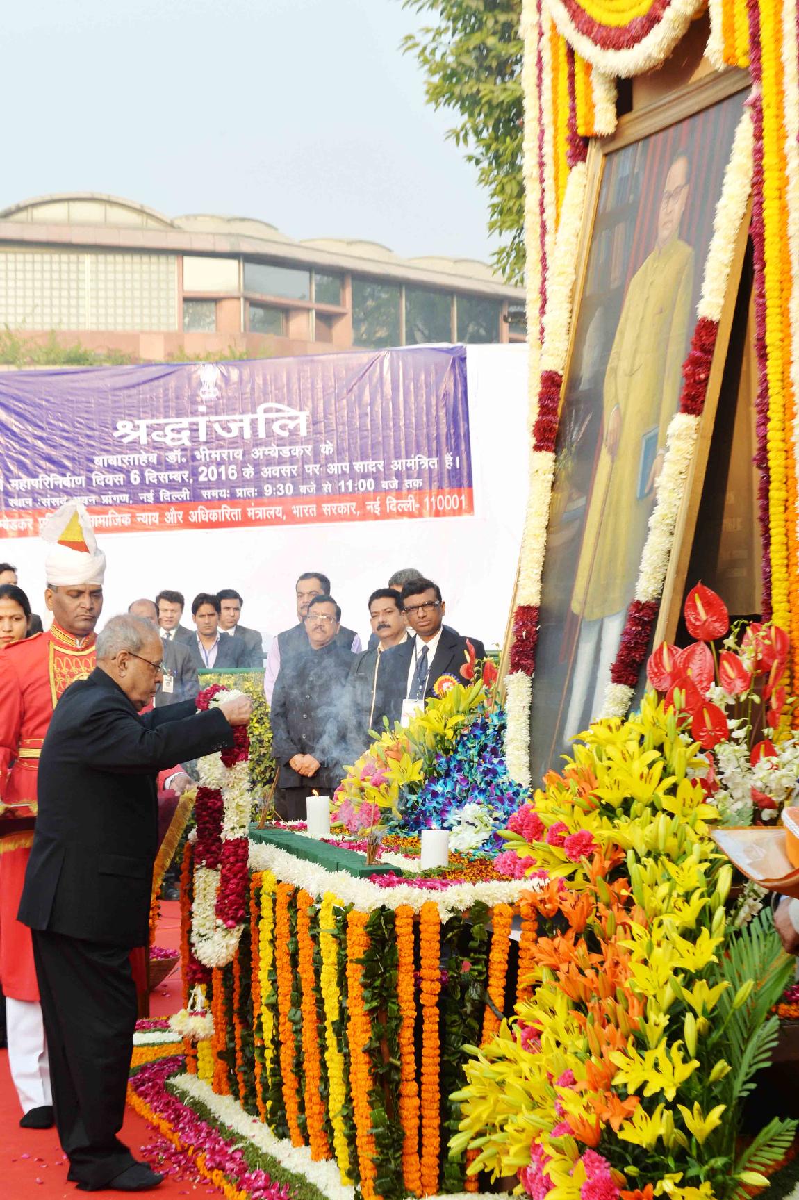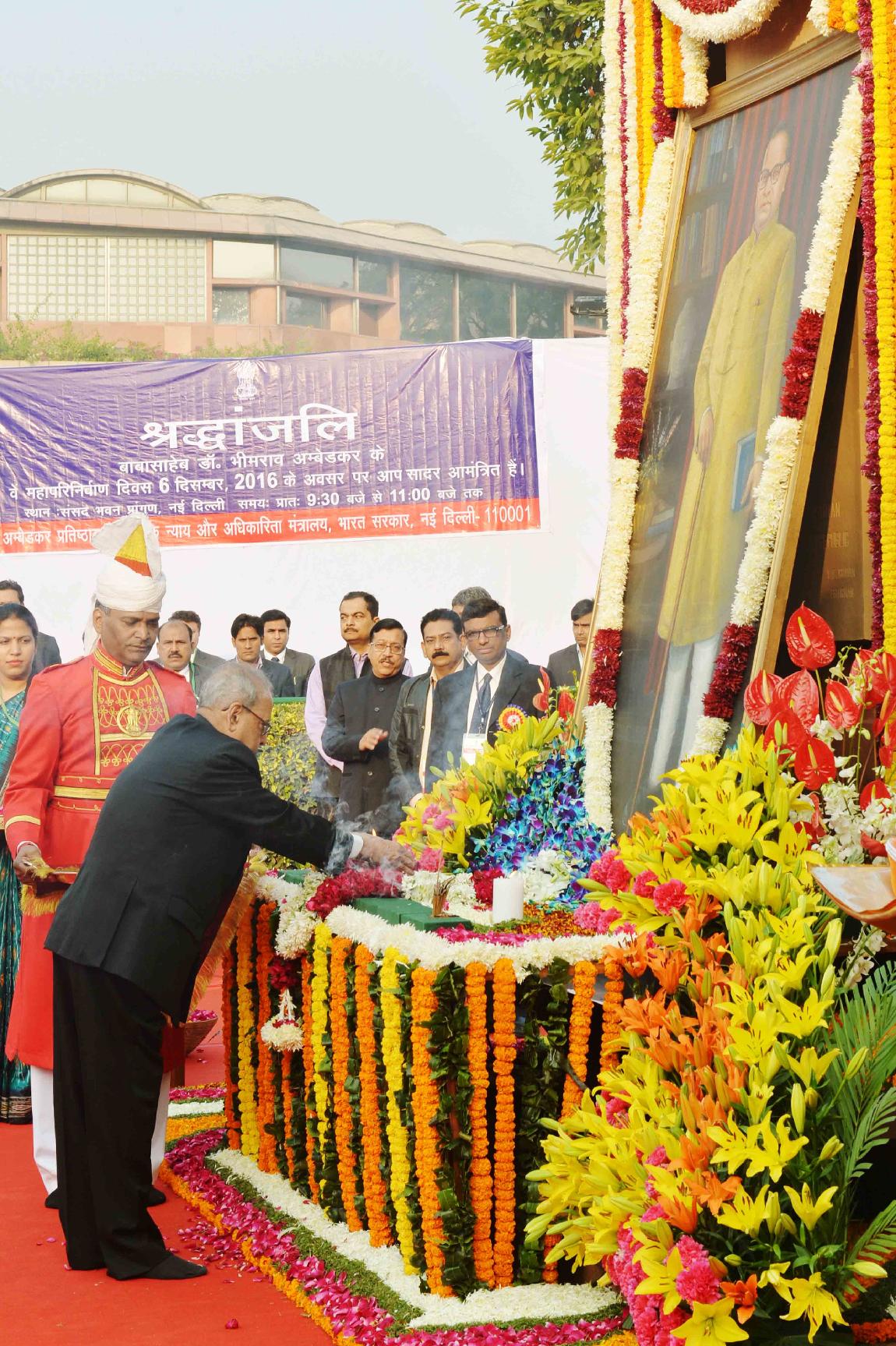 | Caption: | The President of India, Shri Pranab Mukherjee paying floral tributes at the statue of Babasaheb Dr. B.R. Ambedkar on the occasion of his Mahaparinirvan Divas, at Parliament House Lawn, in New Delhi on December 06, 2016. |