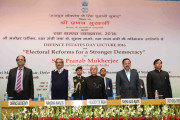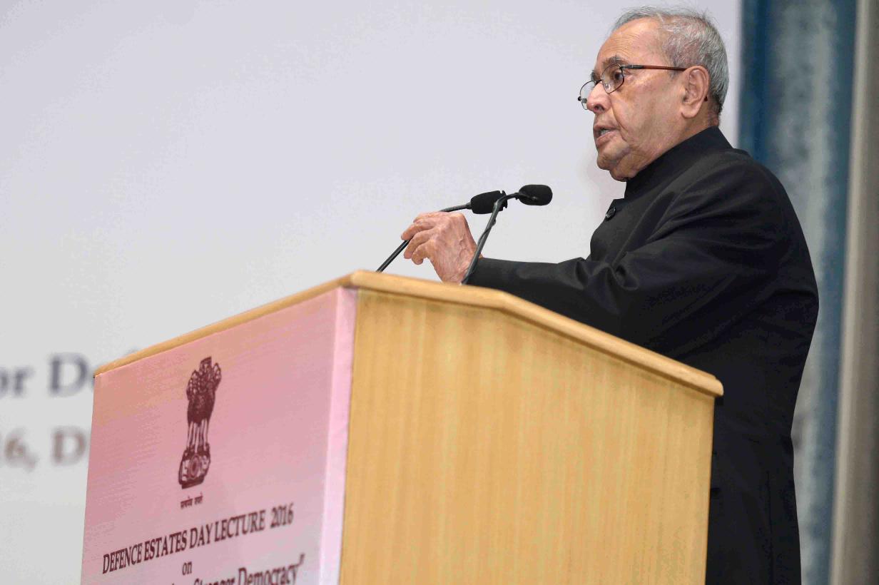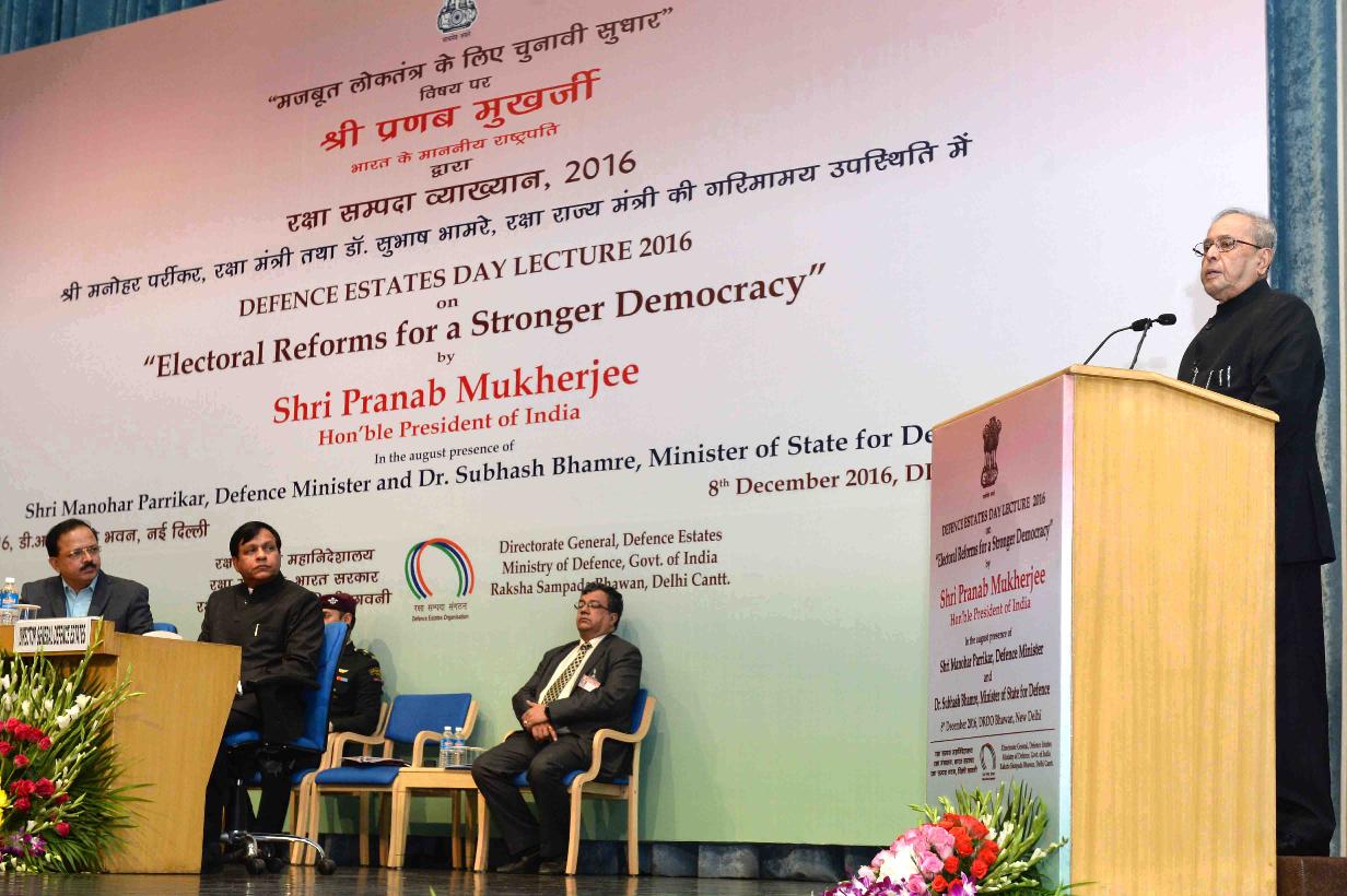 | Caption: | The President of India, Shri Pranab Mukherjee delivering the fourth Defence Estates Day Lecture on the topic of "Electoral Reforms for Stronger Democracy", at DRDO Bhawan, in New Delhi on December 08, 2016. |