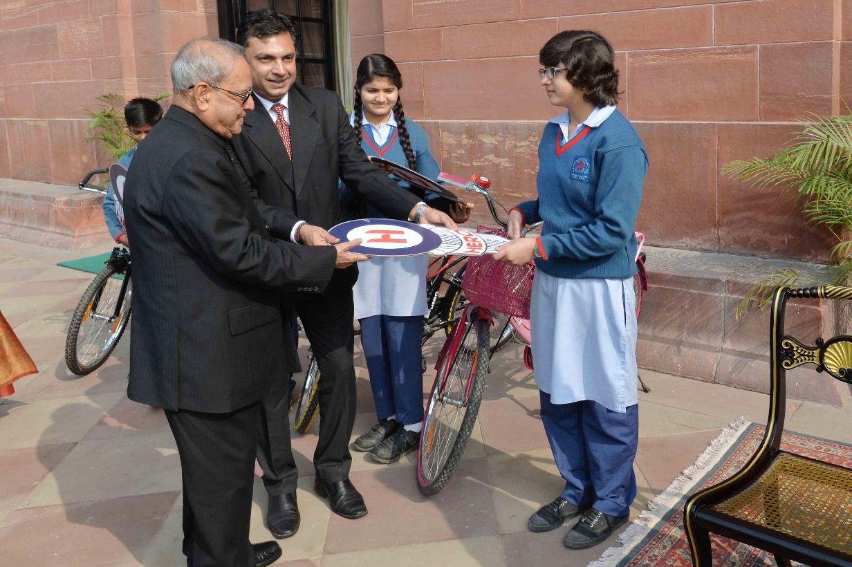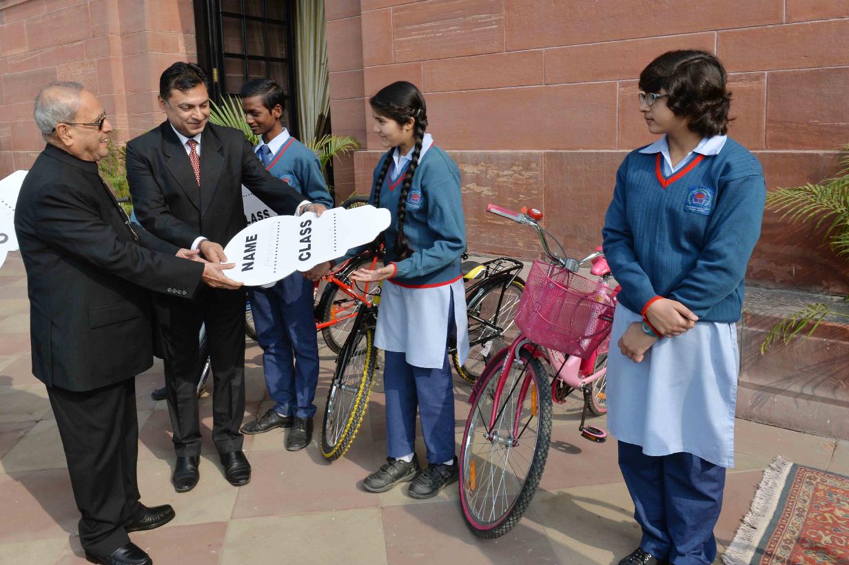 | Caption: | The President of India, Shri Pranab Mukherjee handing over the keys of bi-cycles to the meritorious students of Dr. Rajendra Prasad Sarvodaya Vidyalaya, President's Estate, at Rashtrapati Bhavan on December 10, 2016. |