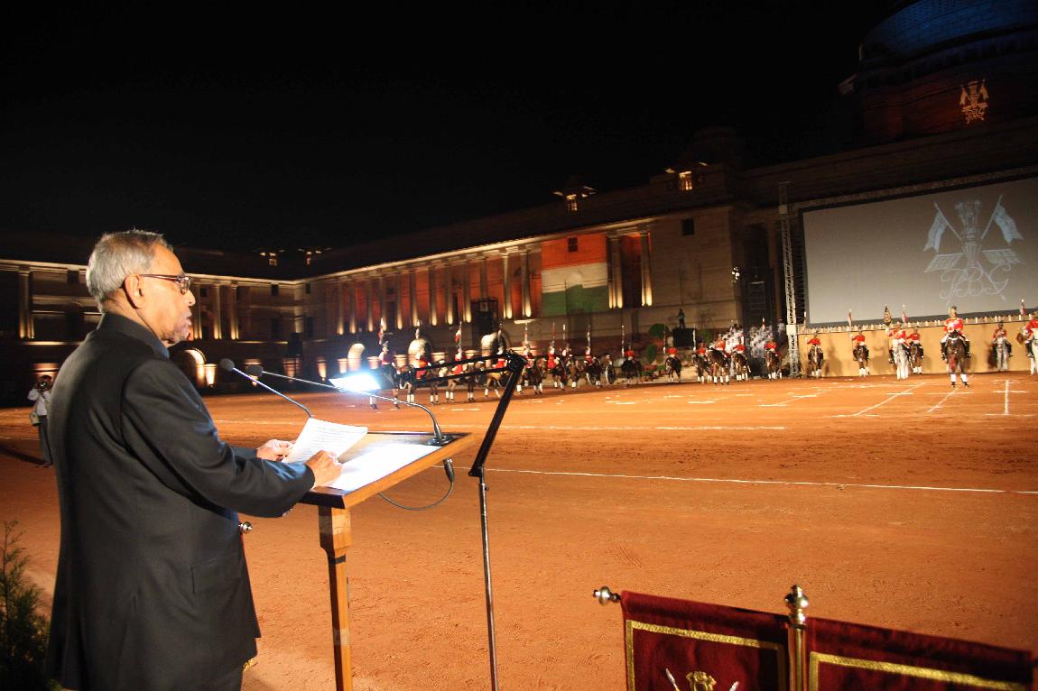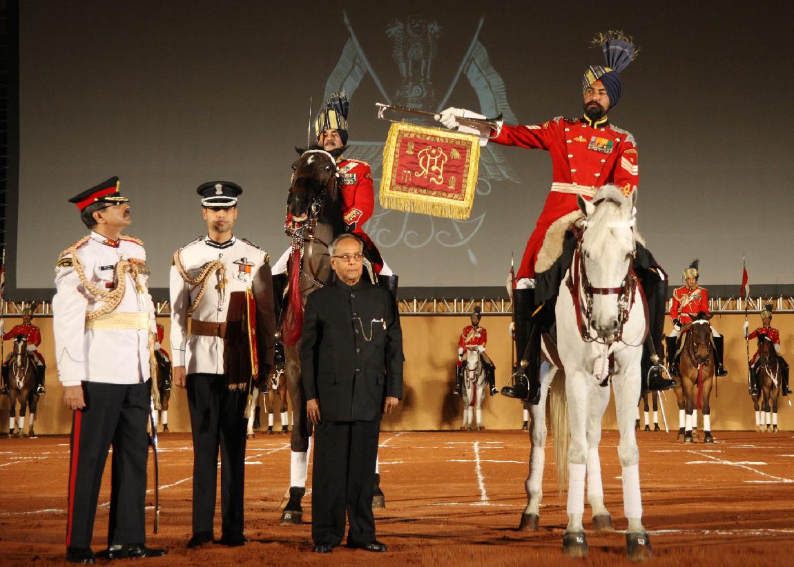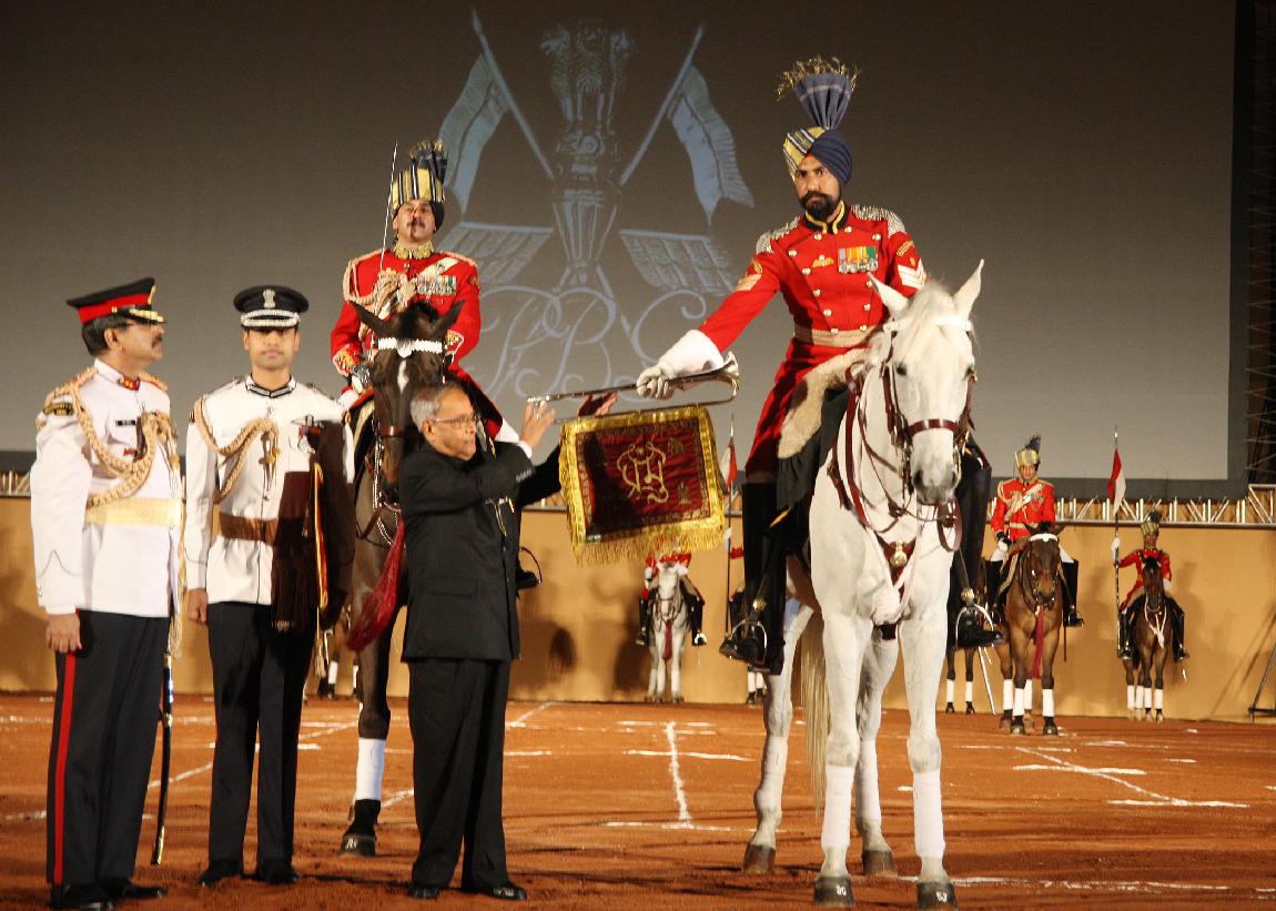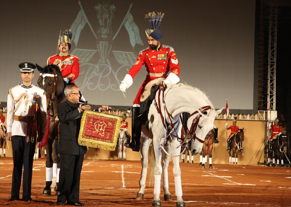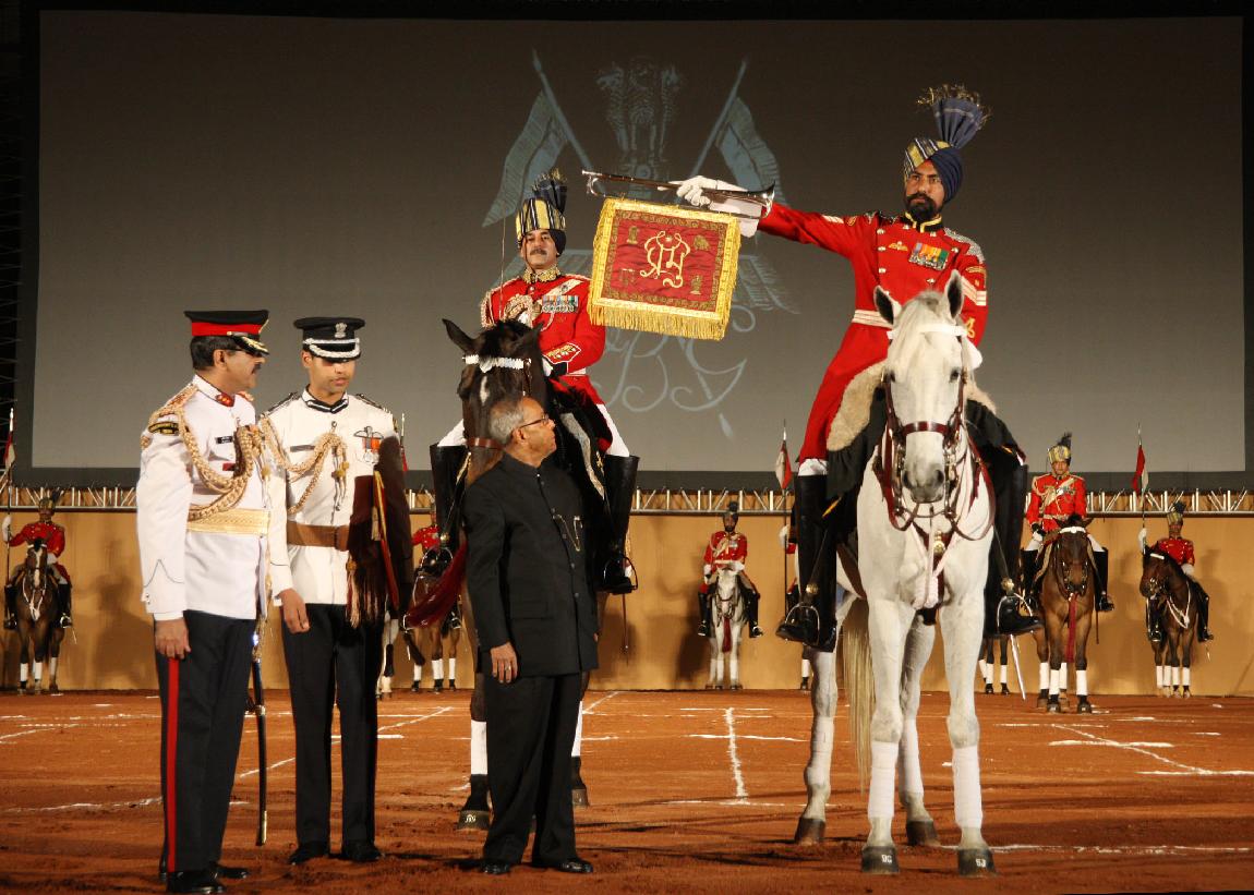 | Caption: | The President of India, Shri Pranab Mukherjee Presenting of Silver Trumpet & Trumpet Banner of President's Bodyguard on March 30, 2013 |