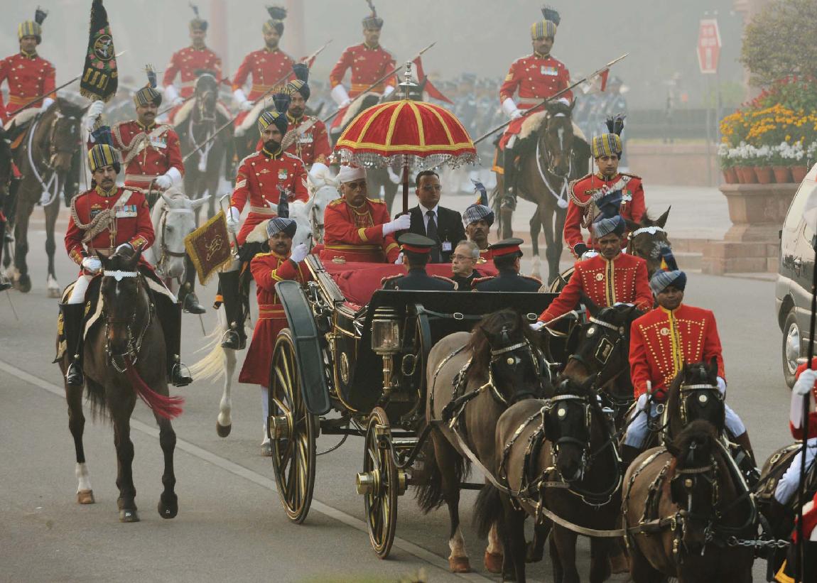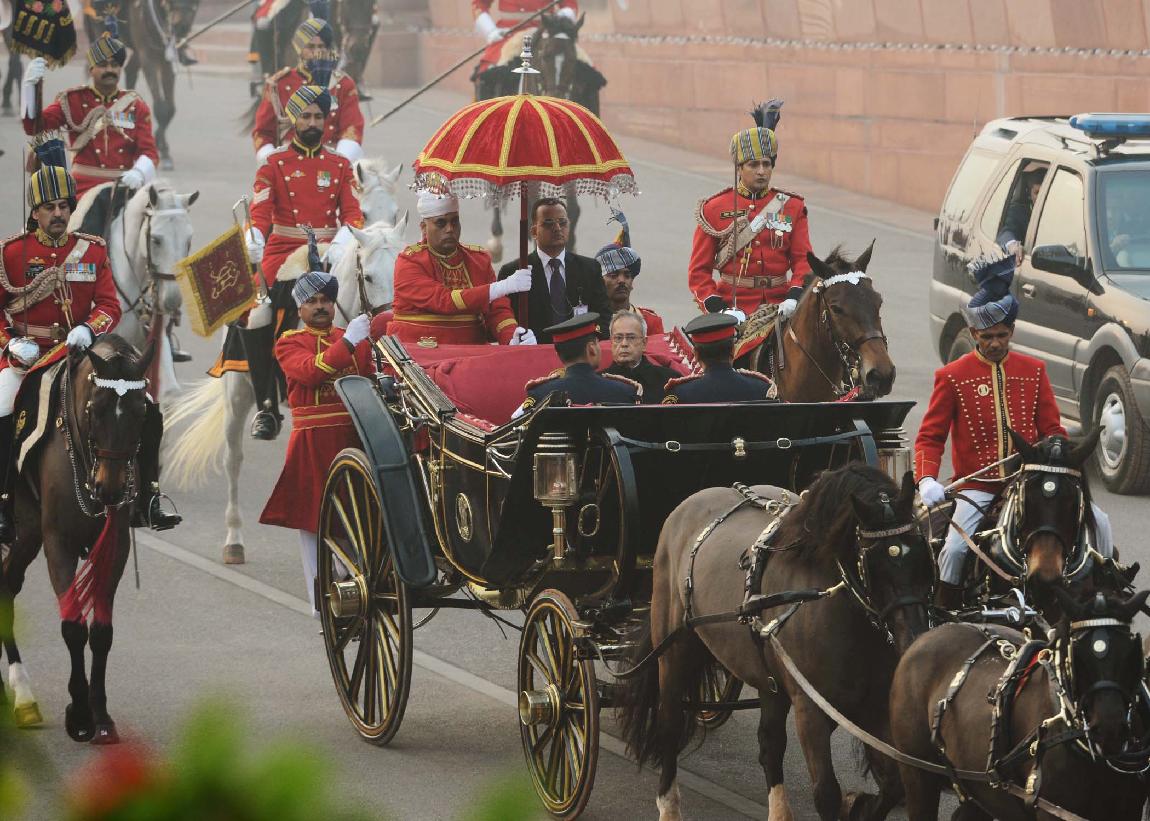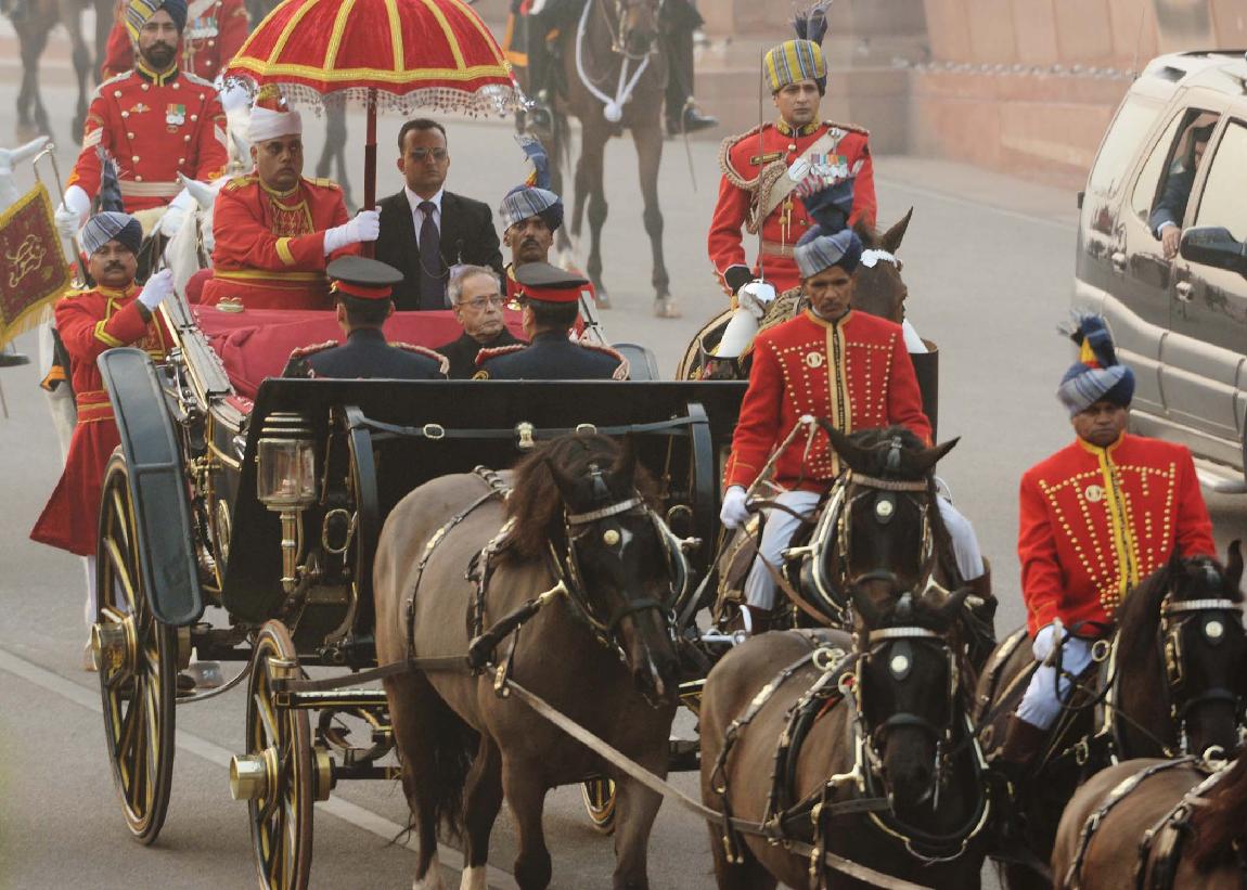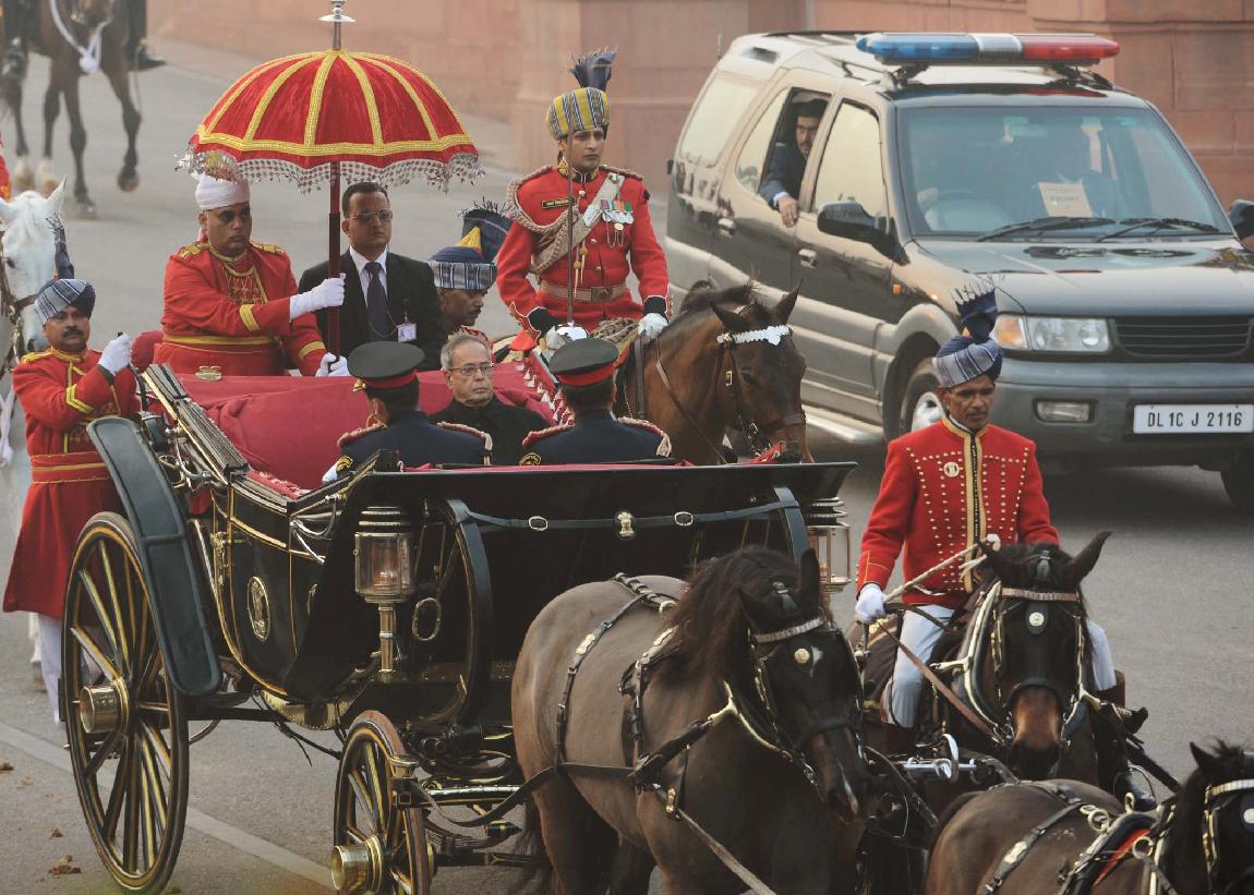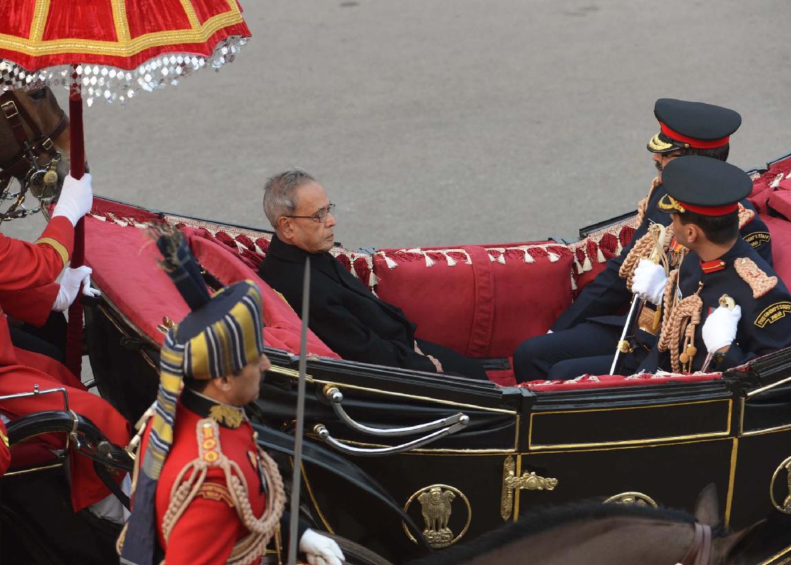 | Caption: | The President of India, Shri Pranab Mukherjee at the Forecourt of Rashtrapati Bhavan before departure for attending the Beating Retreat Function at Vijay Chowk in New Delhi on Jan 29, 2014 |