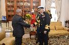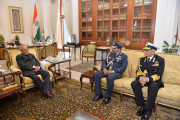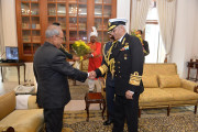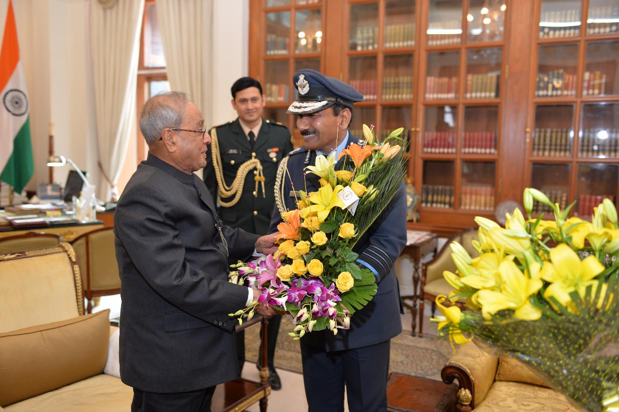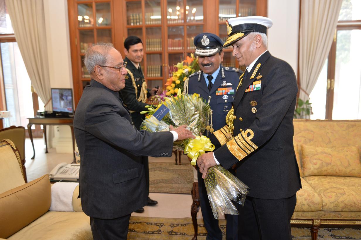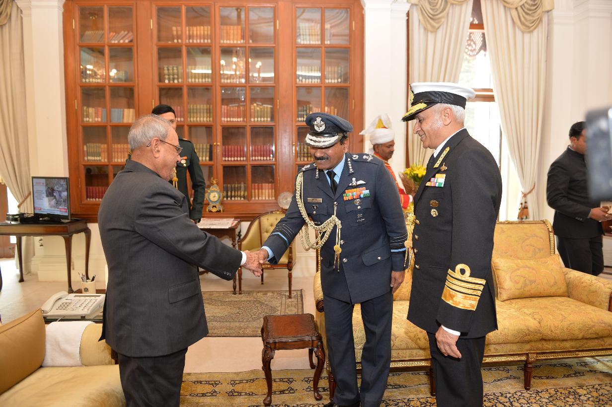 | Caption: | The Chief of Air Staff, Air Chief Marshal Arup Raha and the Chief of Naval Staff, Admiral Sunil Lanba greeting the President of India, Shri Pranab Mukherjee on the occasion of his birthday, at Rashtrapati Bhavan on December 11, 2016. |