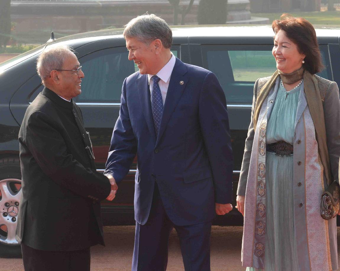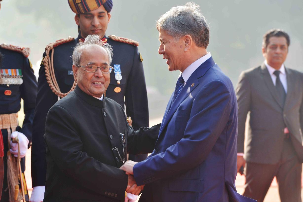 | Caption: | The President of India, Shri Pranab Mukherjee receiving the President of the Republic of Kyrgyzstan, H.E. Mr. Alamazbek Sharshenovich Atambayev and Mrs. Raisa Atambaeva during their Ceremonial Reception, at the Forecourt of Rashtrapati Bhavan on December 20, 2016. |
