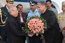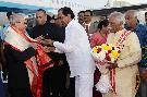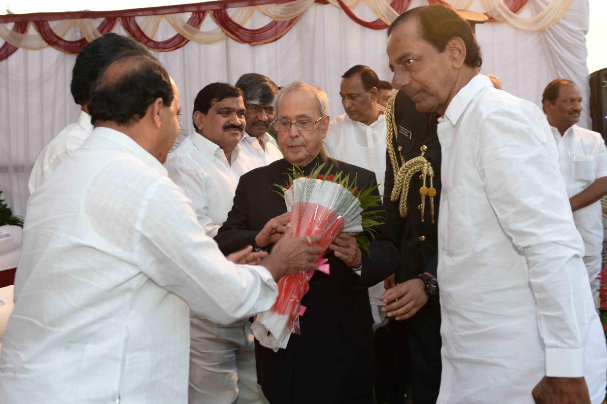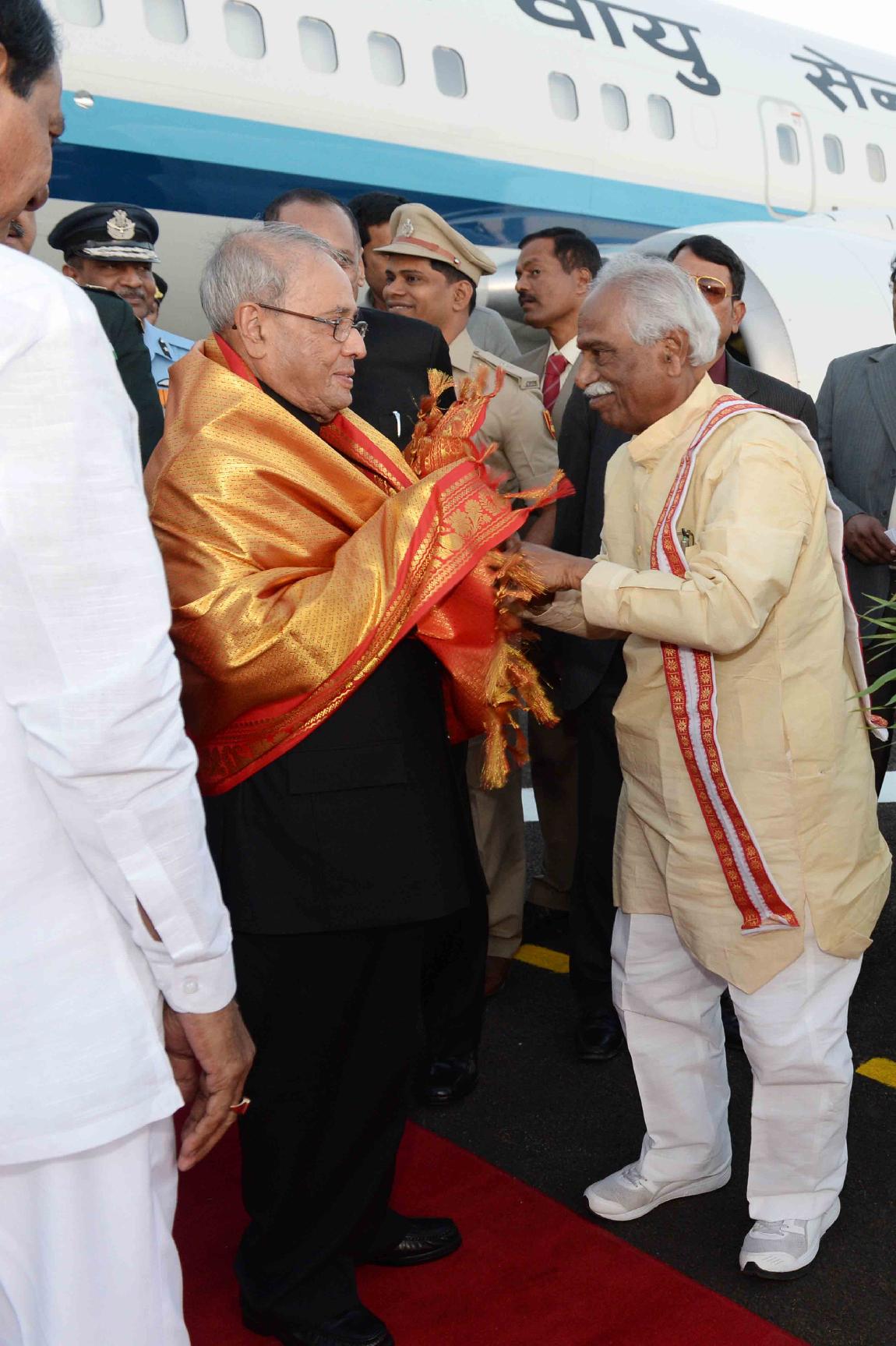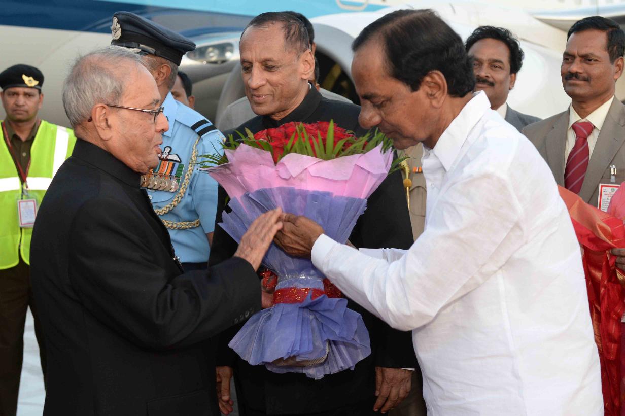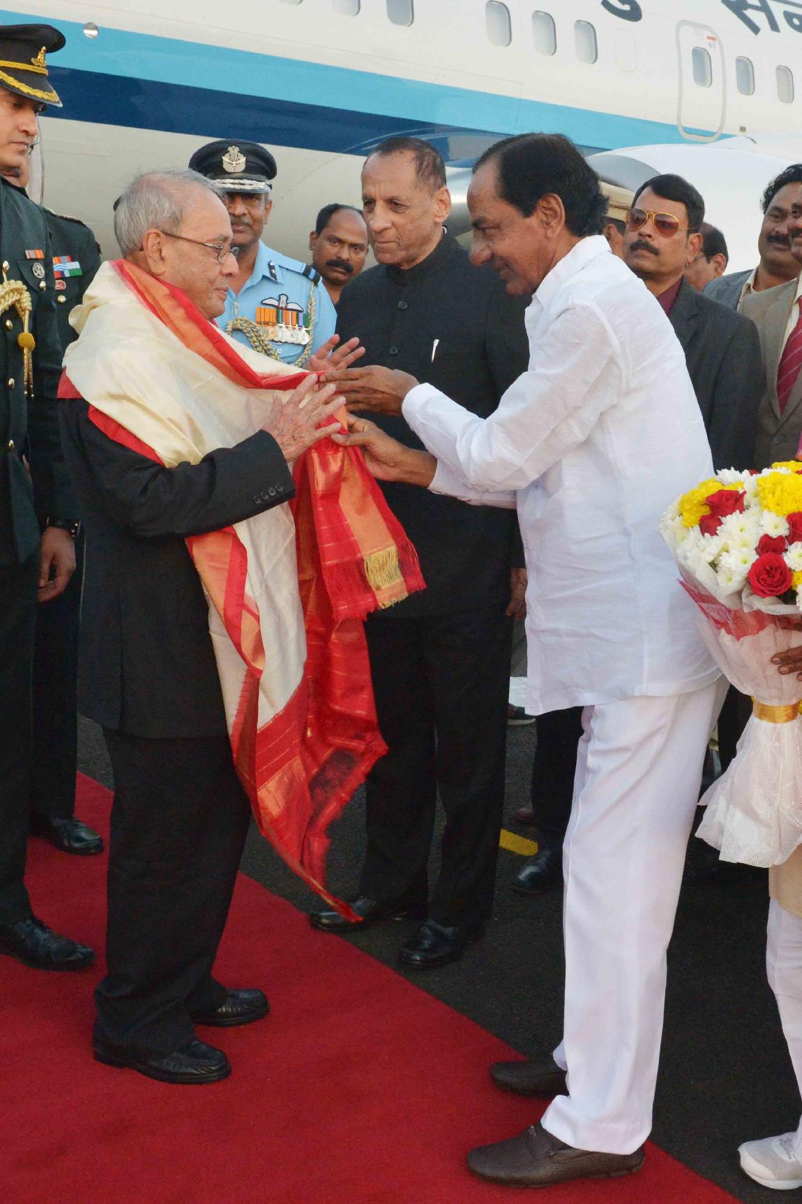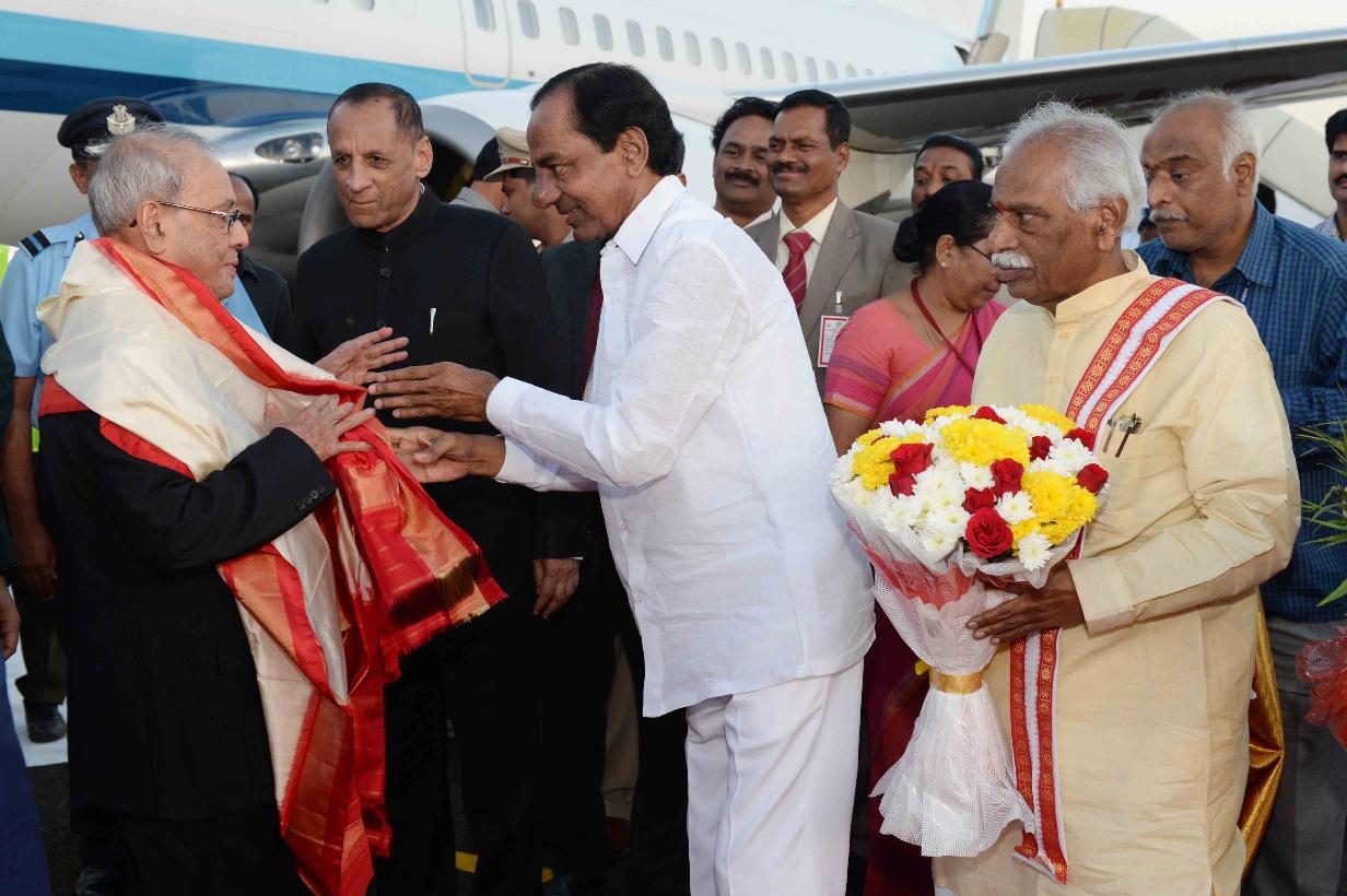 | Caption: | The President of India, Shri Pranab Mukherjee being received by the Governor of Andhra Pradesh and Telangana, Shri E.S.L. Narasimhan, the Chief Minister of Telangana, Shri K. Chandrasekhar Rao and the Minister of State for Labour and Employment (Independent Charge), Shri Bandaru Dattatreya, on his arrival, at Hakimpet Airport, in Hyderabad on December 22, 2016. |