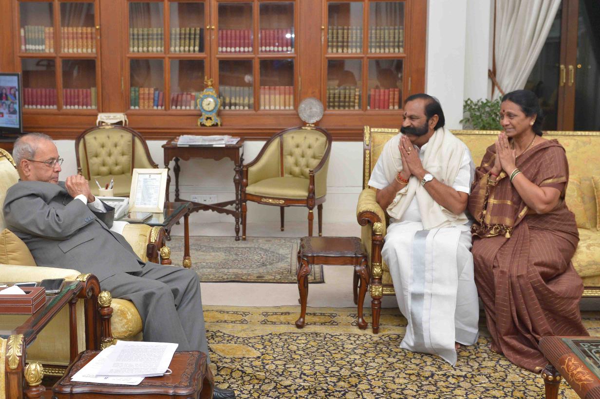 | Caption: | The President of India, Shri Pranab Mukherjee meeting with Smt. & Shri K. Bapi Raju, Ex-MP, at Rashtrapati Bhavan on January 12, 2017. |