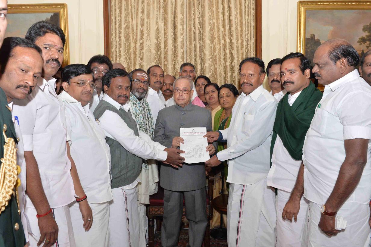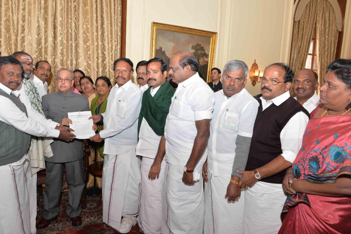 | Caption: | The President of India, Shri Pranab Mukherjee meeting with a delegation of AIADMK Party MPs from Tamil Nadu led by Dr. M. Thambi Durai, Deputy Speaker, Lok Sabha, at Rashtrapati Bhavan on January 21, 2017. |