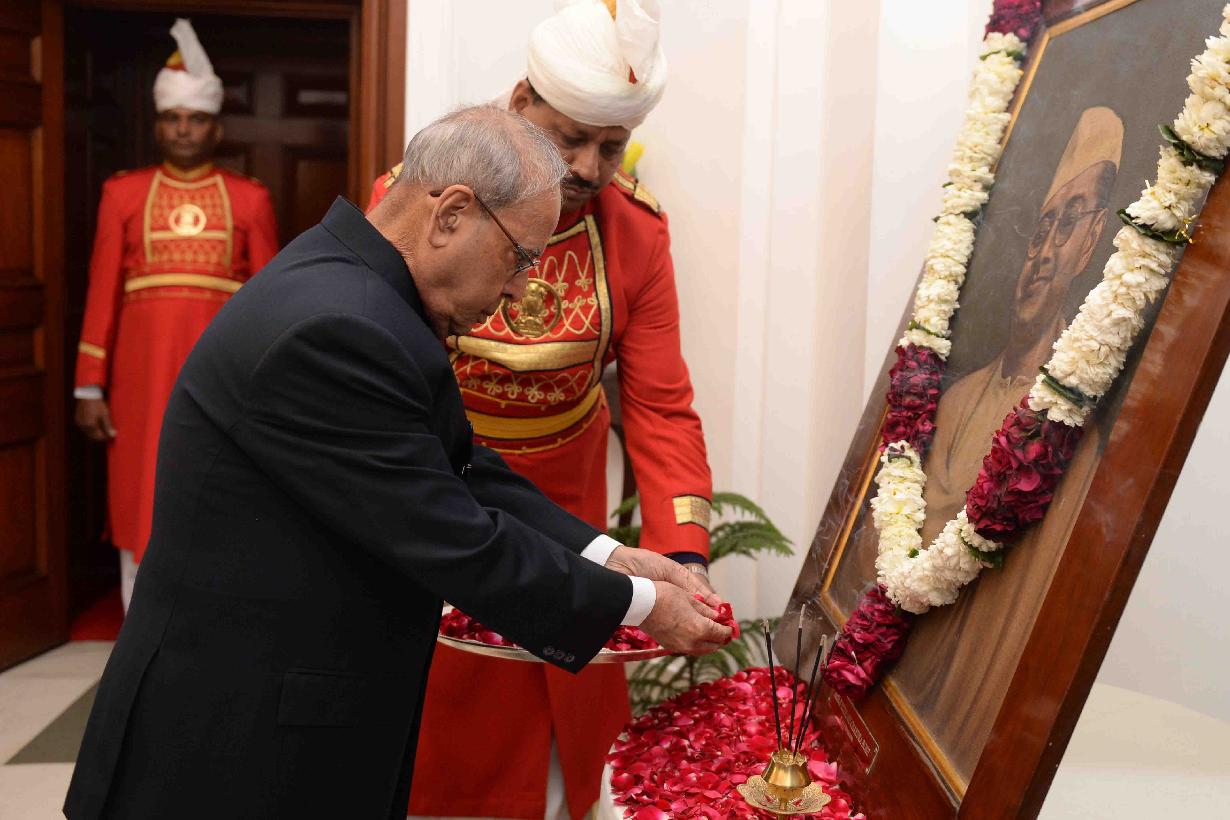 | Caption: | The President of India, Shri Pranab Mukherjee paying floral tributes at the portrait of Netaji Subhash Chandra Bose on the occasion of his Birth Anniversary, at Rashtrapati Bhavan on January 23, 2017. |