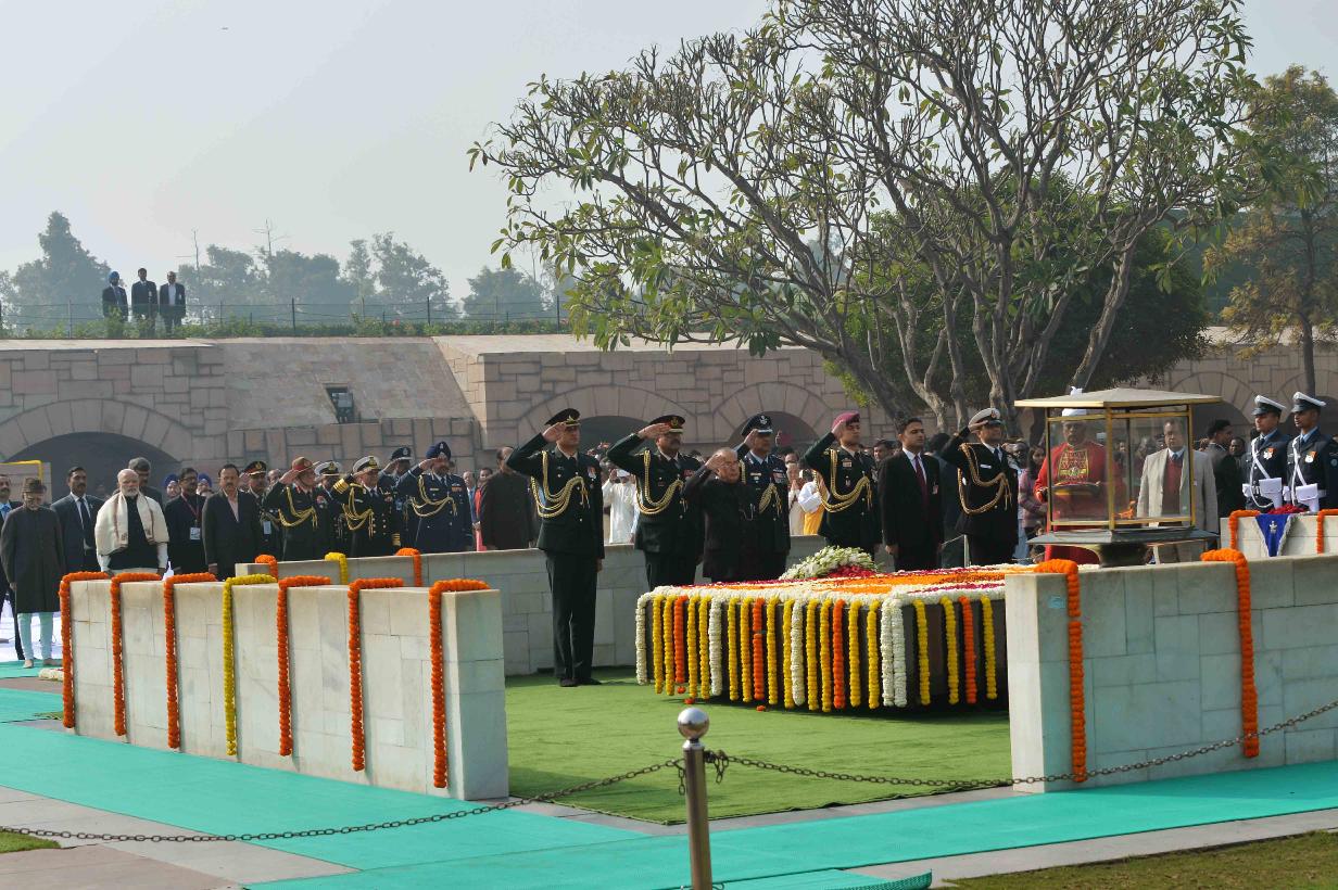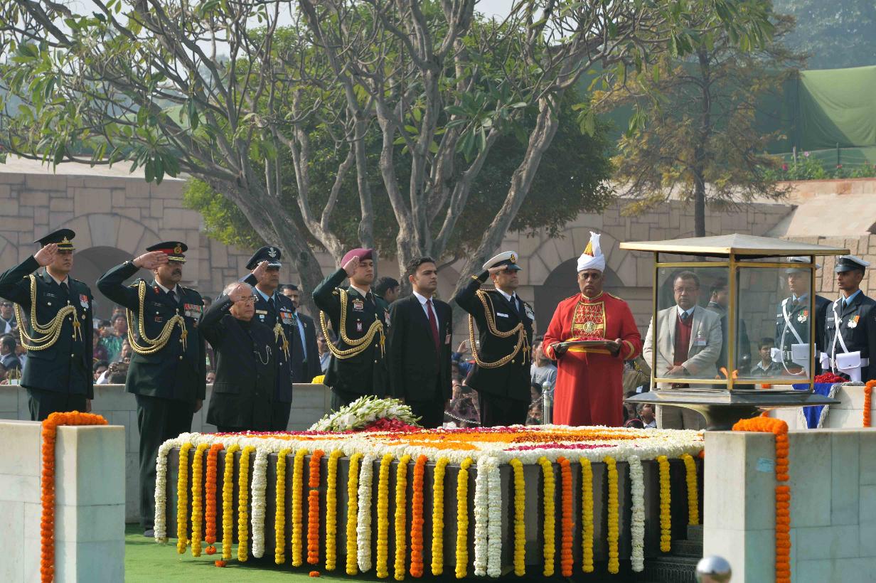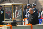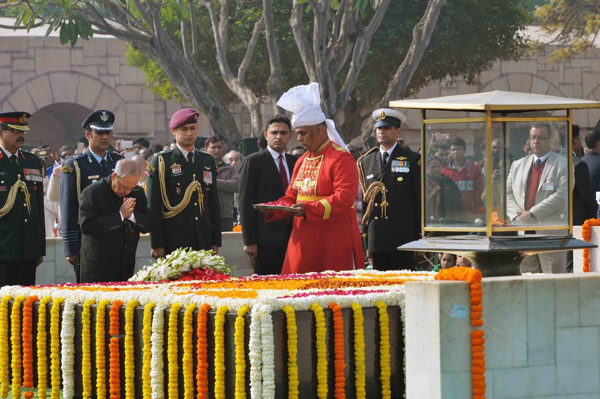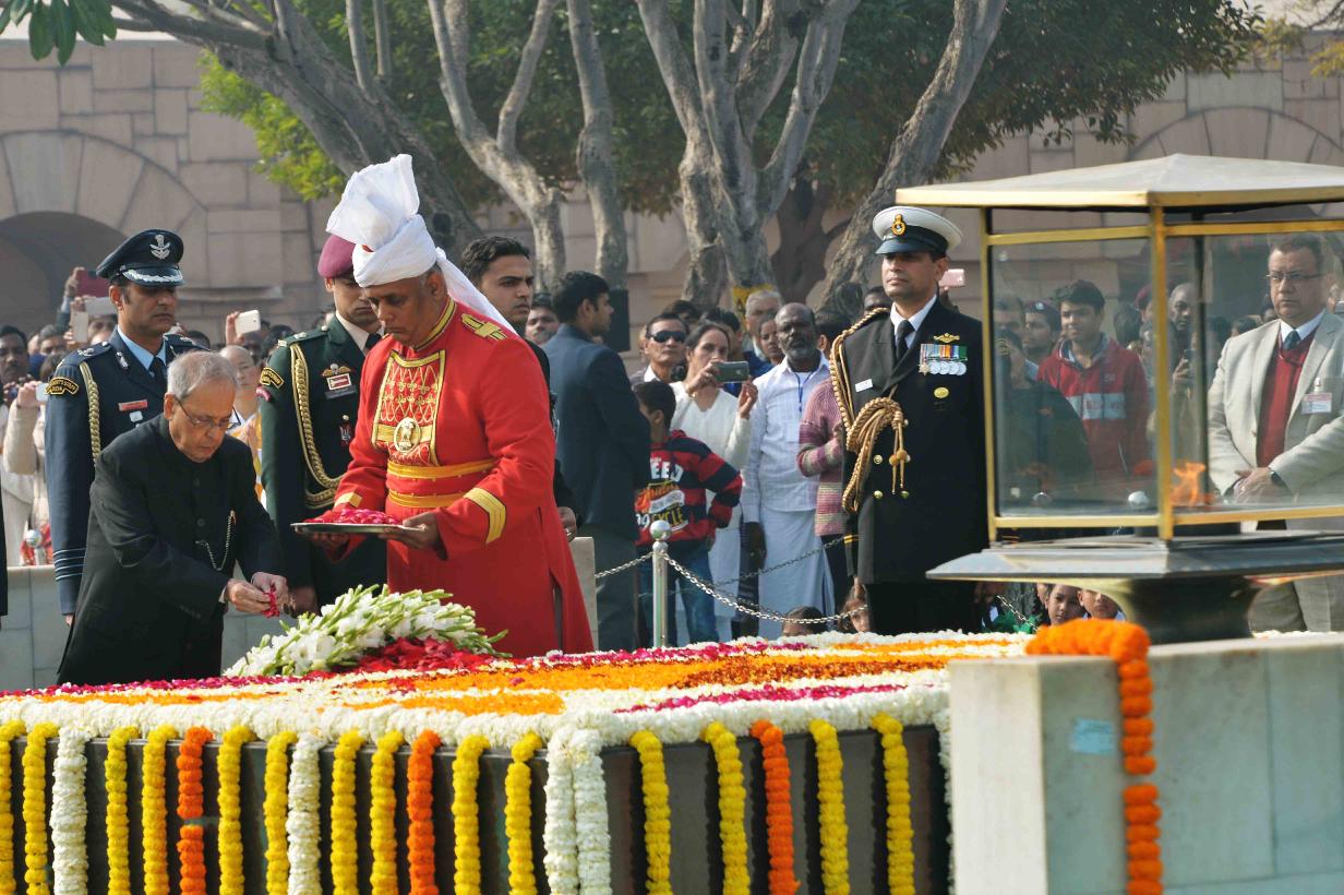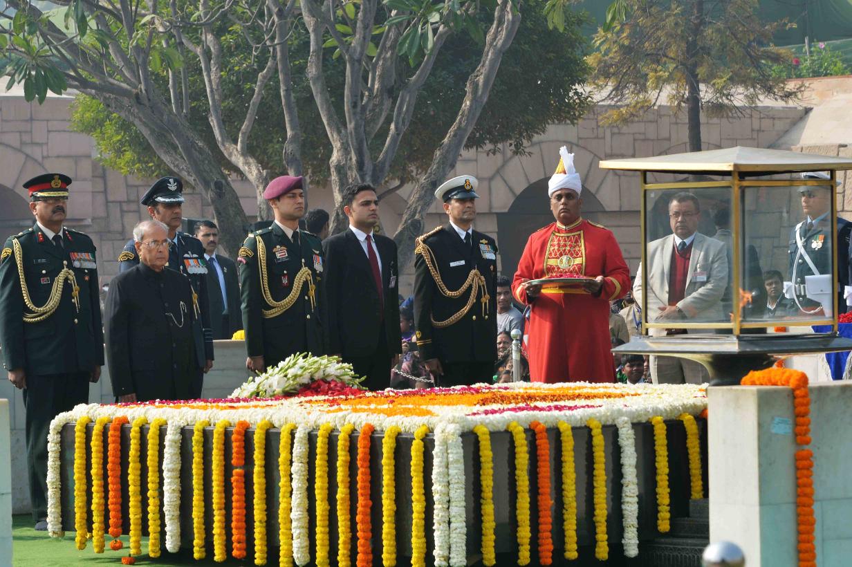| Caption: | The President of India, Shri Pranab Mukherjee paying homage at the Samadhi of Mahatma Gandhi on his 69th Death Anniversary, at Rajghat, in Delhi on January 30, 2017. |