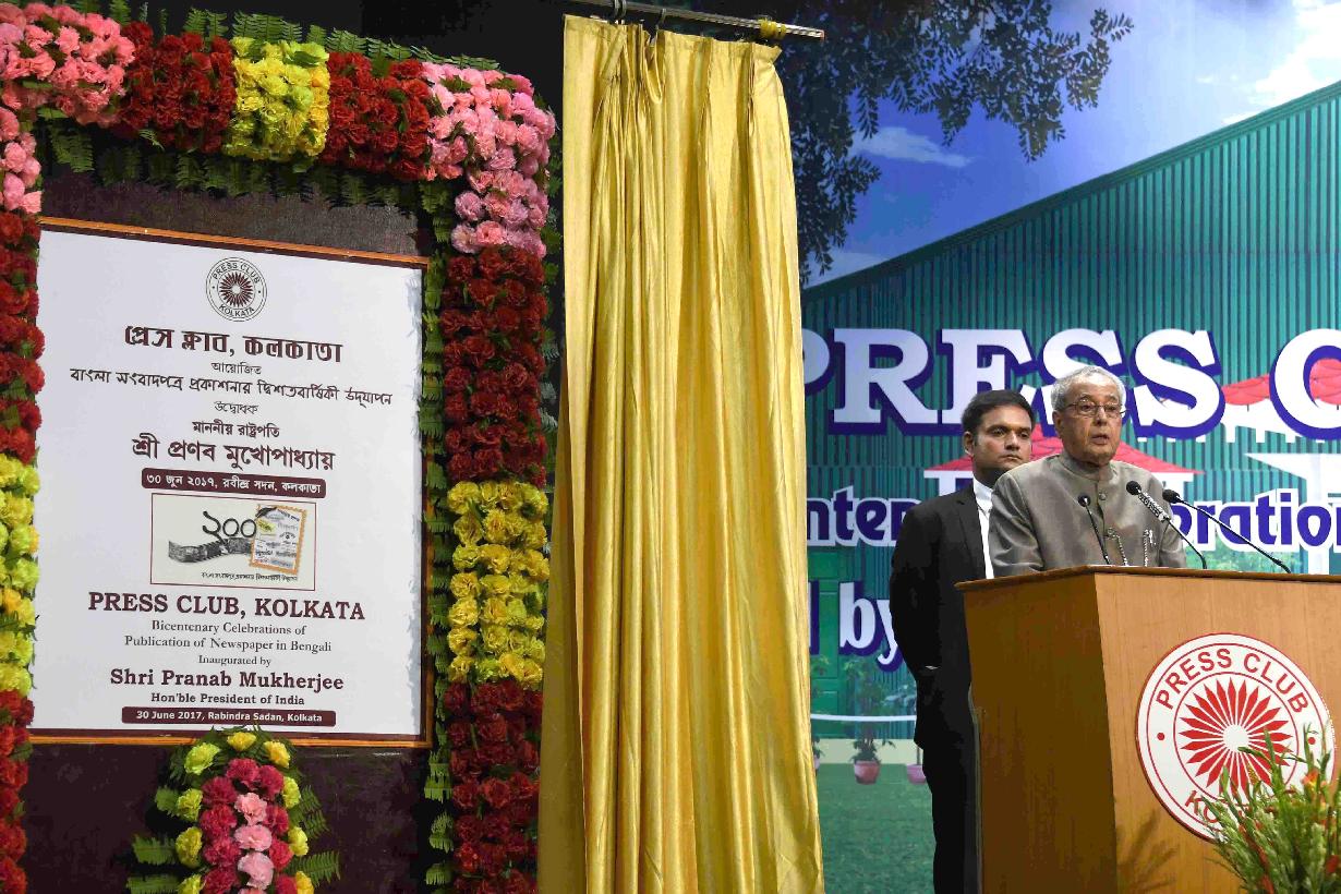 | Caption: | The President of India, Shri Pranab Mukherjee unveiling the Commemorative Plaque of the Bicentenary of Bengali Newspaper Organized by the Press Club, Kolkata, at Kolkata, in West Bengal on June 30, 2017. |