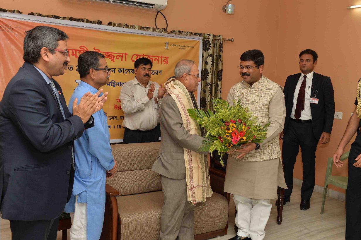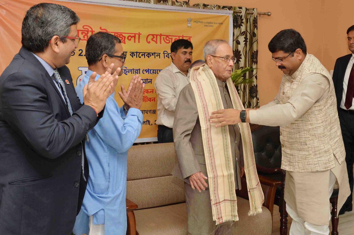 | Caption: | The President of India, Shri Pranab Mukherjee being felicitated by the Union Petroleum and Natural Gas Minister, Shri Dharmendra Pradhan during the distribution of free LPG Gas Connection under the Pradhan Mantri Ujjwala Yojana (PMUY), at Jangipur, Murshidabad, in West Bengal on July 15, 2017. |