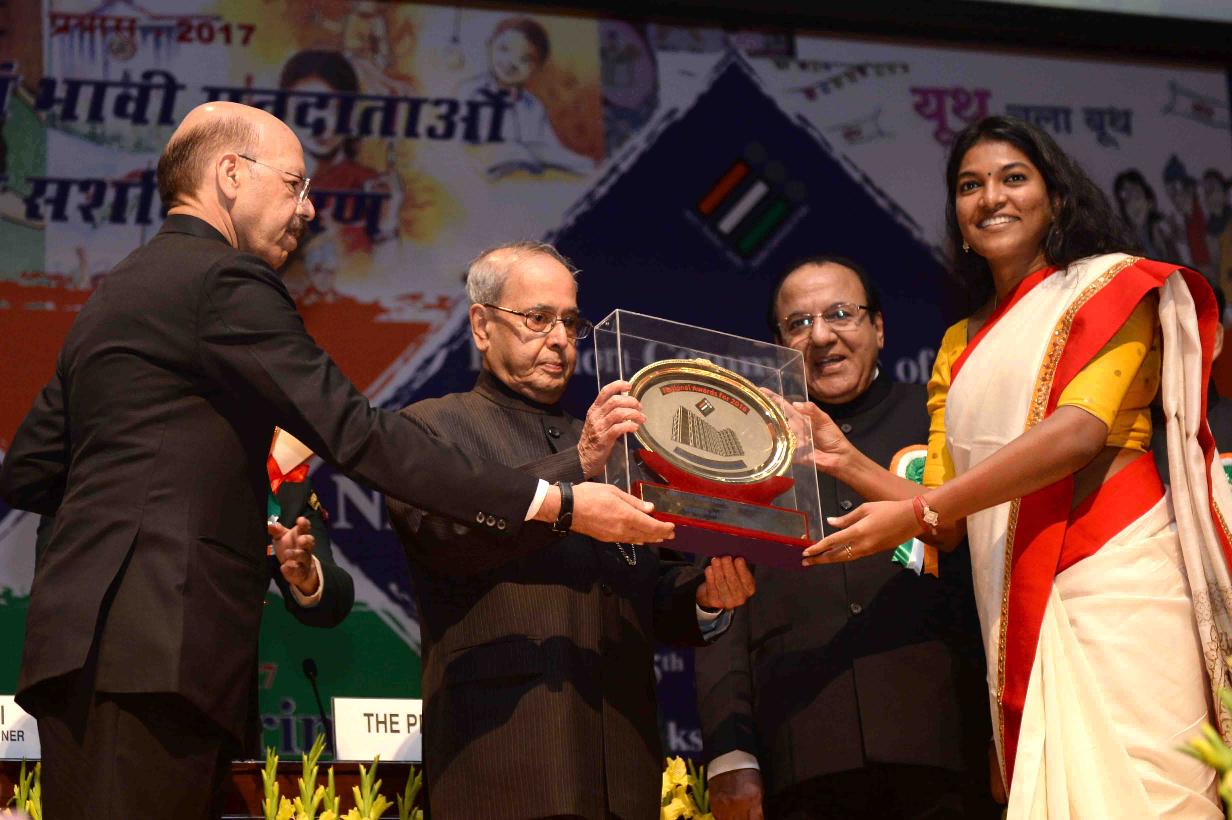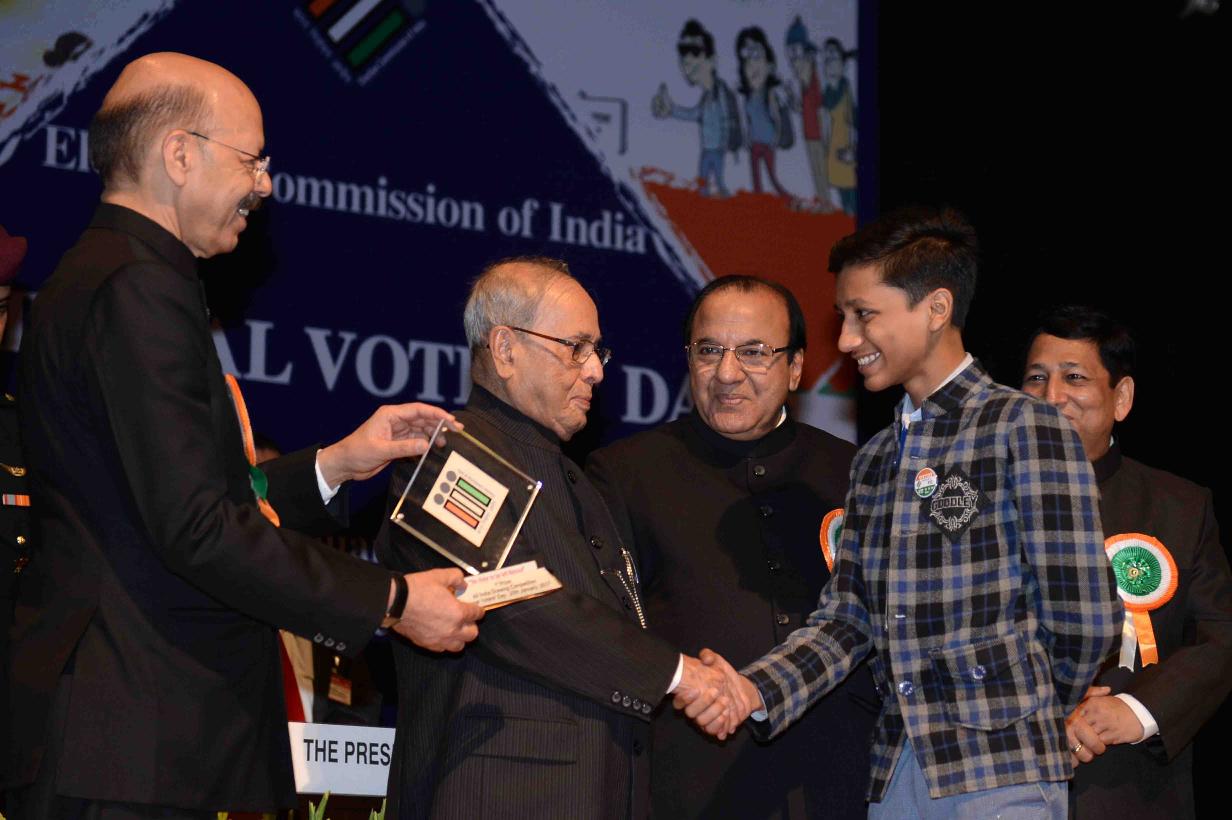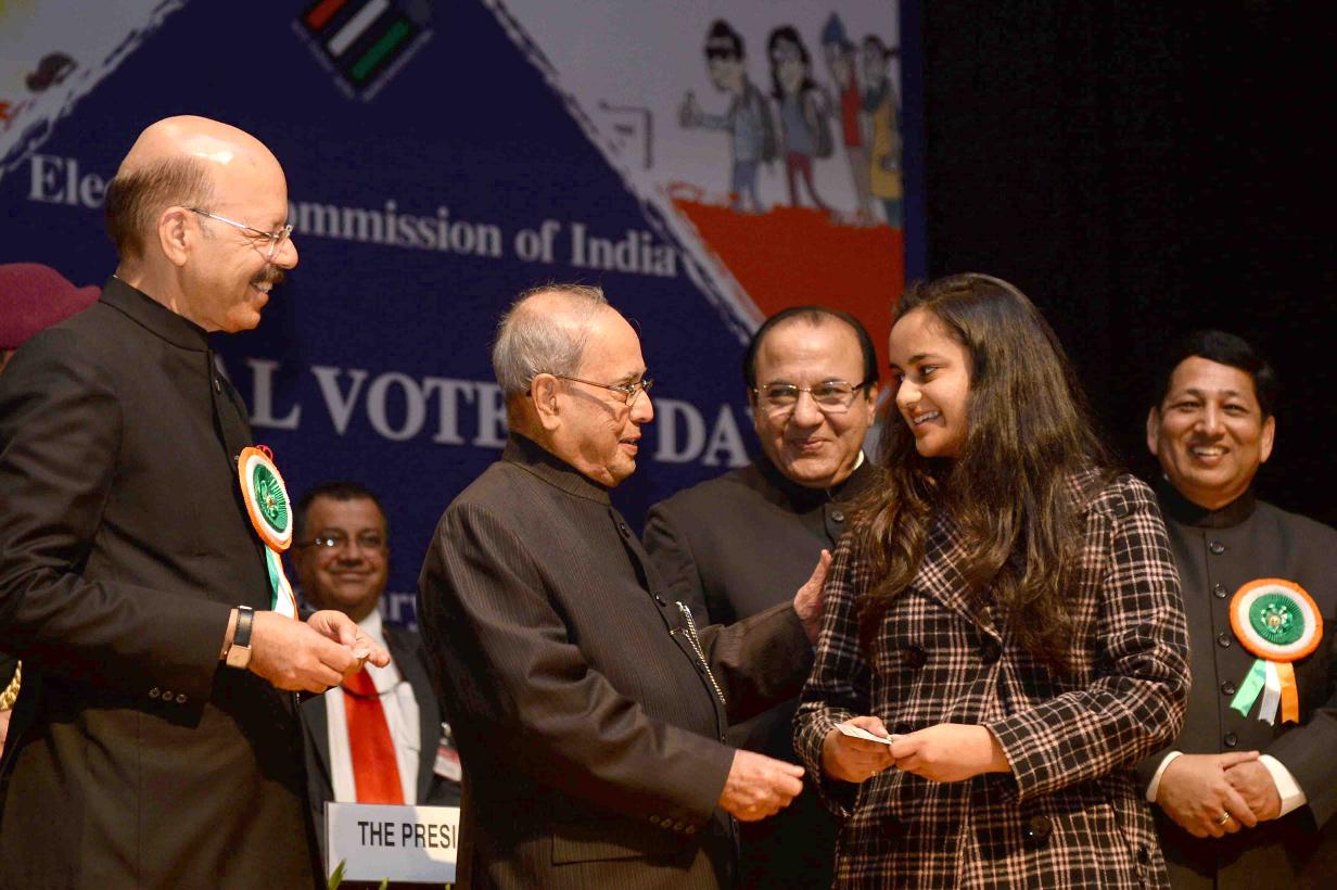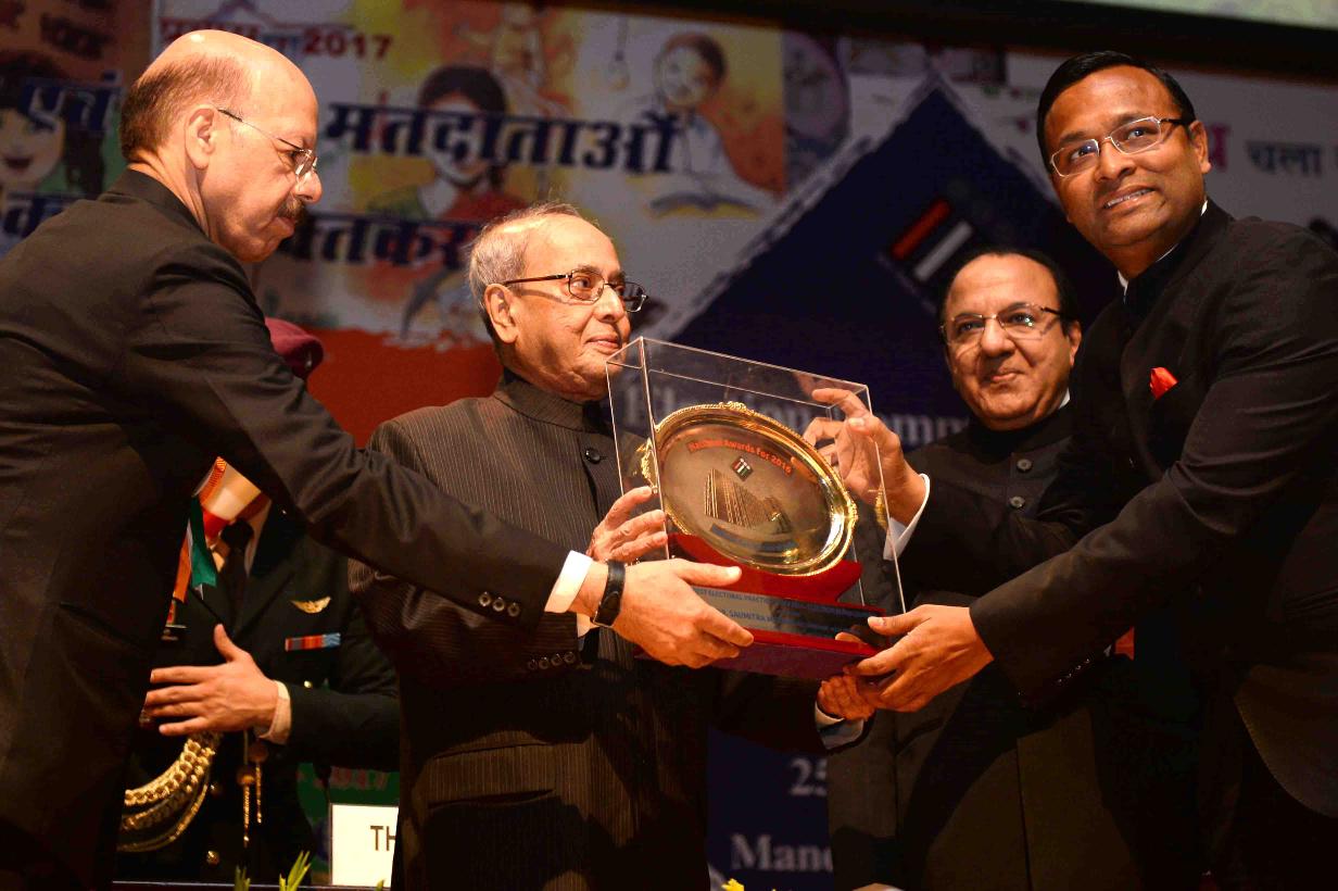 | Caption: | The President of India, Shri Pranab Mukherjee presenting the Election Photo Identity Cards to newly registered young voters and National Award for 2016, at the National Voters' Day Celebrations, organized by the Election Commission of India, in New Delhi on January 25, 2017. |