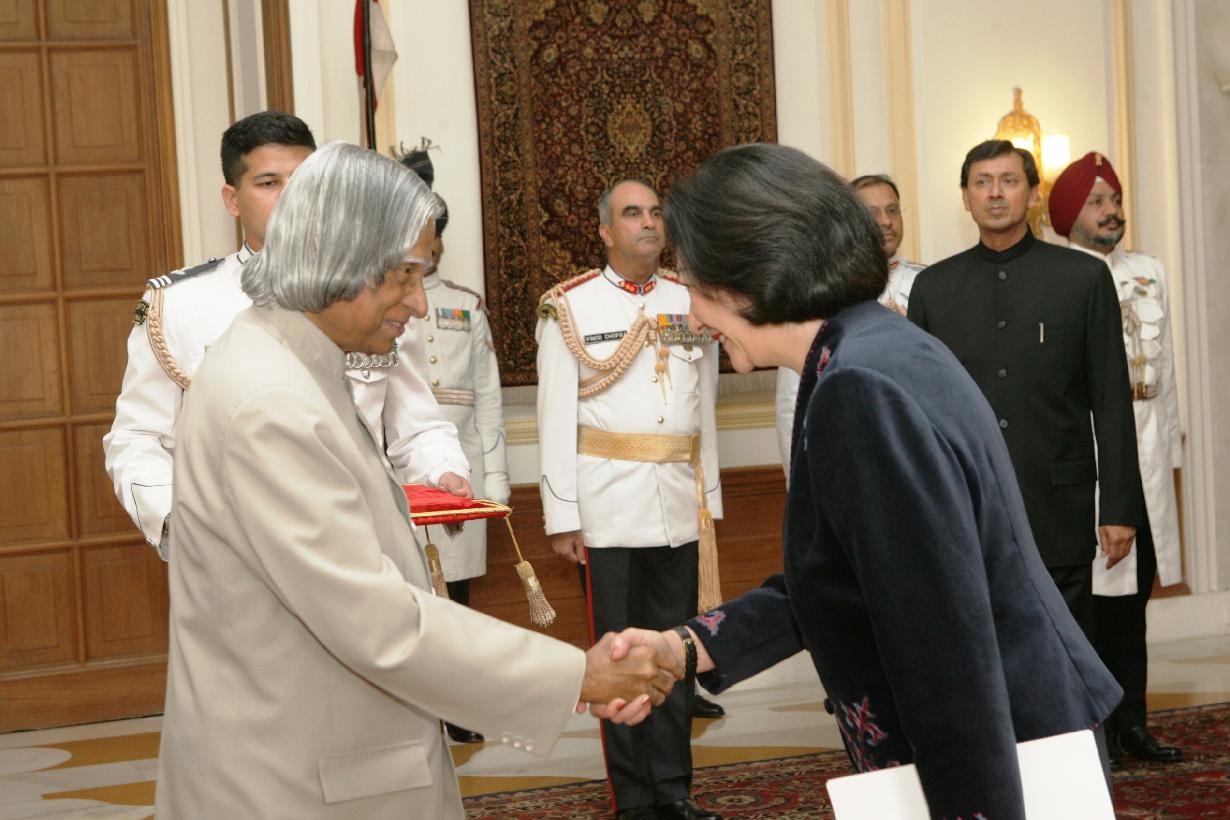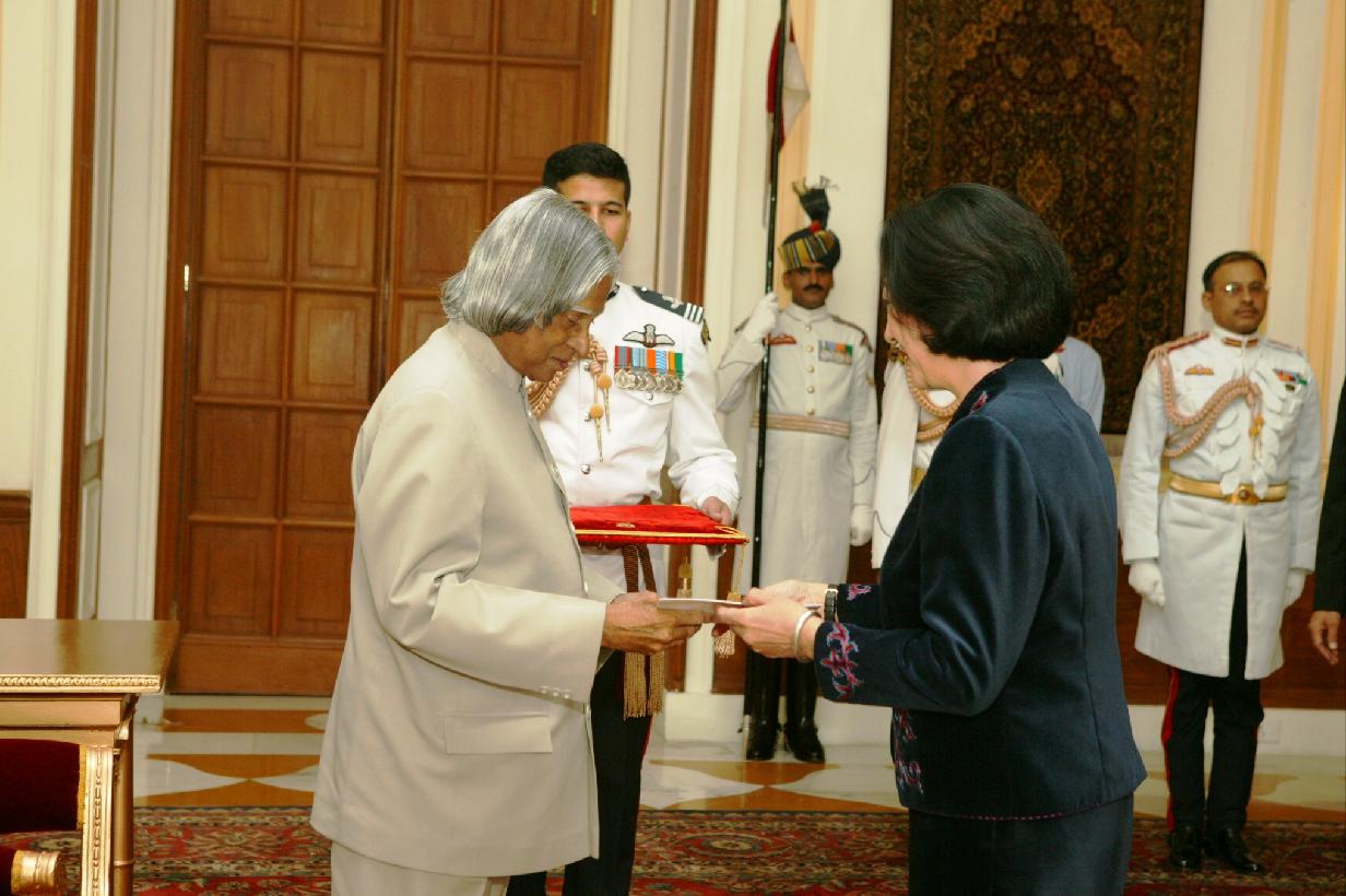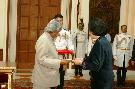 | Caption: | The Ambassador-Designate of the Republic of Kyegyz, HE Mrs Irina A Orolbaeva presenting her credentials to the President of India, Dr A P J Abdul Kalam at the Yellow Drawing Room of Rashtrapati Bhavan in New Delhi on June 19, 2006 |