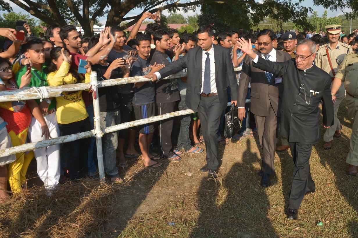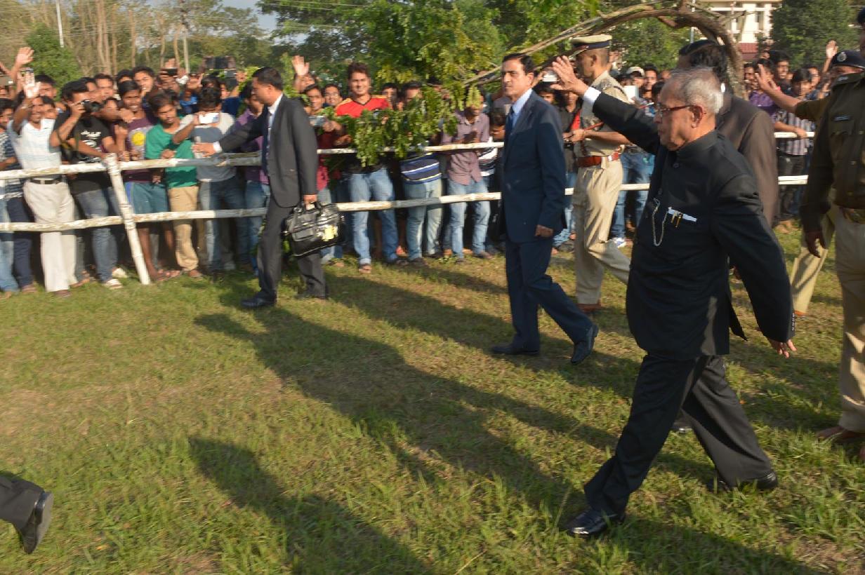 | Caption: | The President of India, Shri Pranab Mukherjee receiving greeting from People on his arrival at Tezpur University Helipad in Assam on Nov 20, 2014 |