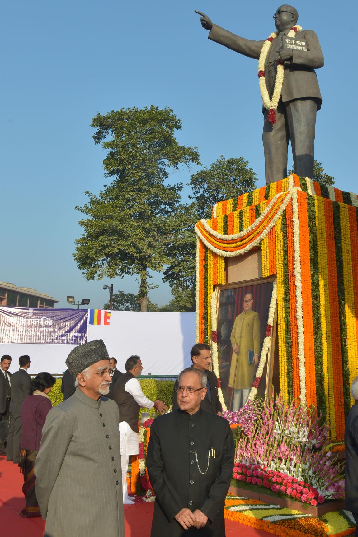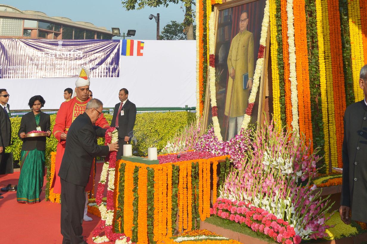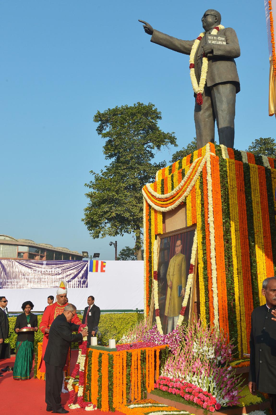 | Caption: | The President of India, Shri Pranab Mukherjee offering floral tributes at the Statue of Baba Saheb Dr B R Ambedkar on the occasion of his "Mahaparinirvan Diwas" at Parliament House Lawns in New Delhi on Dec 06, 2014 |