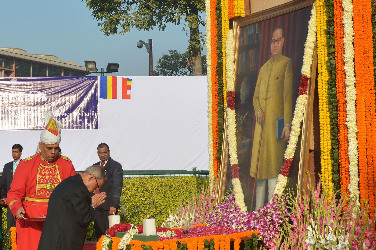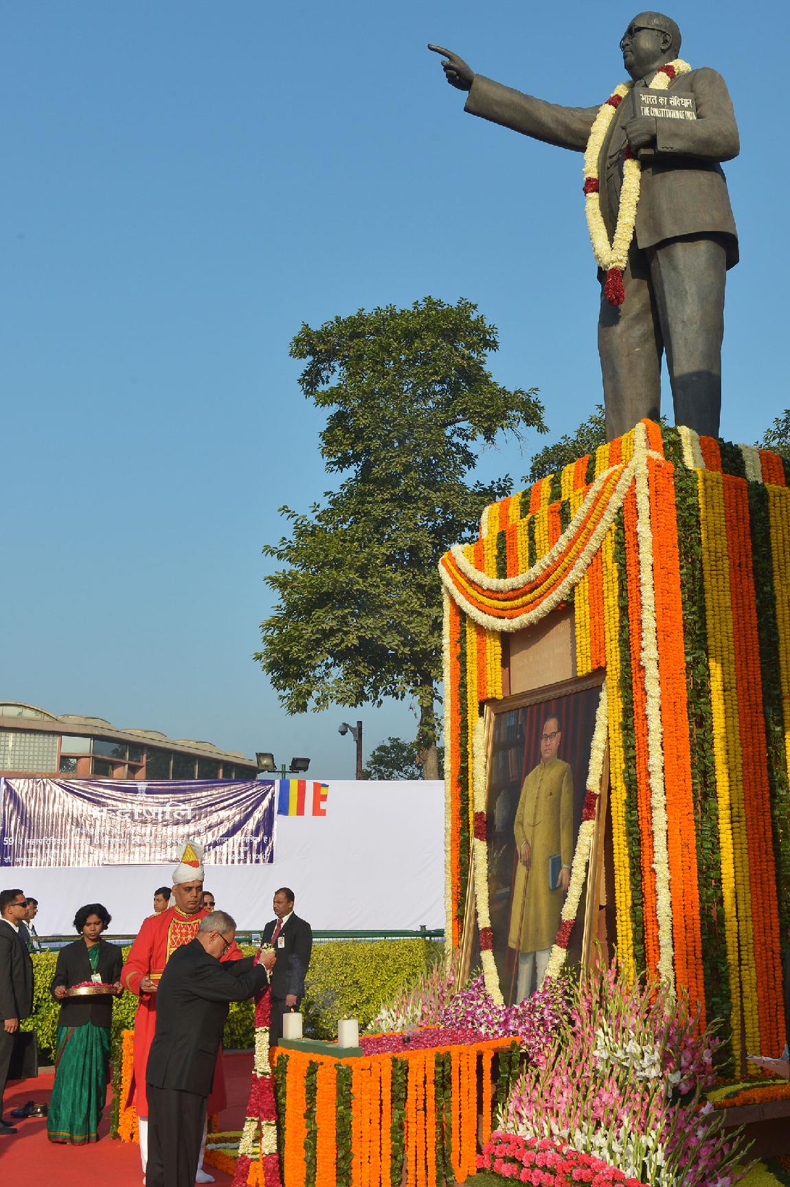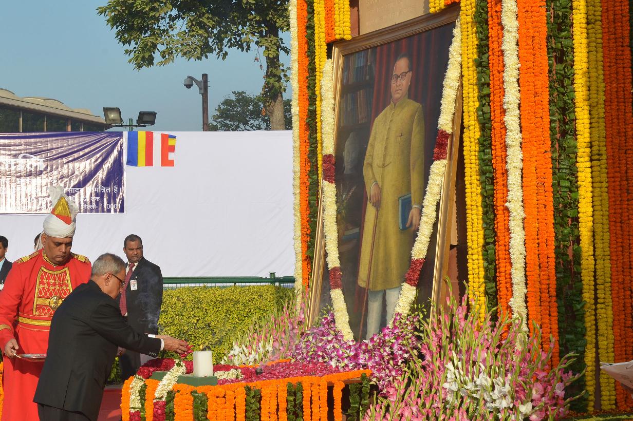 | Caption: | The President of India, Shri Pranab Mukherjee offering floral tributes at the Statue of Baba Saheb Dr B R Ambedkar on the occasion of his "Mahaparinirvan Diwas" at Parliament House Lawns in New Delhi on Dec 06, 2014 |