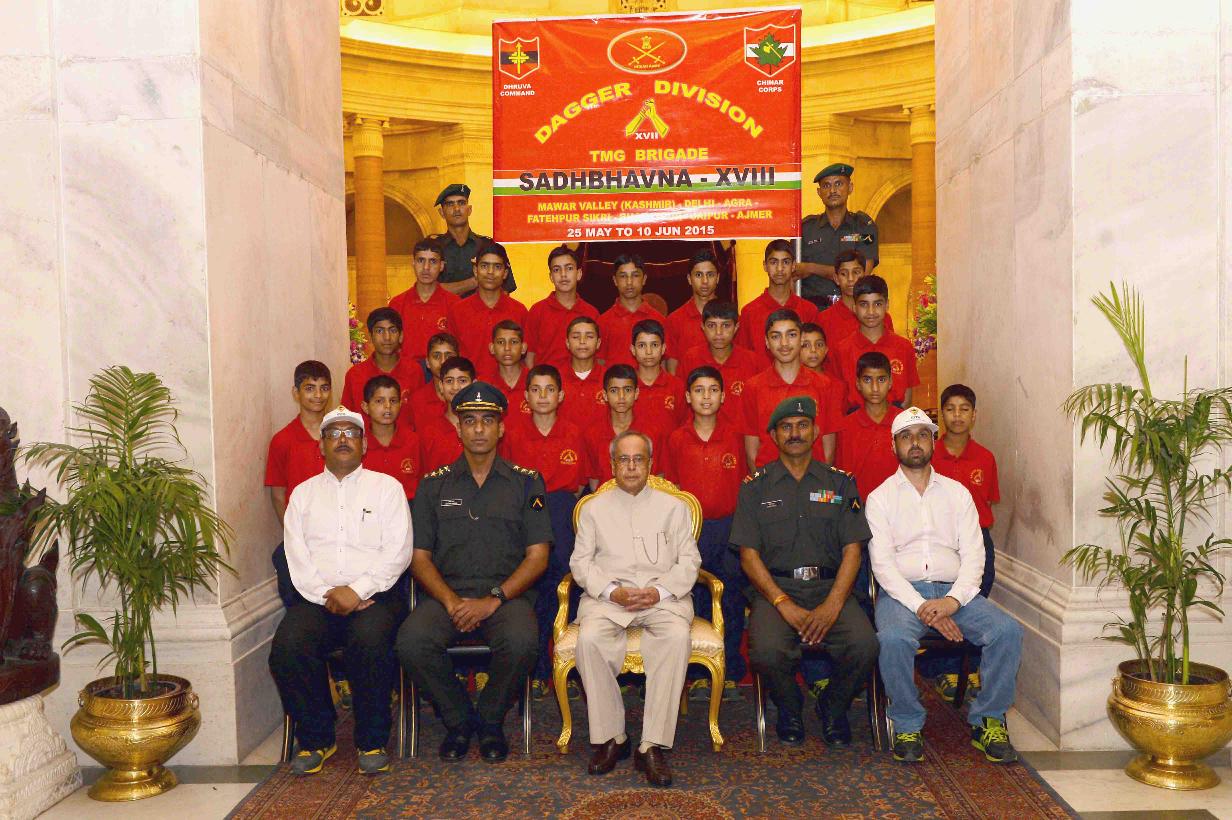 | Caption: | The President of India, Shri Pranab Mukherjee with the Students & Teachers from Mawar, Jammu & Kashmir attending Op. Sadbhavana tour, organized by the Headquarters 17 Infantry Brigade, at Rashtrapati Bhavan, in New Delhi on May 28, 2015. |