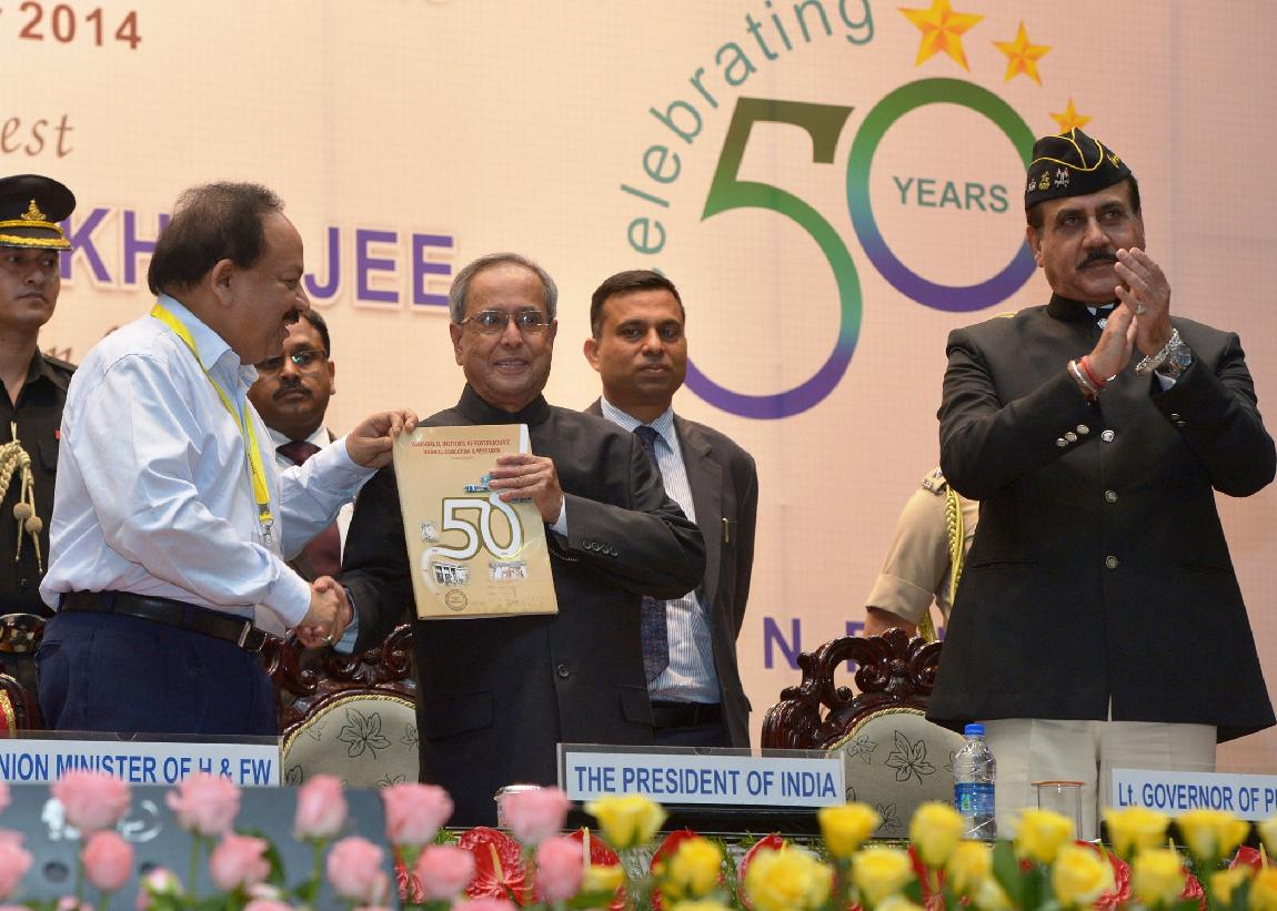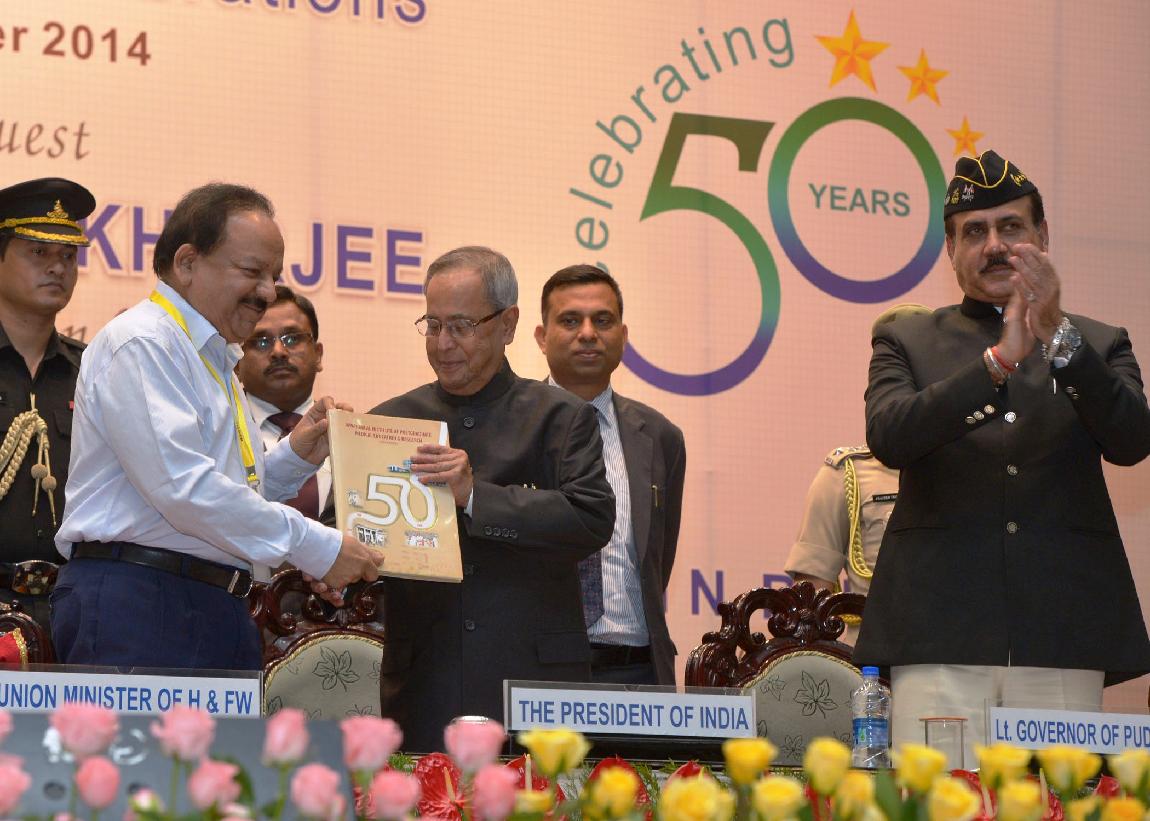 | Caption: | The President of India, Shri Pranab Mukherjee receiving the First Copy of the Golden Jubilee Souvenir from the Union Minister of Health and Family Welfare, Dr Harsh Vardhan at the Golden Jubilee Celebration of Jawaharlal Institute of Postgraduate Medical Education & Research (JIPMER) at Puducherry on Sep 26, 2014 |