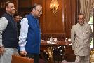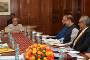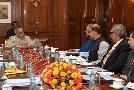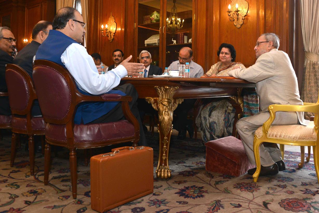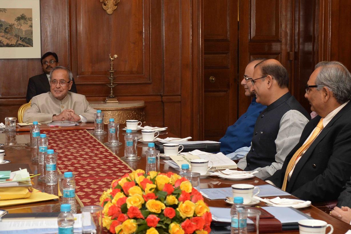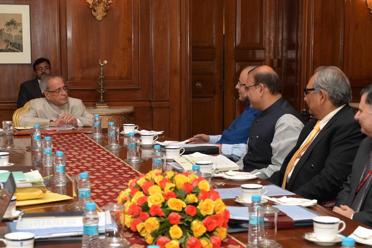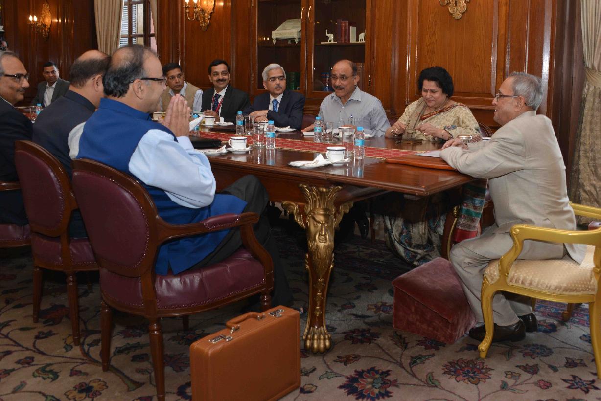 | Caption: | The President of India, Shri Pranab Mukherjee meeting with the Minister of Finance, Shri Arun Jaitley, the Minister of State of Finance, Shri Jayant Sinha and other officers from the Ministry of Finance, at Rashtrapati Bhavan, in New Delhi on February 28, 2015. |