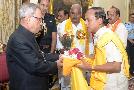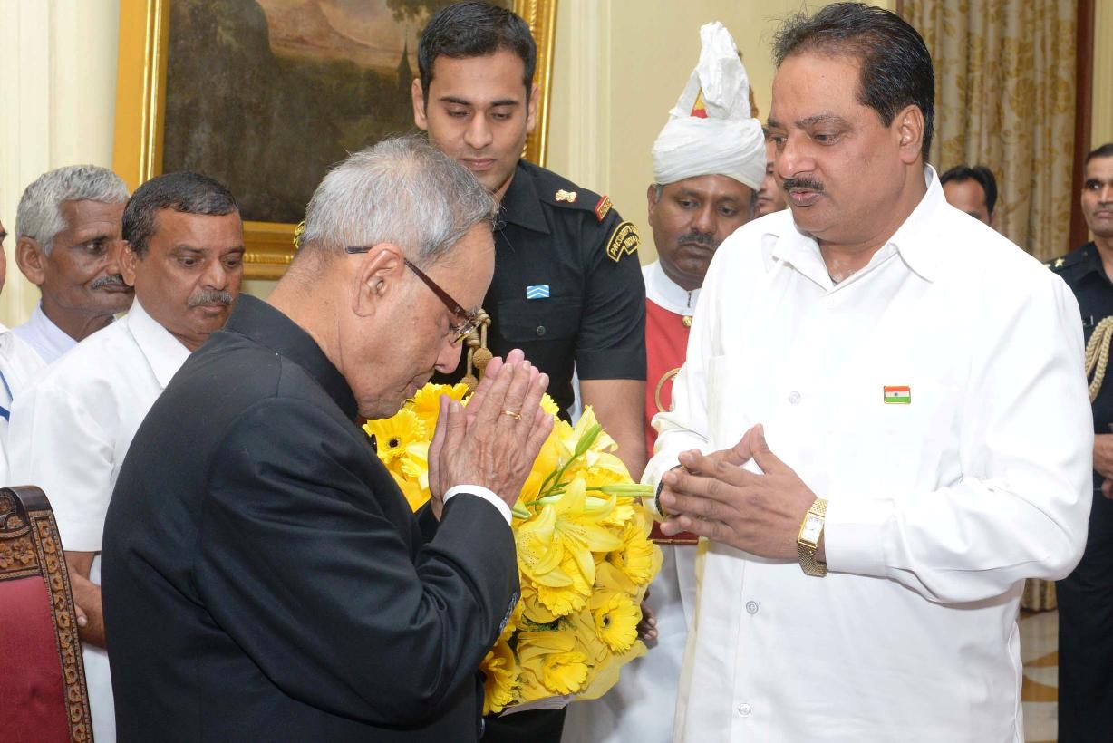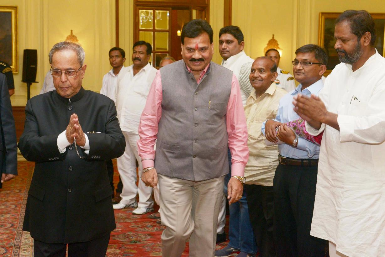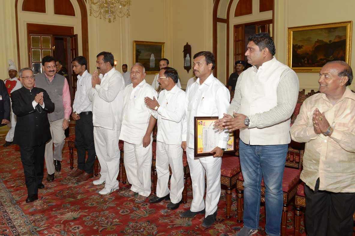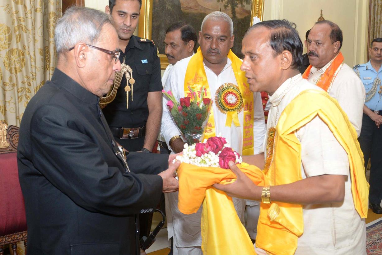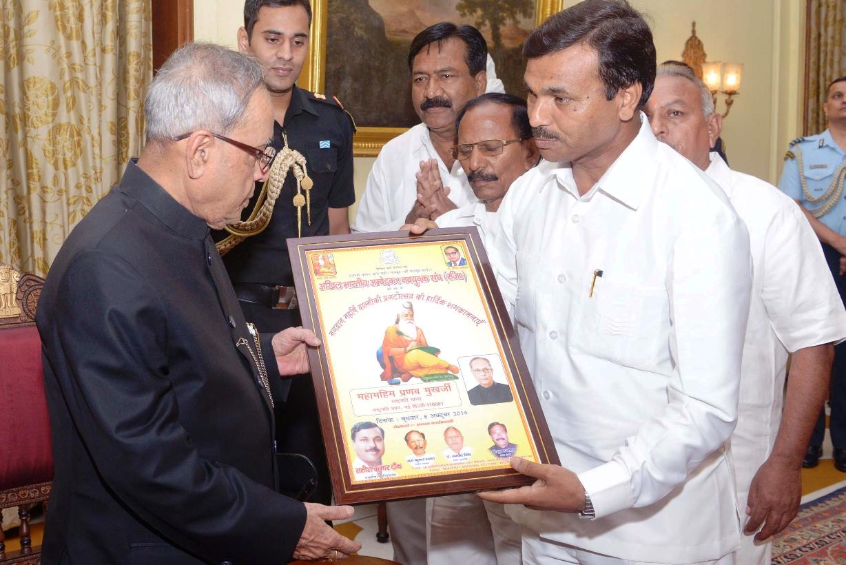 | Caption: | The President of India, Shri Pranab Mukherjee meeting with a Group on the Occasion of Maharishi Valmiki's Birthday at Rashtrapati Bhavan in New Delhi on Oct 08, 2014 |