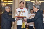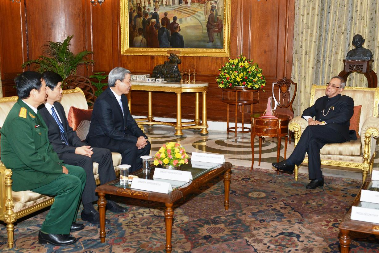 | Caption: | The Ambassador-Designate of Vietnam, HE Mr Ton SinhThanh presenting his credential to the President of India, Shri Pranab Mukherjee at Rashtrapati Bhavan in New Delhi on Oct 21, 2014 |