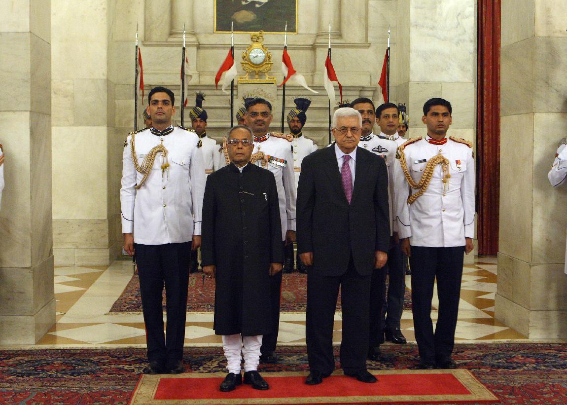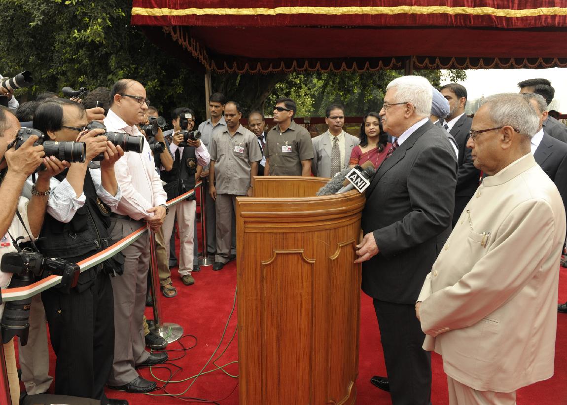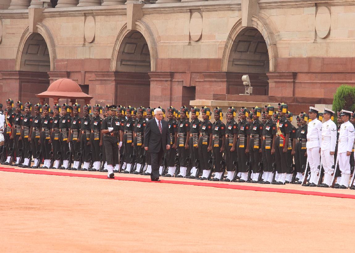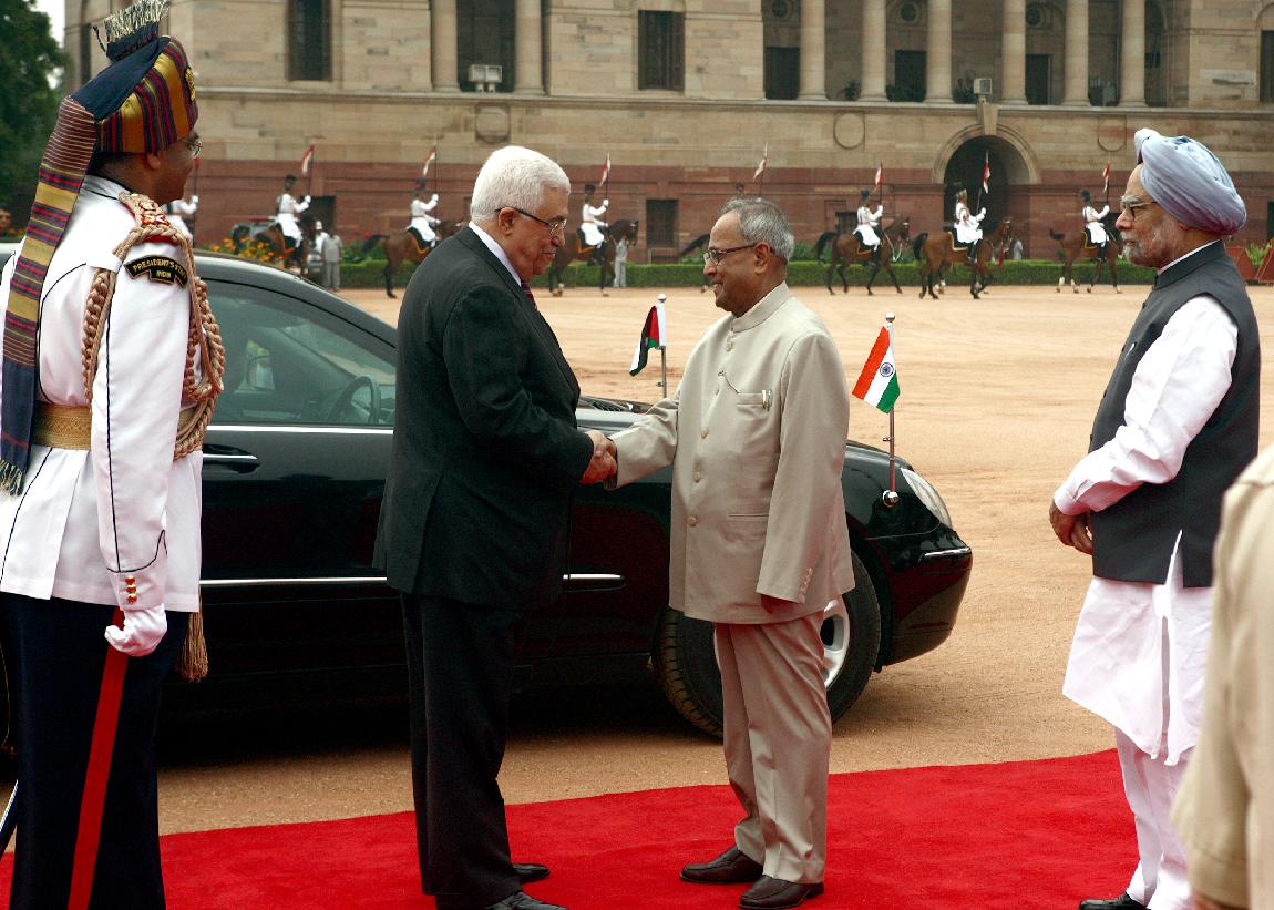 | Caption: | The President of India, Shri Pranab Mukherjee and The Prime Minister, Dr Manmohan Singh receives HE Mr Mahmoud Abbas, President of Palestinian National Authority of the State of Palestine during his Ceremonial Reception at Rashtrapati Bhavan on September 11, 2012 |