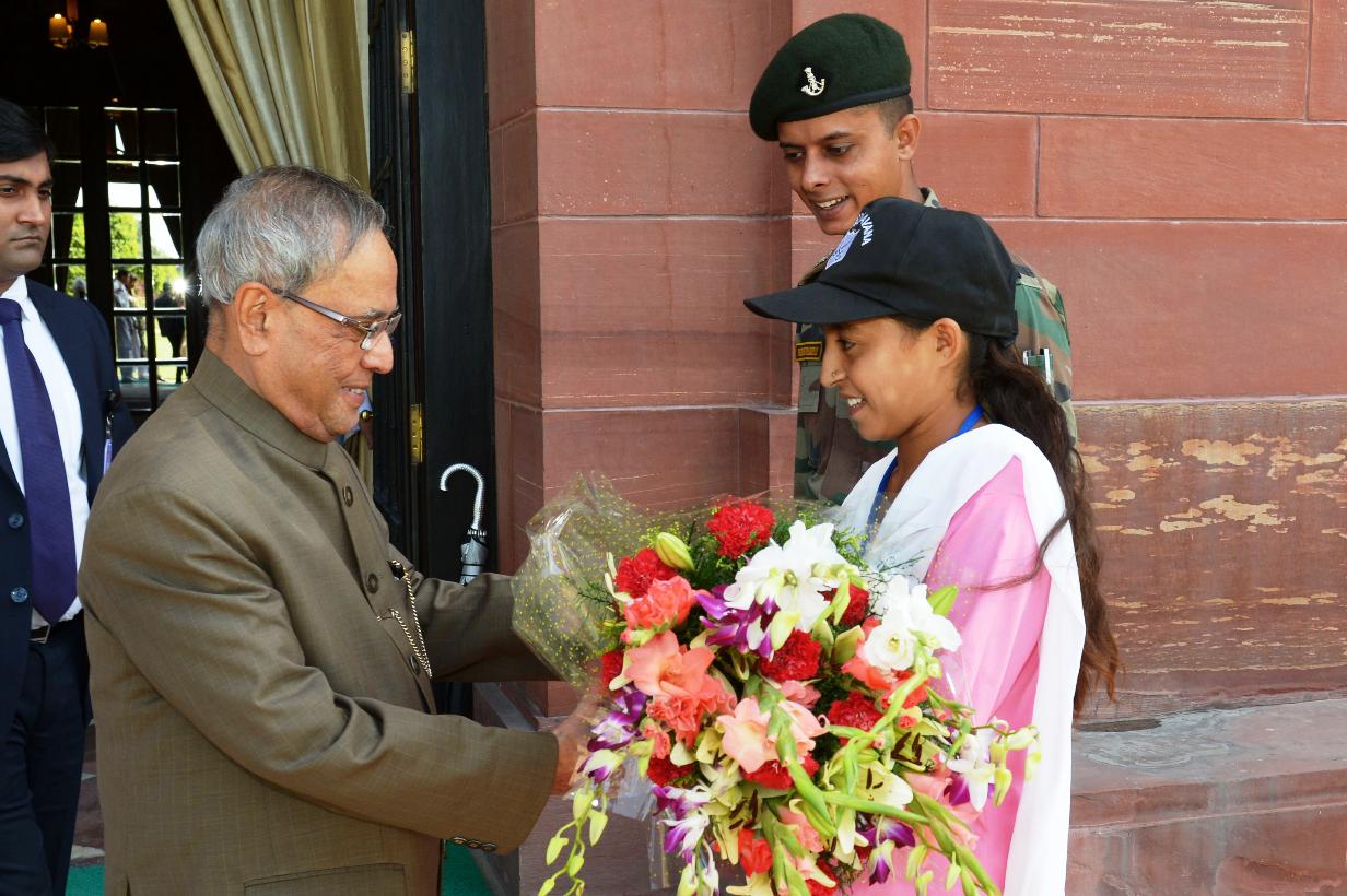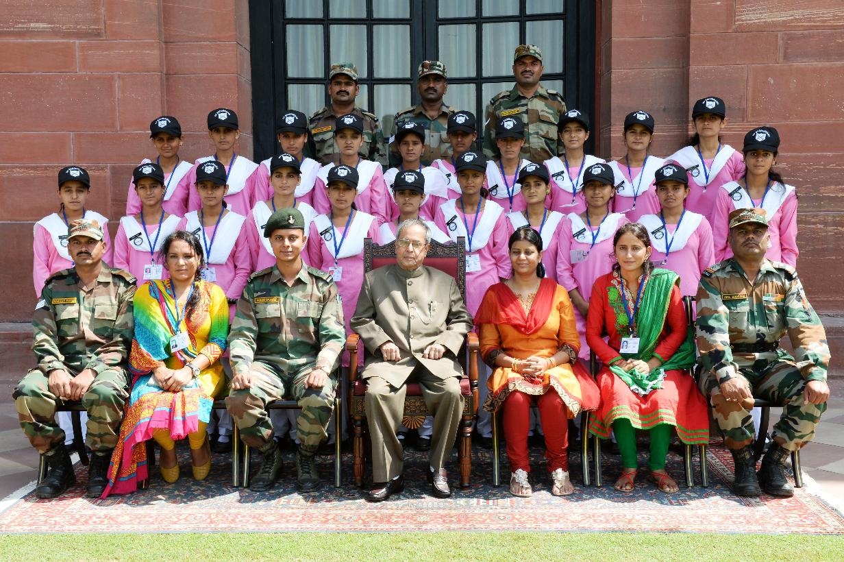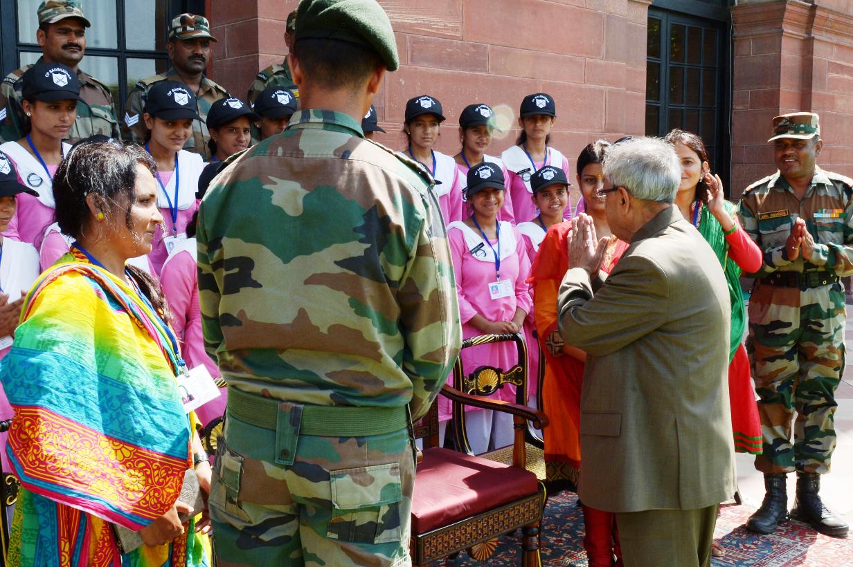 | Caption: | The President of India, Shri Pranab Mukherjee with Girl Students and Teachers from Akhnoor Tehsil of Jammu, Jammu & Kashmir attending Operation Sadbhavana Tour organised by the 2 MARATHA LI (KALI PANCHWIN) at Rashtrapati Bhavan in New Delhi on Sep 27, 2014 |