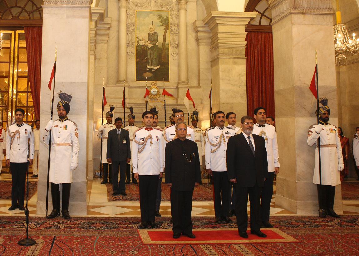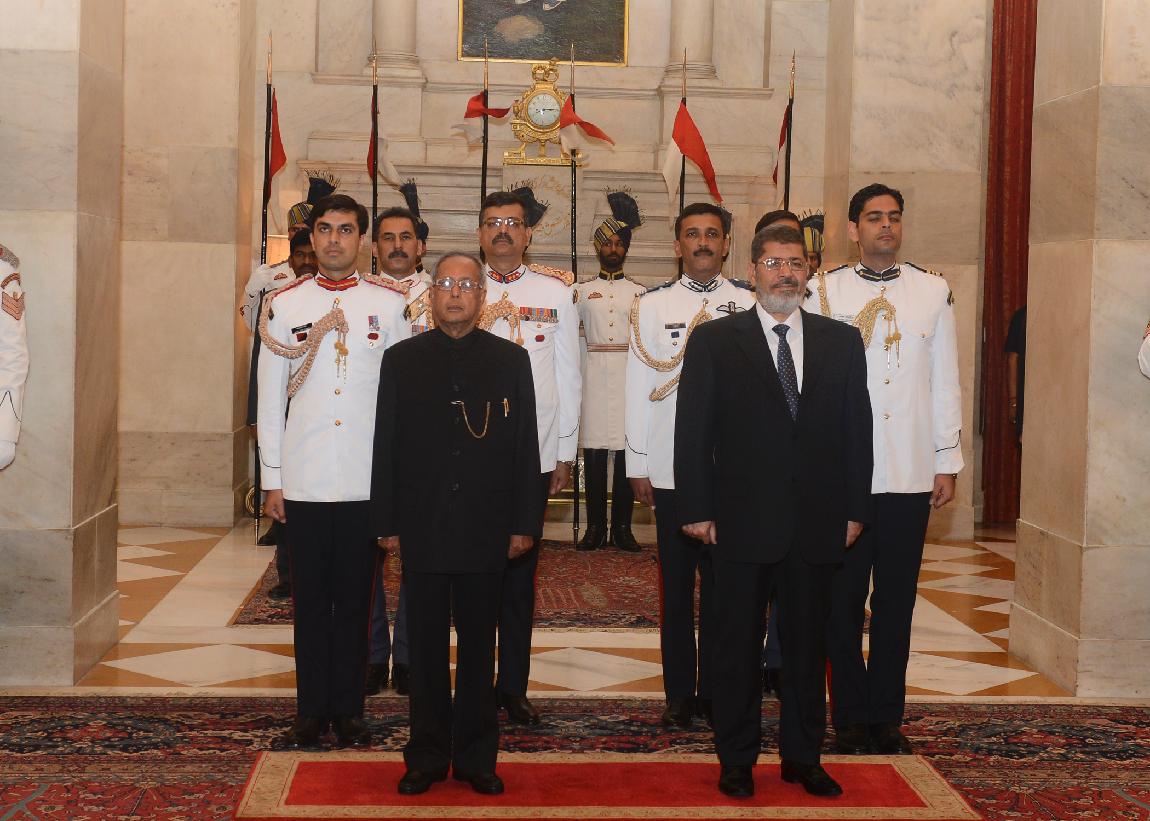 | Caption: | The President of India, Shri Pranab Mukherjee receives HE Dr Mohamed Morsy President of The Arab Republic of Egypt on March 18, 2013 |