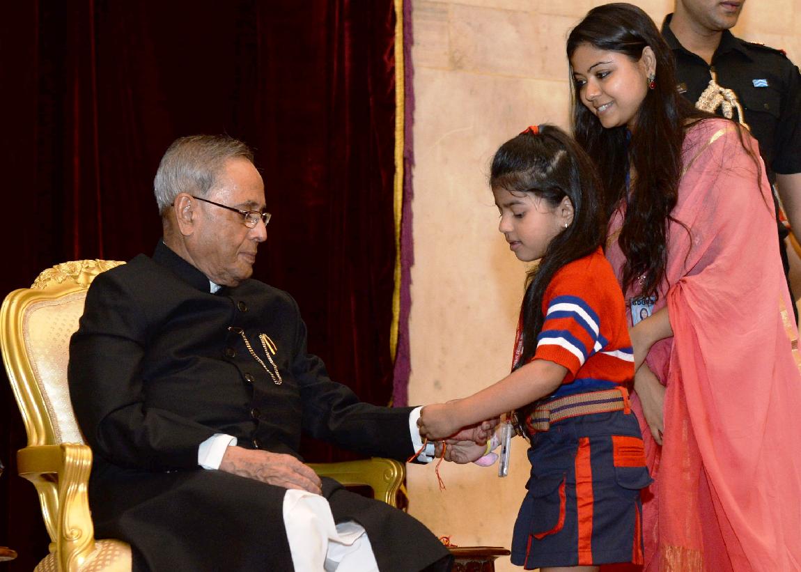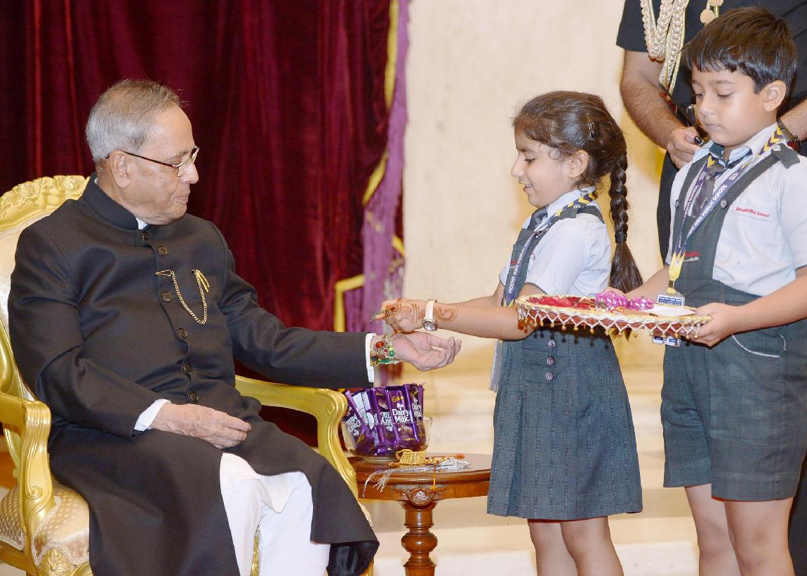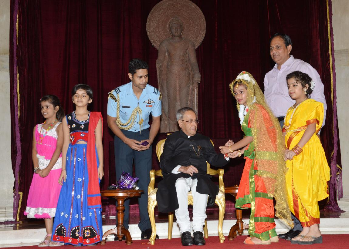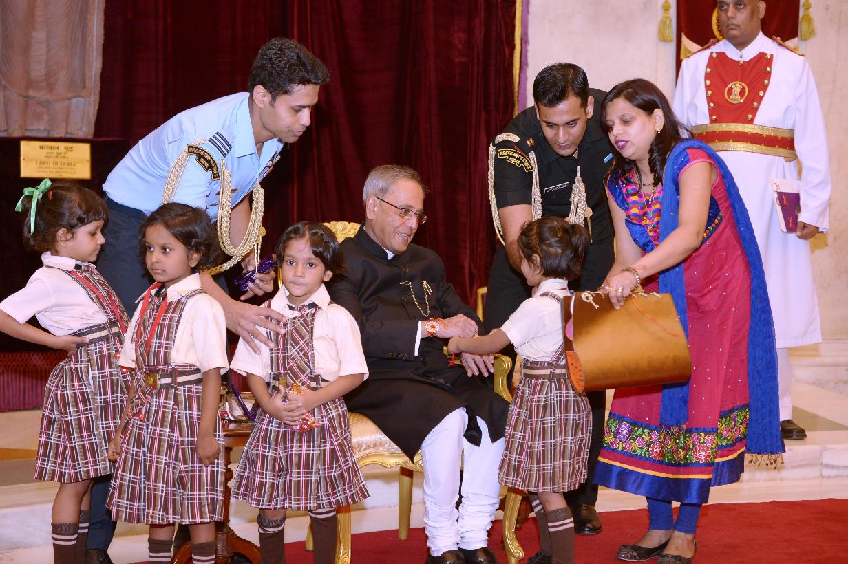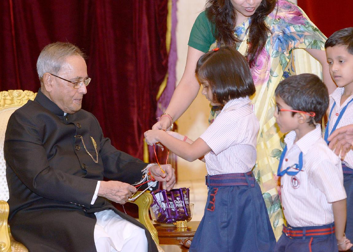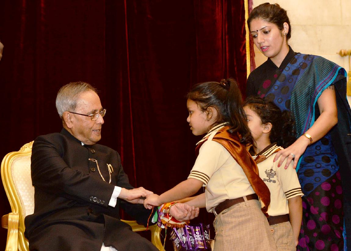 | Caption: | The President of India, Shri Pranab Mukherjee meeting with the Children/Students from Various Organizations/Schools on the Auspicious occasion of Raksha Bandhan at Rashtrapati Bhavan in New Delhi on August 10, 2014 |