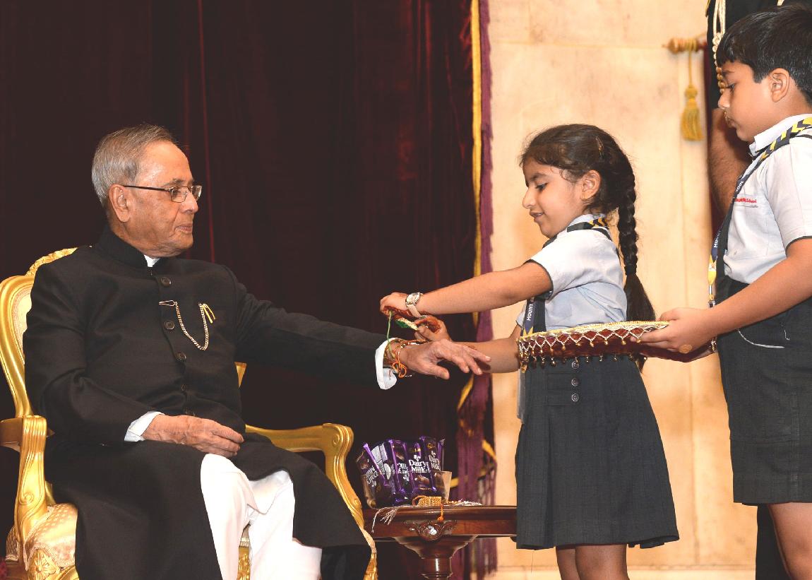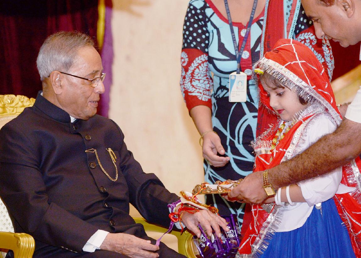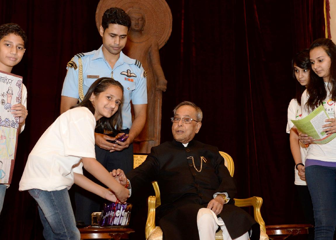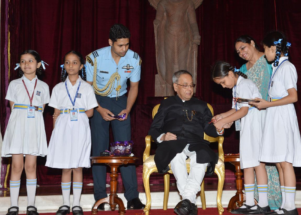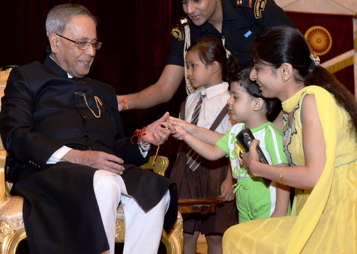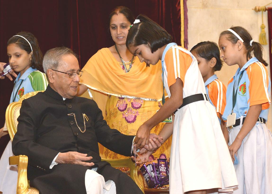 | Caption: | The President of India, Shri Pranab Mukherjee meeting with the Children/Students from Various Organizations/Schools on the Auspicious occasion of Raksha Bandhan at Rashtrapati Bhavan in New Delhi on August 10, 2014 |