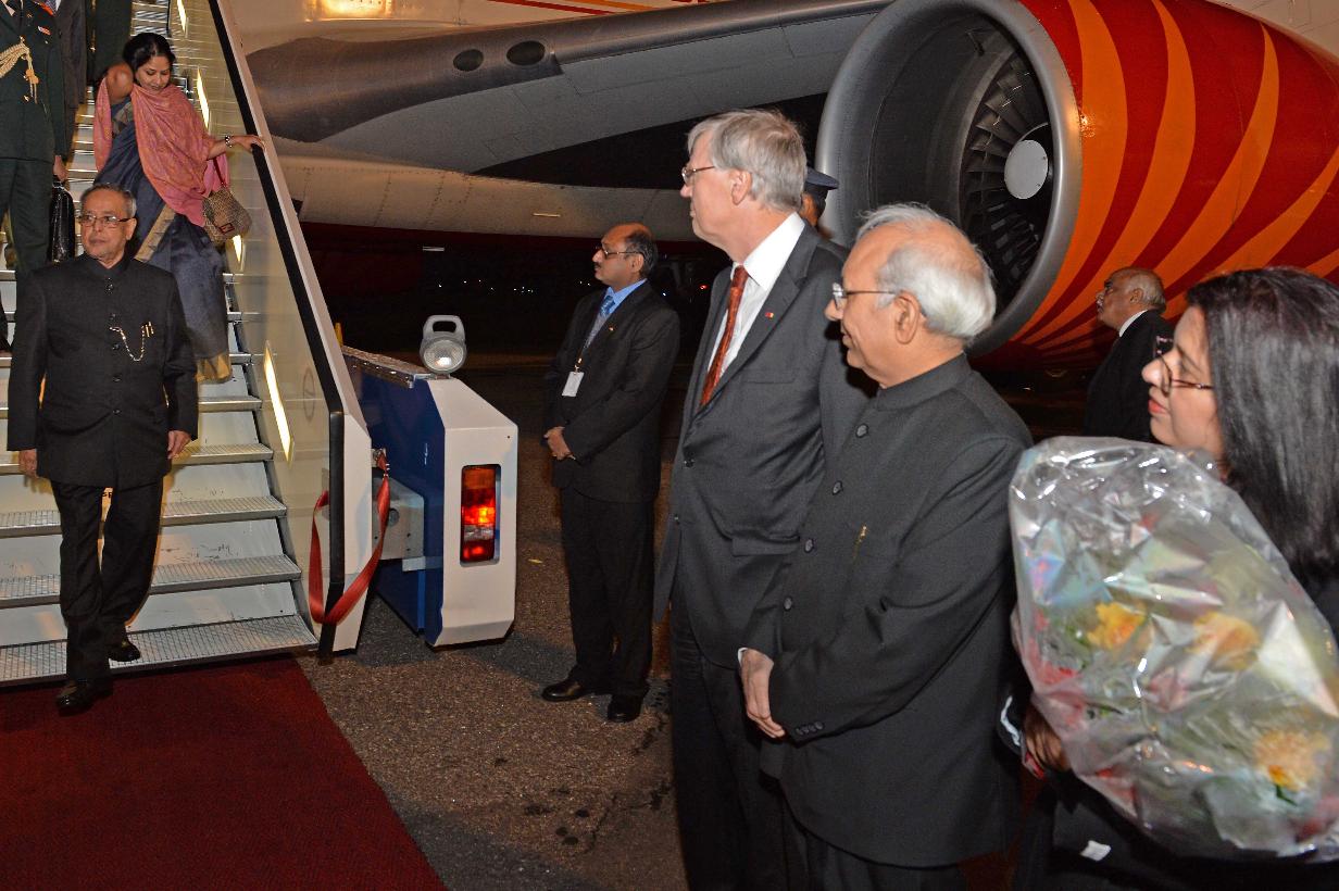 | Caption: | The President of India, Shri Pranab Mukherjee being welcomed by the Government Officials of Finland during his Arrival at Helsinki Airport in Finland on Oct 14, 2014 |
