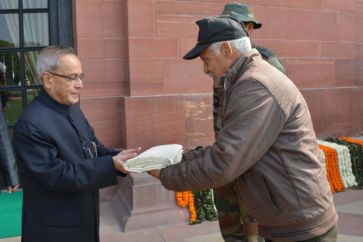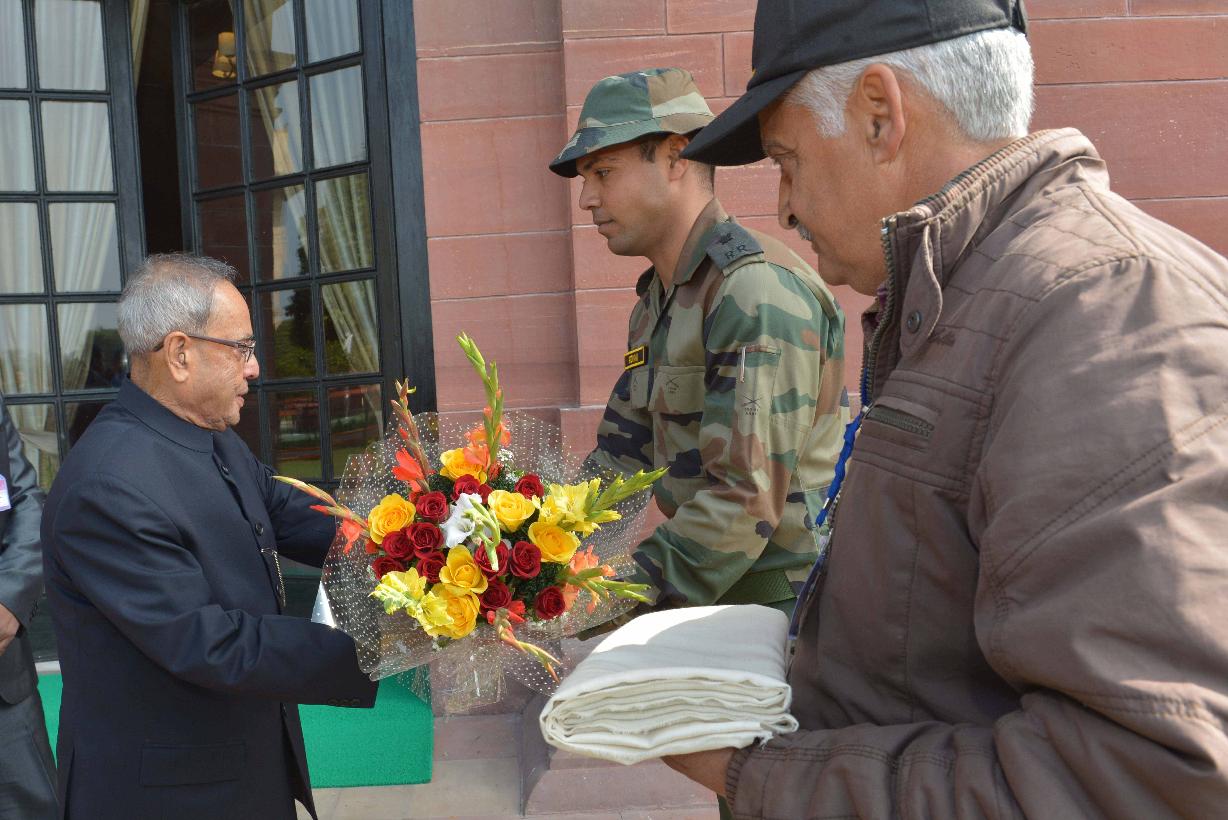 | Caption: | The President of India, Shri Pranab Mukherjee with the Senior Citizens, Sarpanch and Local Leaders from Doda and Kishtwar (Jammu & Kashmir) attending OP Sadbhavana tour organised by 26 Rashtriya Rifles (KUMAON), at Rashtrapati Bhavan, in New Delhi on January 28, 2015. |