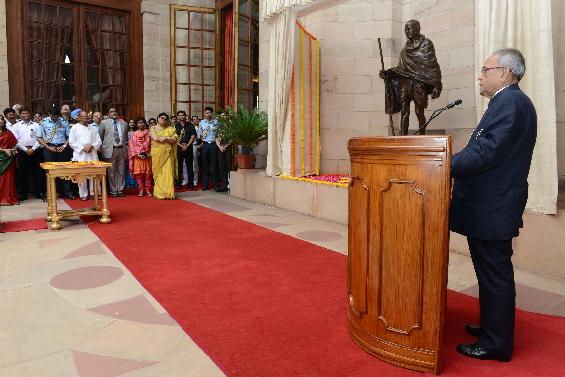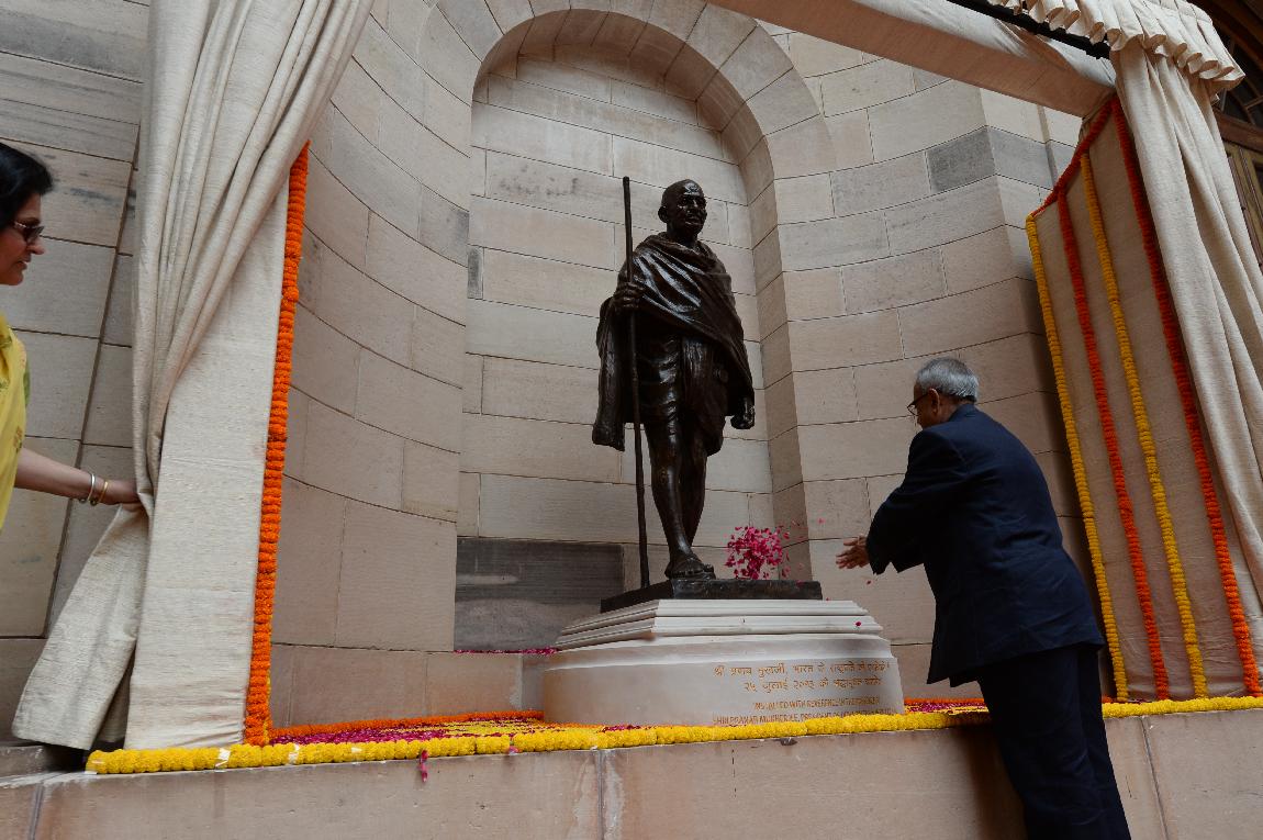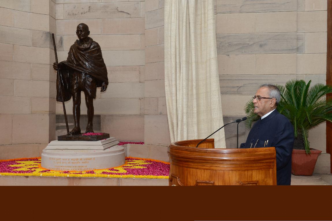 | Caption: | The President of India, Shri Pranab Mukherjee Unveiling the Statue of Mahatma Gandhi at Grand Staircase Rashtrapati Bhavan on July 25, 2013 |