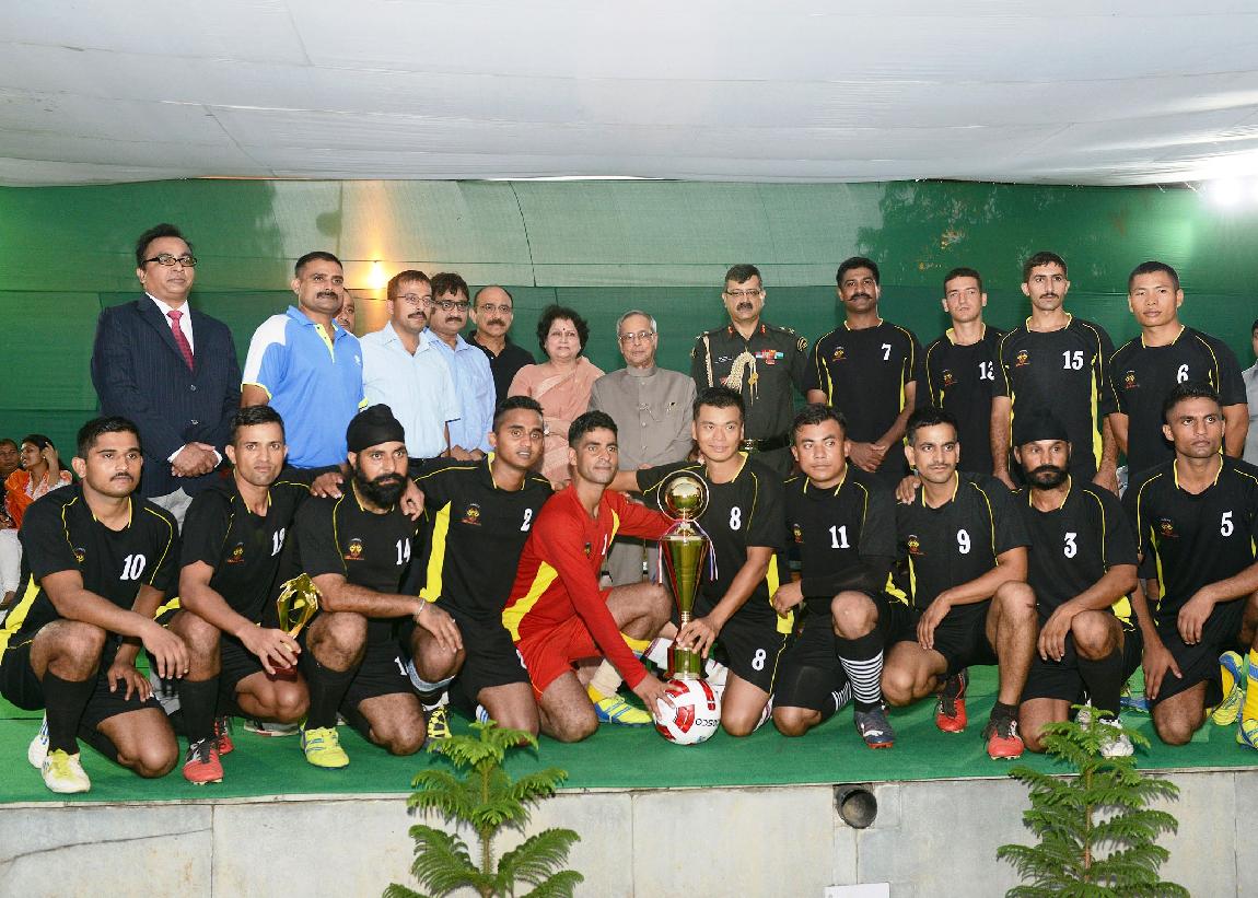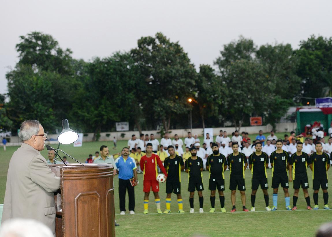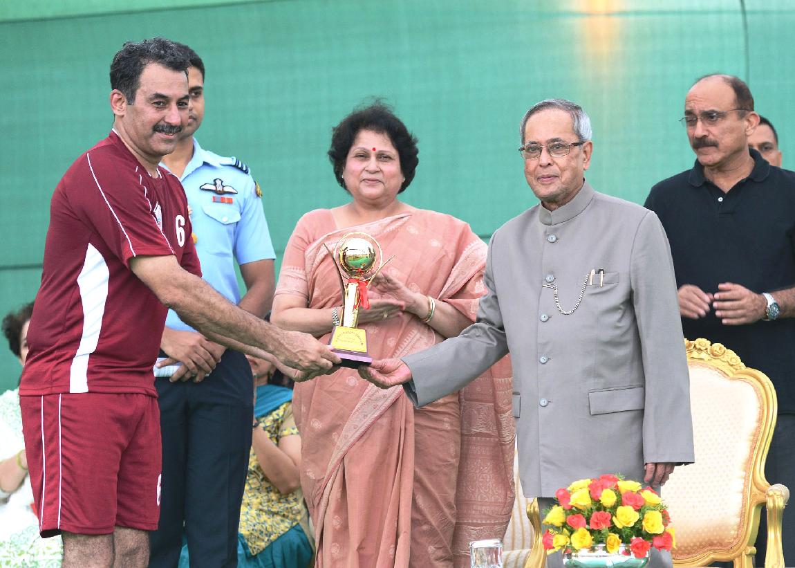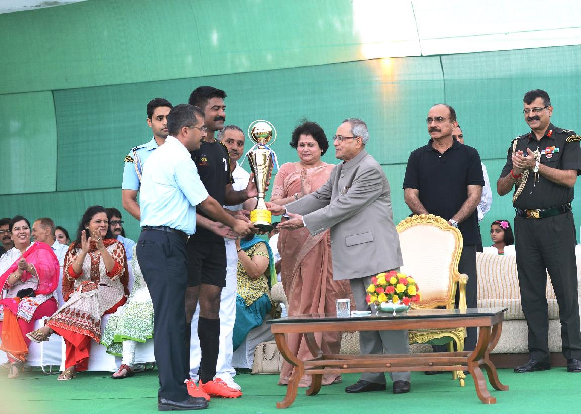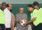 | Caption: | The President of India, Shri Pranab Mukherjee during the Presentation of Prizes after Final Match of Rashtrapati Bhavan Football Tournament (RBFT) at Dr Rajendra Prasad Sarvodaya Vidyalaya, President's Estate in New Delhi on Sep 21, 2014 |