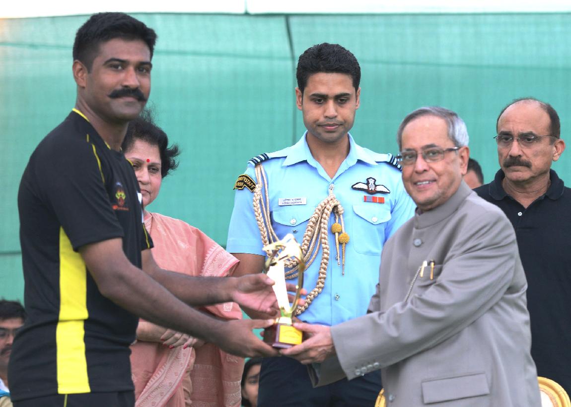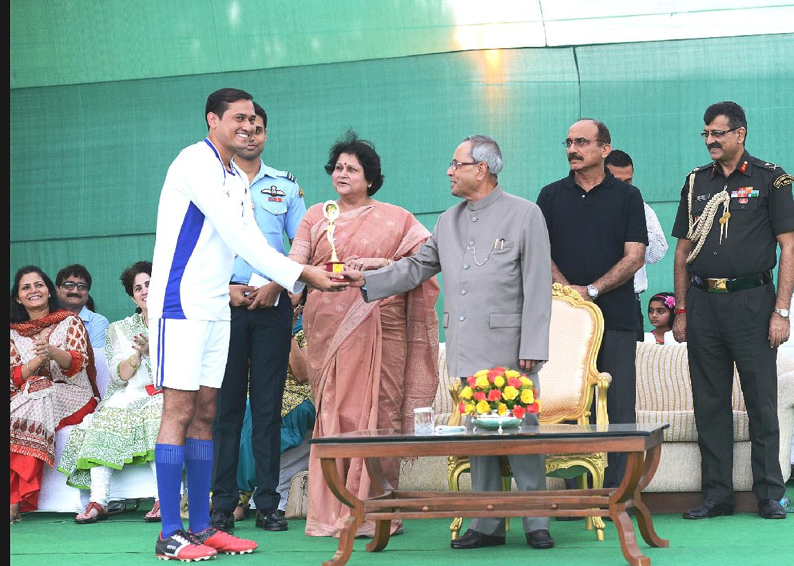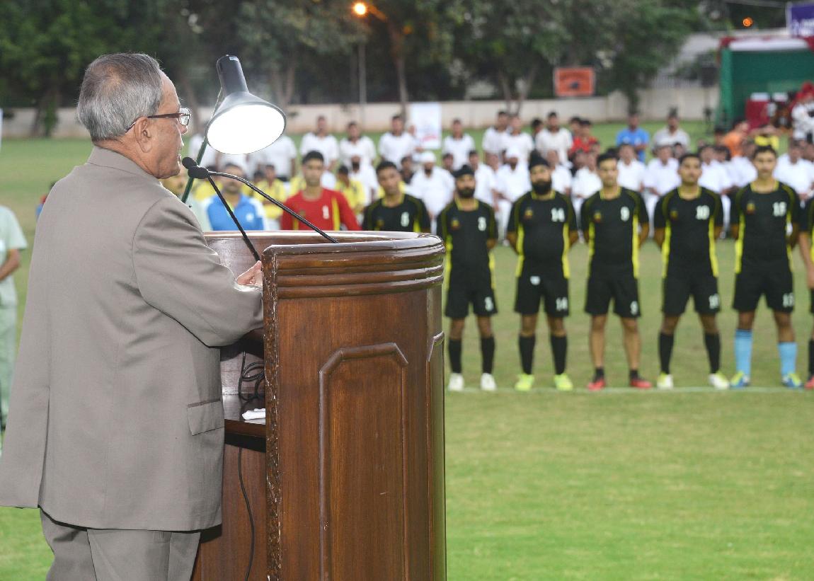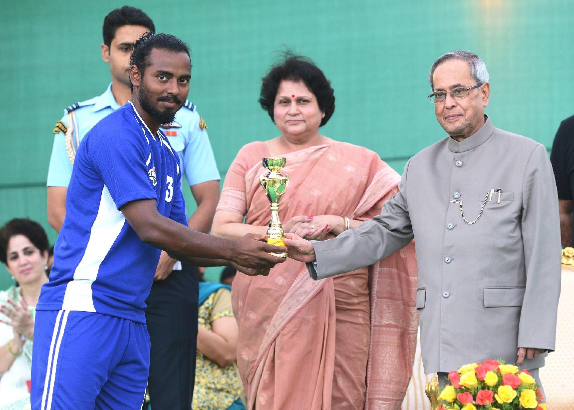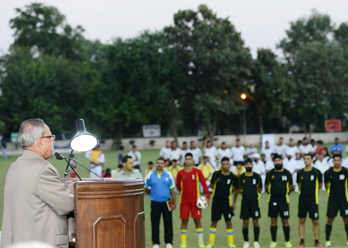 | Caption: | The President of India, Shri Pranab Mukherjee during the Presentation of Prizes after Final Match of Rashtrapati Bhavan Football Tournament (RBFT) at Dr Rajendra Prasad Sarvodaya Vidyalaya, President's Estate in New Delhi on Sep 21, 2014 |