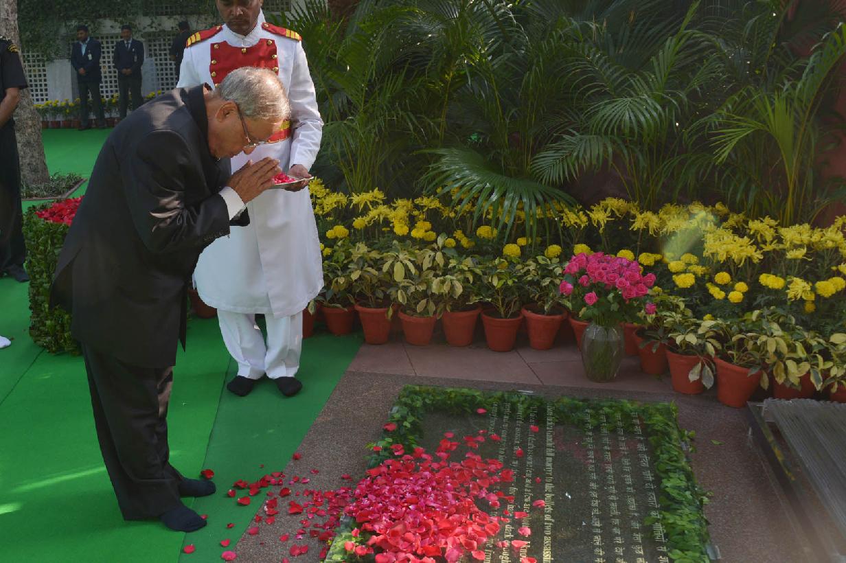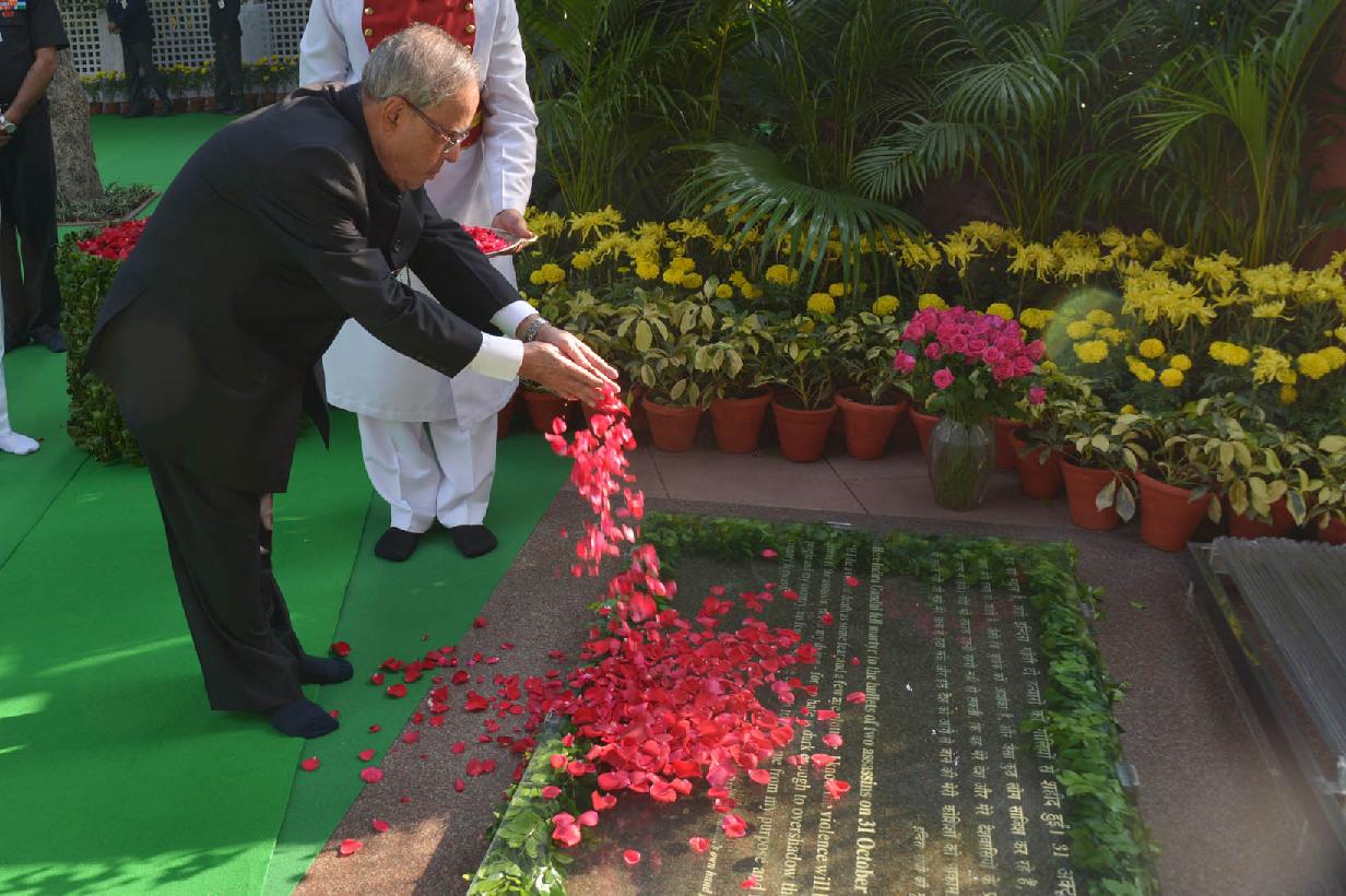 | Caption: | The President of India, Shri Pranab Mukherjee paying floral tributes to the Former Prime Minister of India, Late Smt Indira Gandhi on the occasion of her 97th Birth Anniversary at No 1, Akbar Road in New Delhi on Nov 19, 2014 |