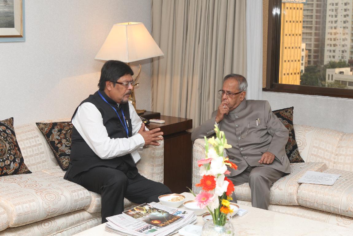 | Caption: | The President of India, Shri Pranab Mukherjee talking to Dr Chandan Mitra on 4 March 2013 |