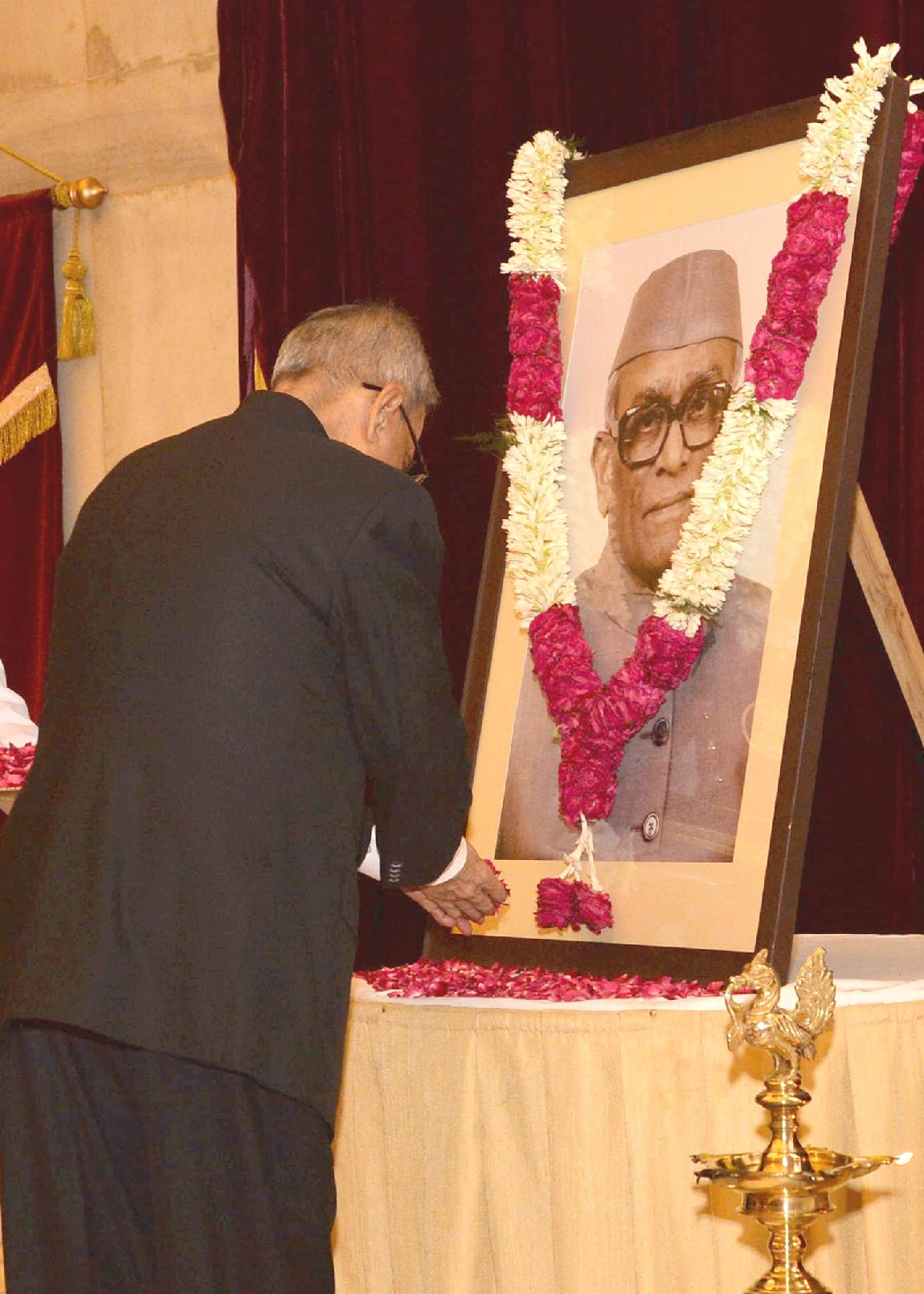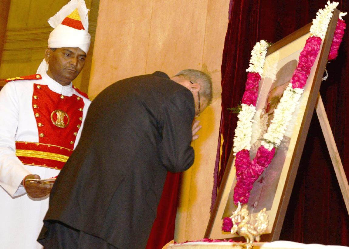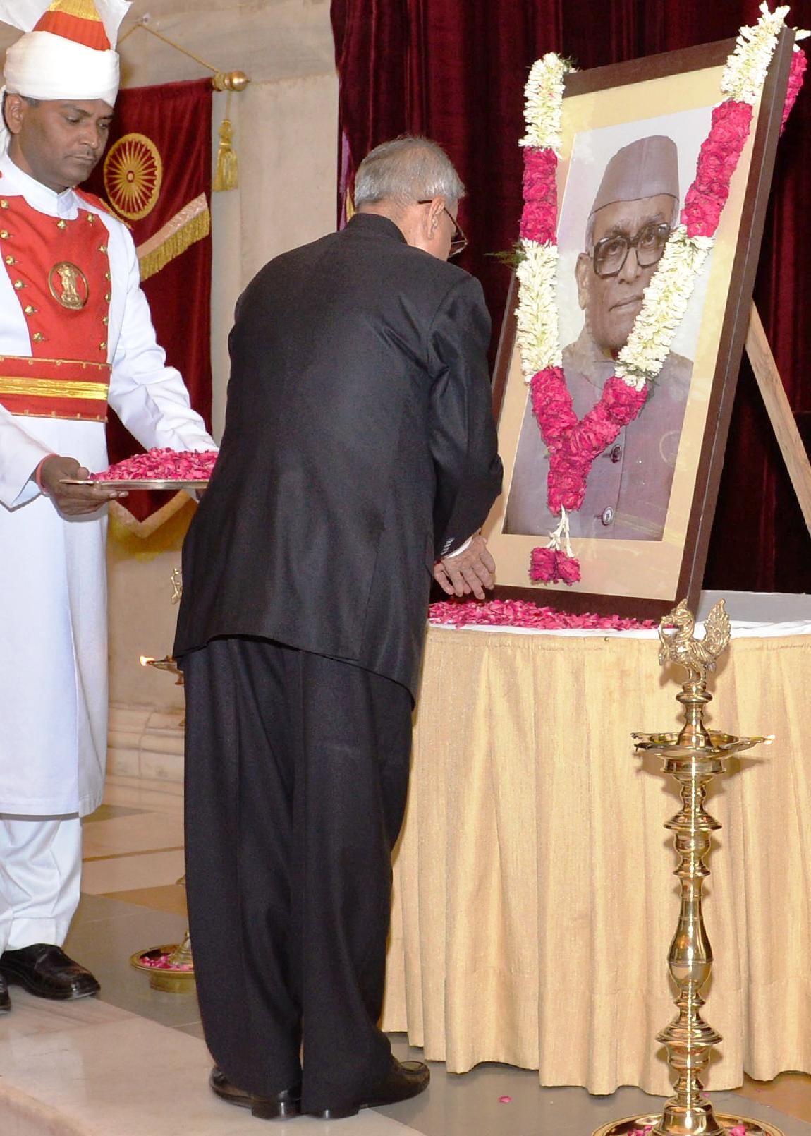 | Caption: | The President of India, Shri Pranab Mukherjee paying floral tribute at the Portrait of the Former President of India, Late Shri Neelam Sanjiva Reddy on the occasion of his Birth Anniversary at Rashtrapati Bhavan in New Delhi on May 19, 2014 |