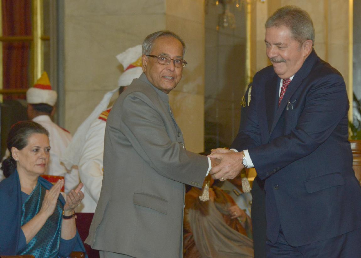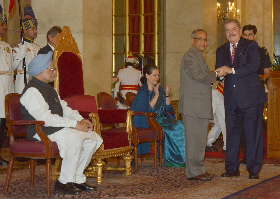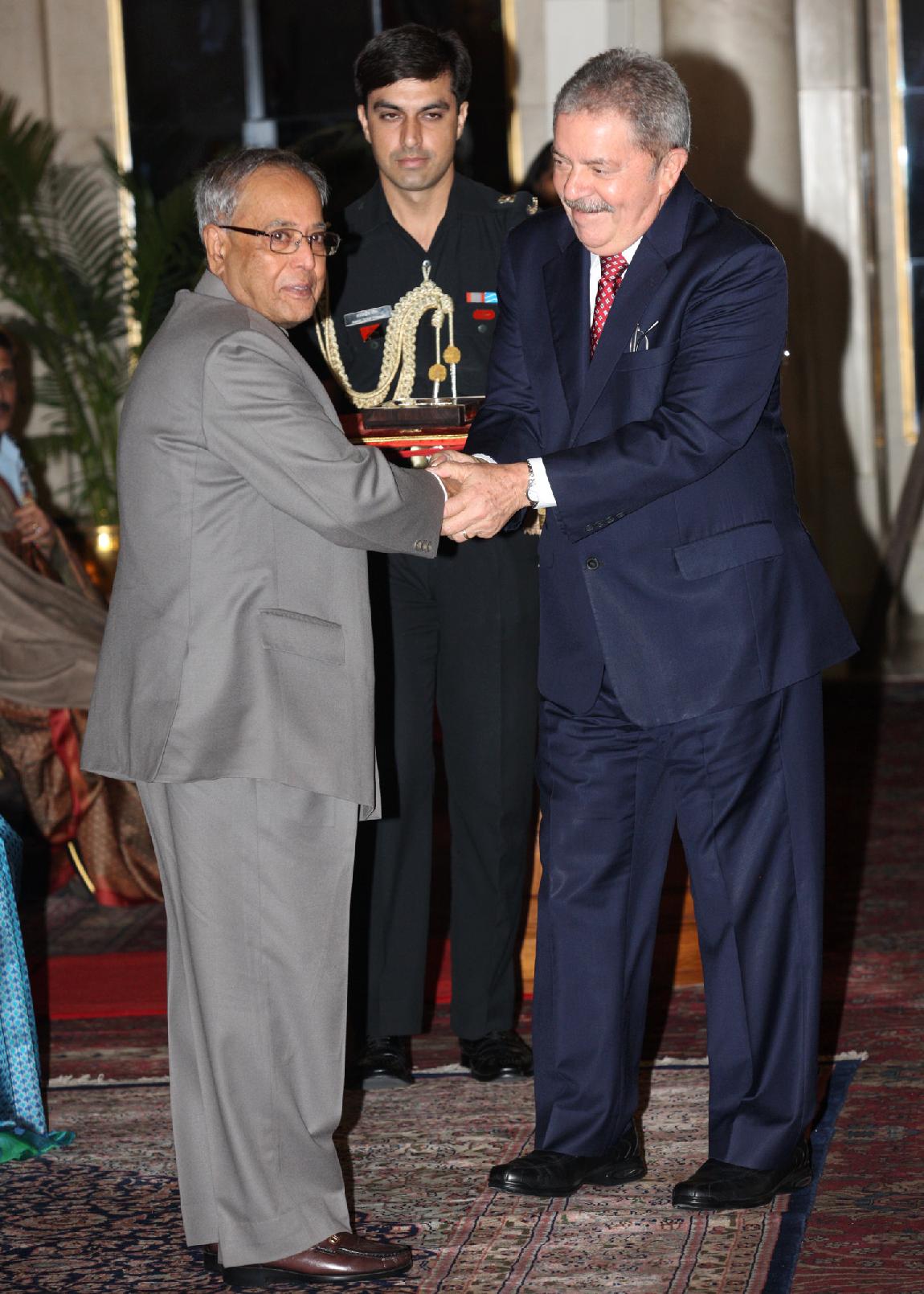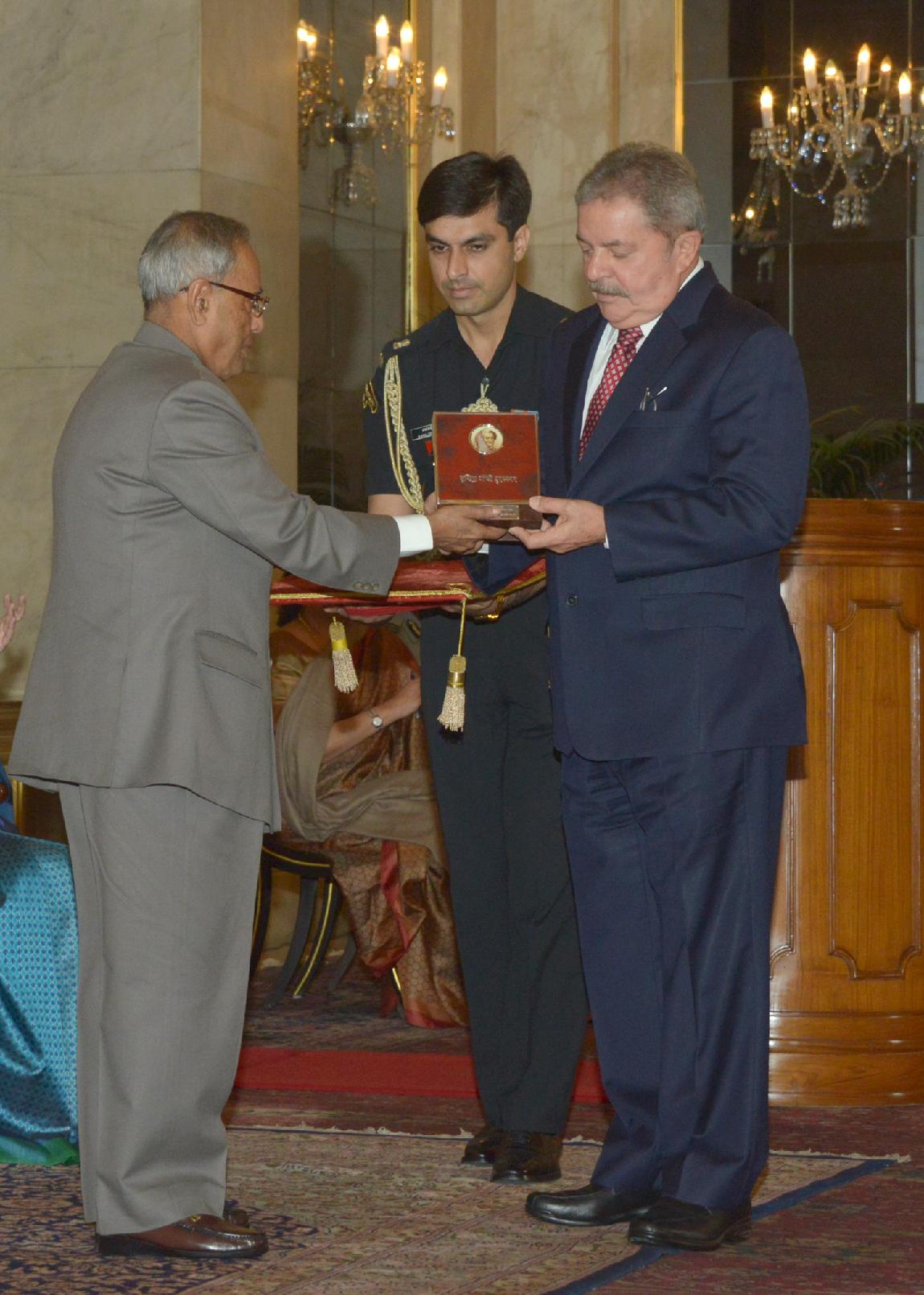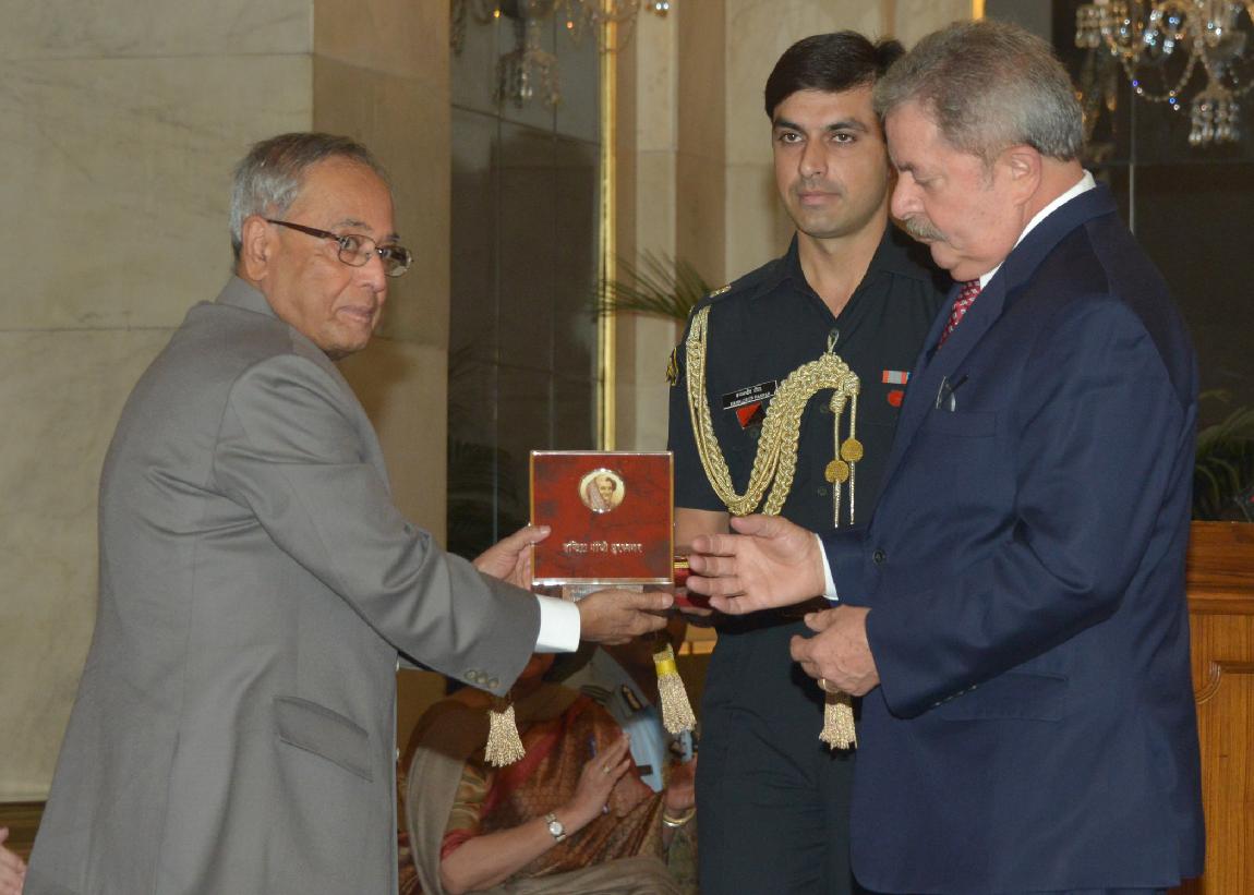 | Caption: | The President of India, Shri Pranab Mukherjee Presenting the Indira Gandhi Prize for Peace, Disarmament and Development to the former President of the Federative Republic of Brazil, H.E. Mr. Luiz Inacio Lula da Silva at Rashtrapati Bhavan in Delhi on Nov 22, 2012 |