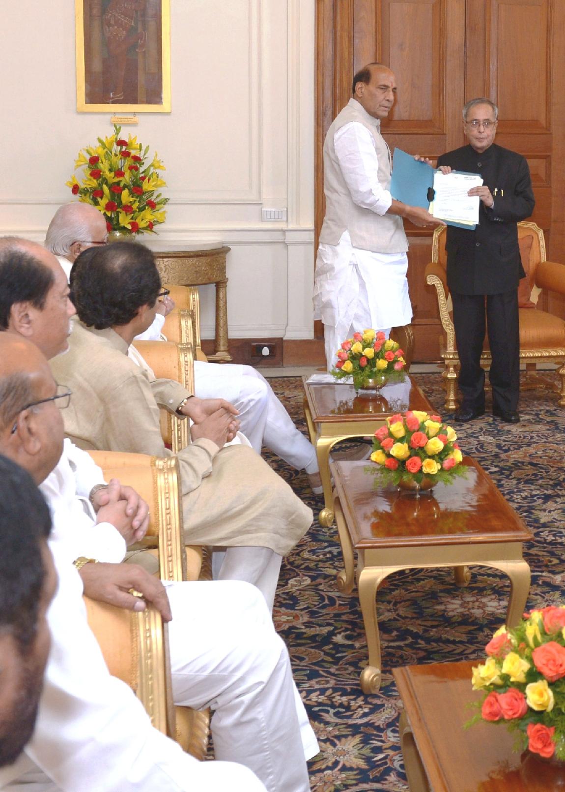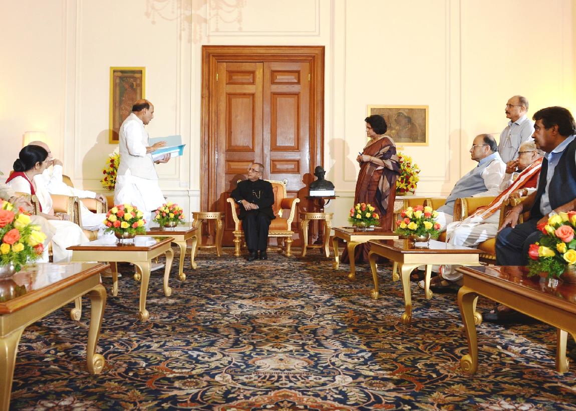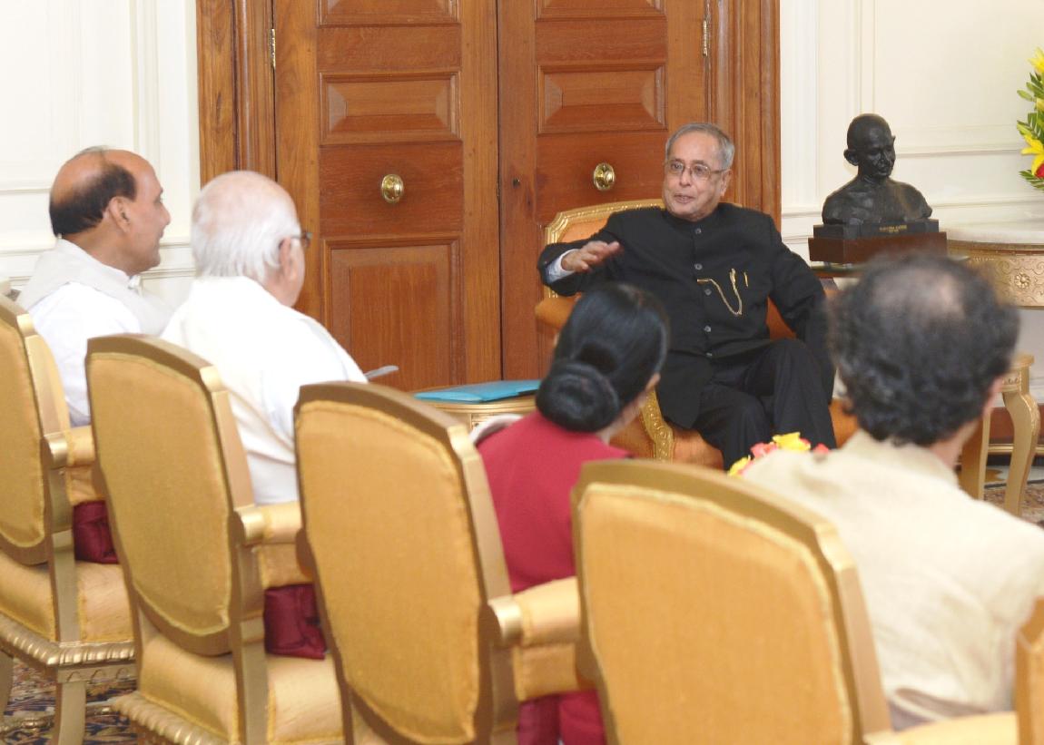 | Caption: | The President of India, Shri Pranab Mukherjee meeting with the Leaders of National Democratic Alliance (NDA) led by the President of the Bharatiya Janata Party, Shri Rajnath Singh at Rashtrapati Bhavan in New Delhi on May 20, 2014 |