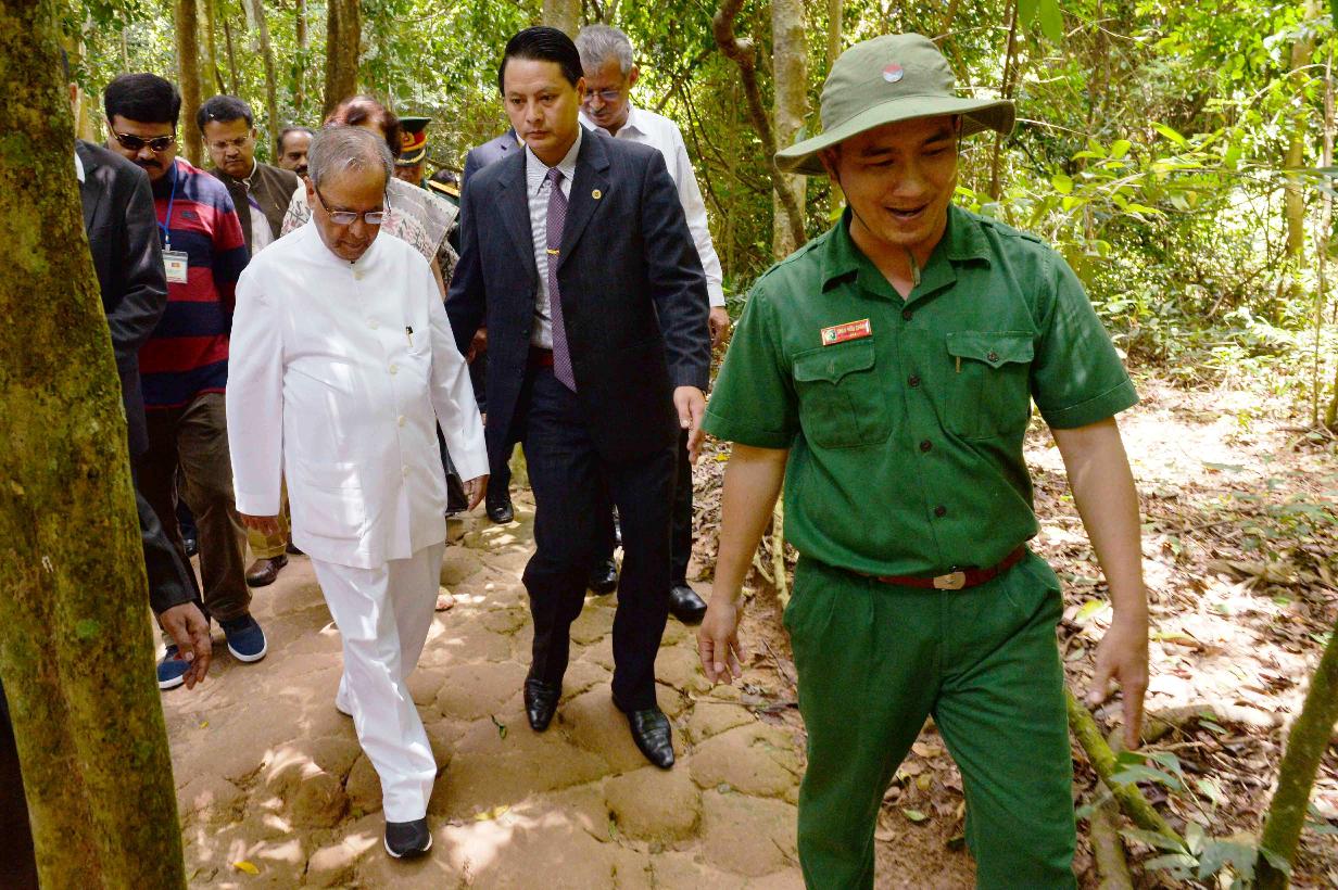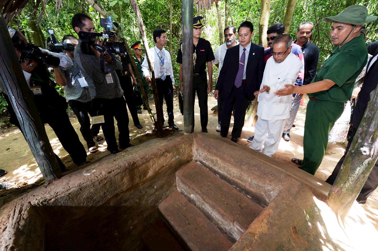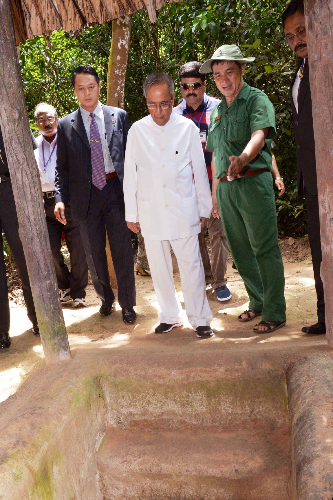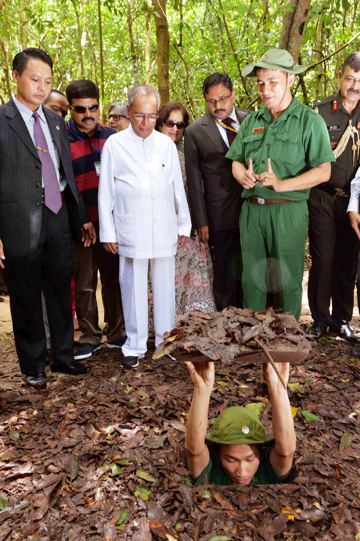 | Caption: | The President of India, Shri Pranab Mukherjee visiting the Cu Chi Tunnels in Vietnam on Sep 17, 2014 |